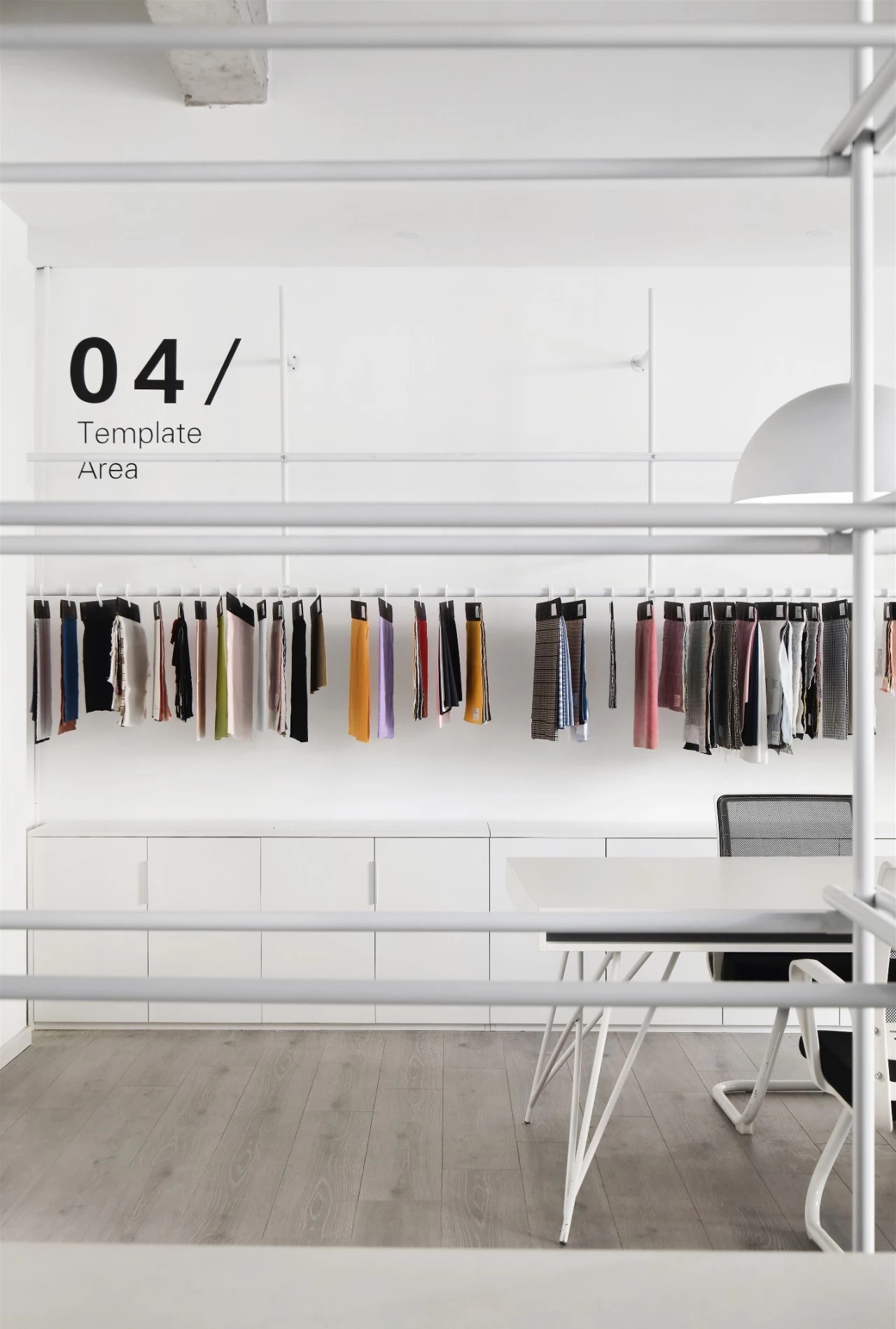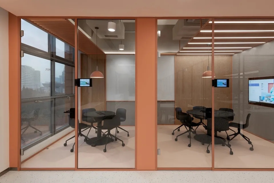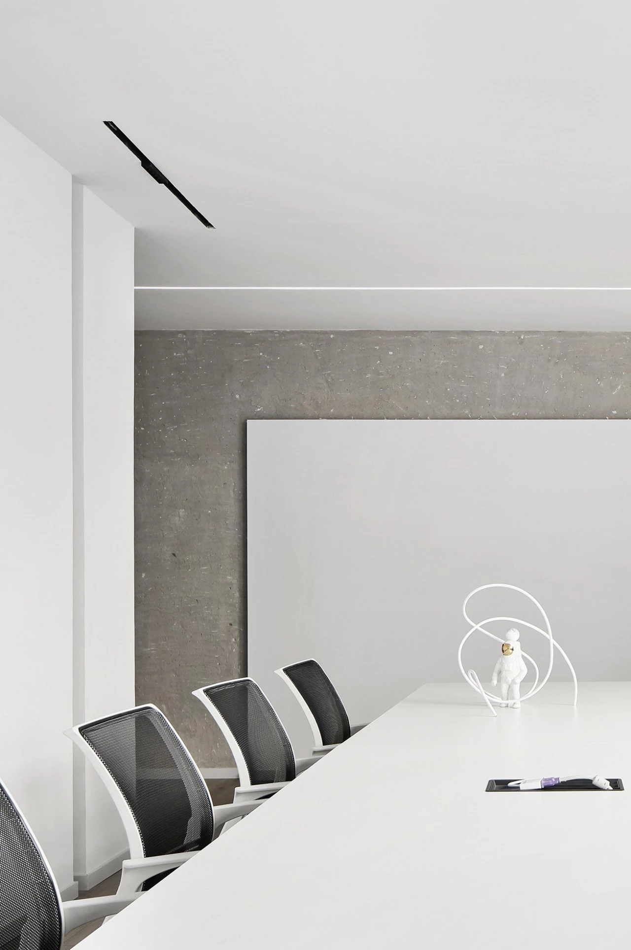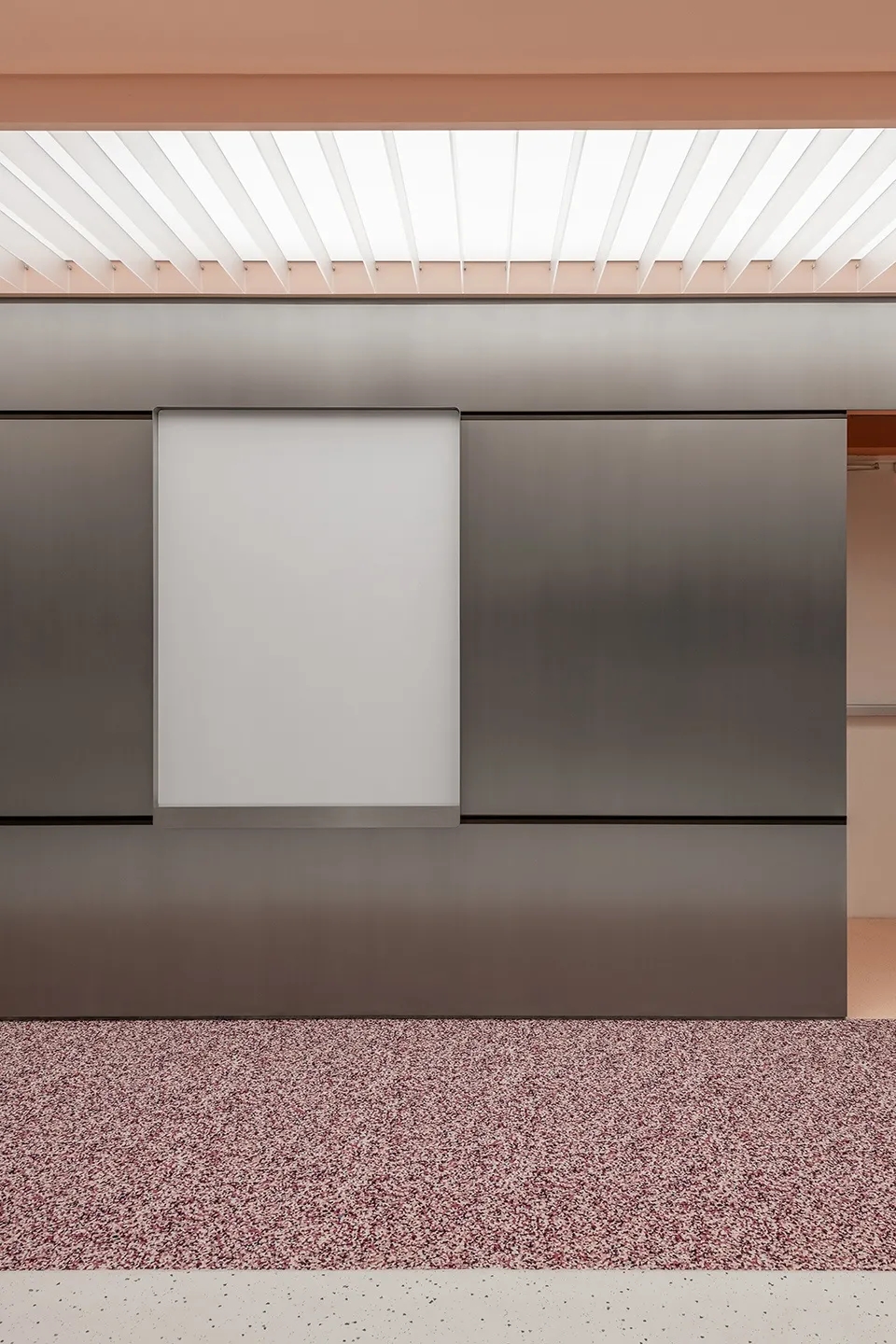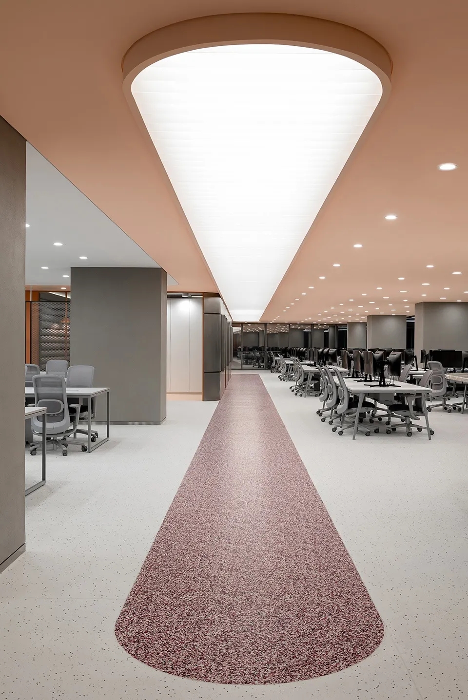 设计了一个中央步道,实现迎宾与引导视线沿空间延伸的双重功能。天花为长条形张拉膜光幕,外饰一层玻璃格栅,与之相对的是深红色的椭圆形乙烯基地面装饰。拉丝不锈钢墙板外部嵌有滑动式白板和留言板,便于办公过程中的协同合作。