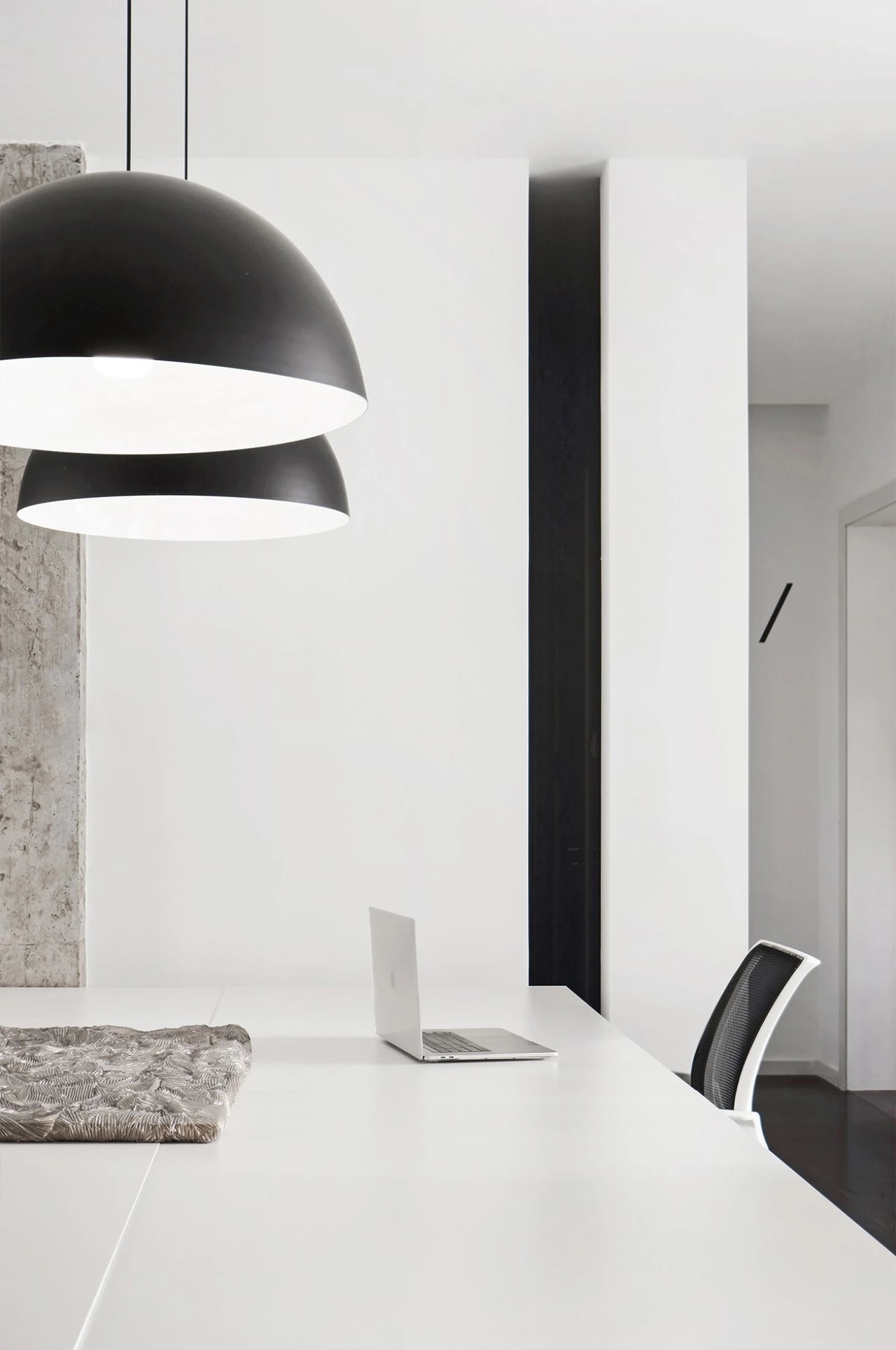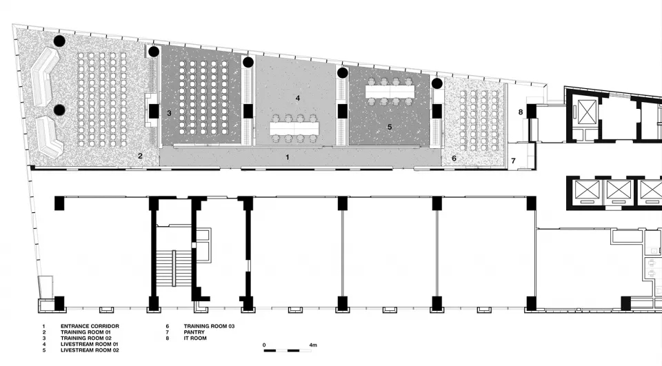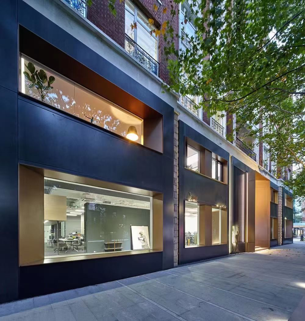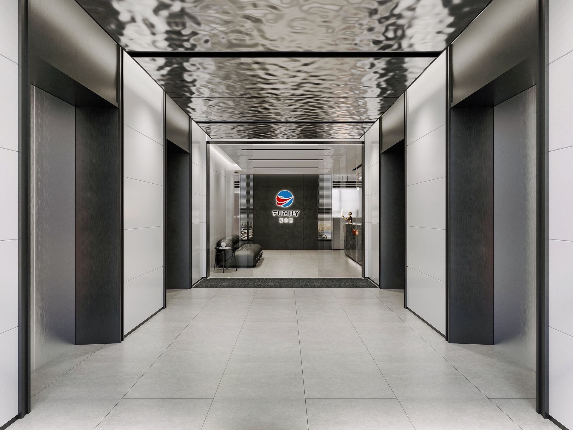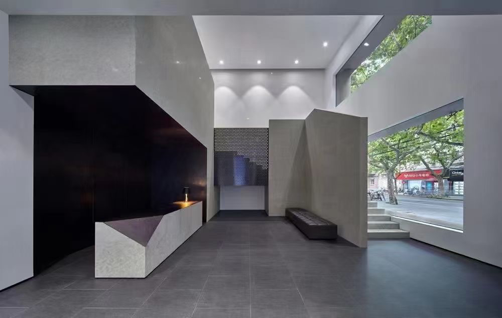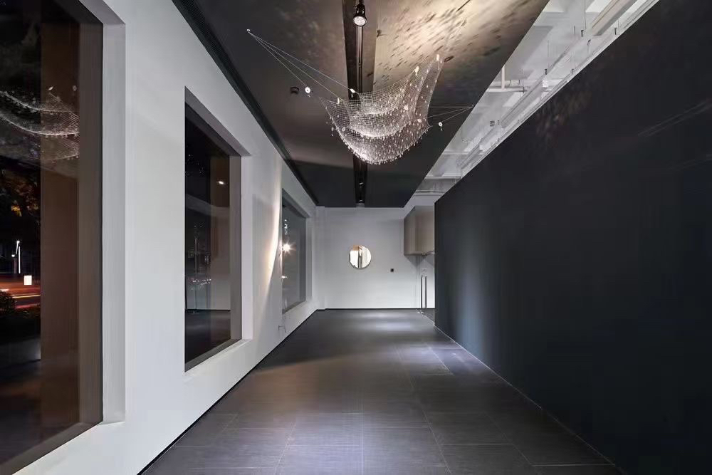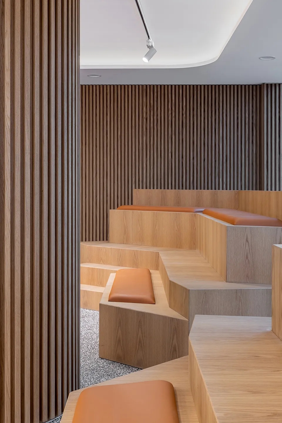 设计了一个中央步道,实现迎宾与引导视线沿空间延伸的双重功能。天花为长条形张拉膜光幕,外饰一层玻璃格栅,与之相对的是深红色的椭圆形乙烯基地面装饰。拉丝不锈钢墙板外部嵌有滑动式白板和留言板,便于办公过程中的协同合作。