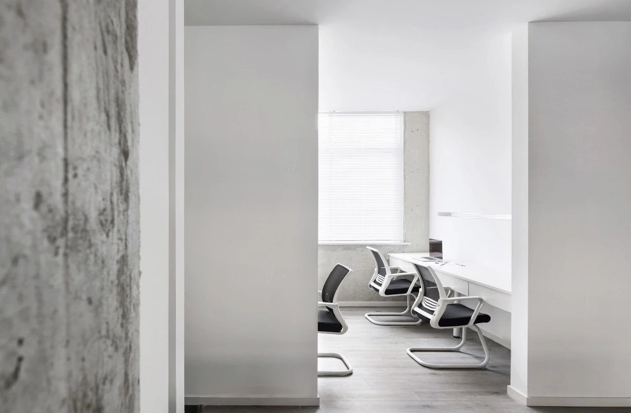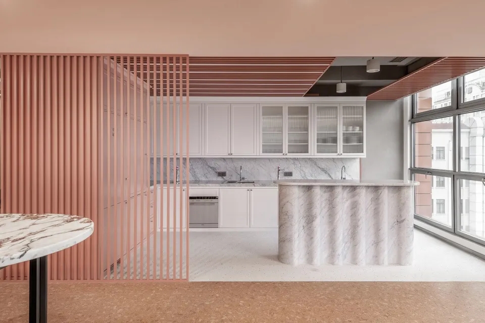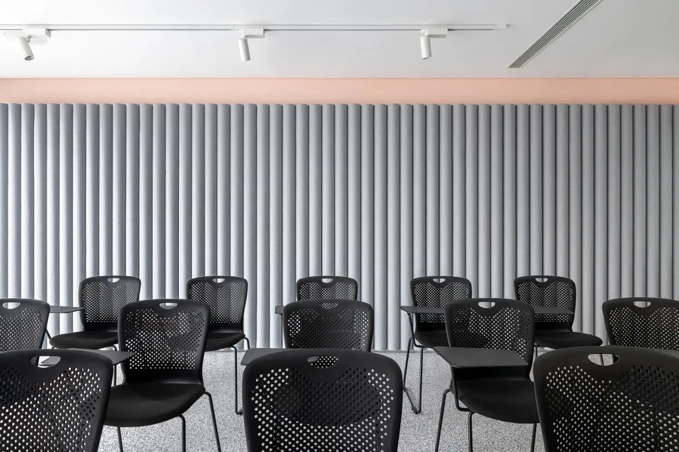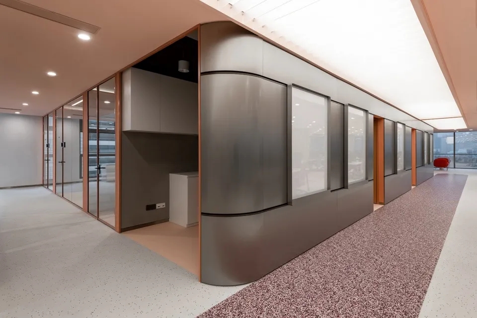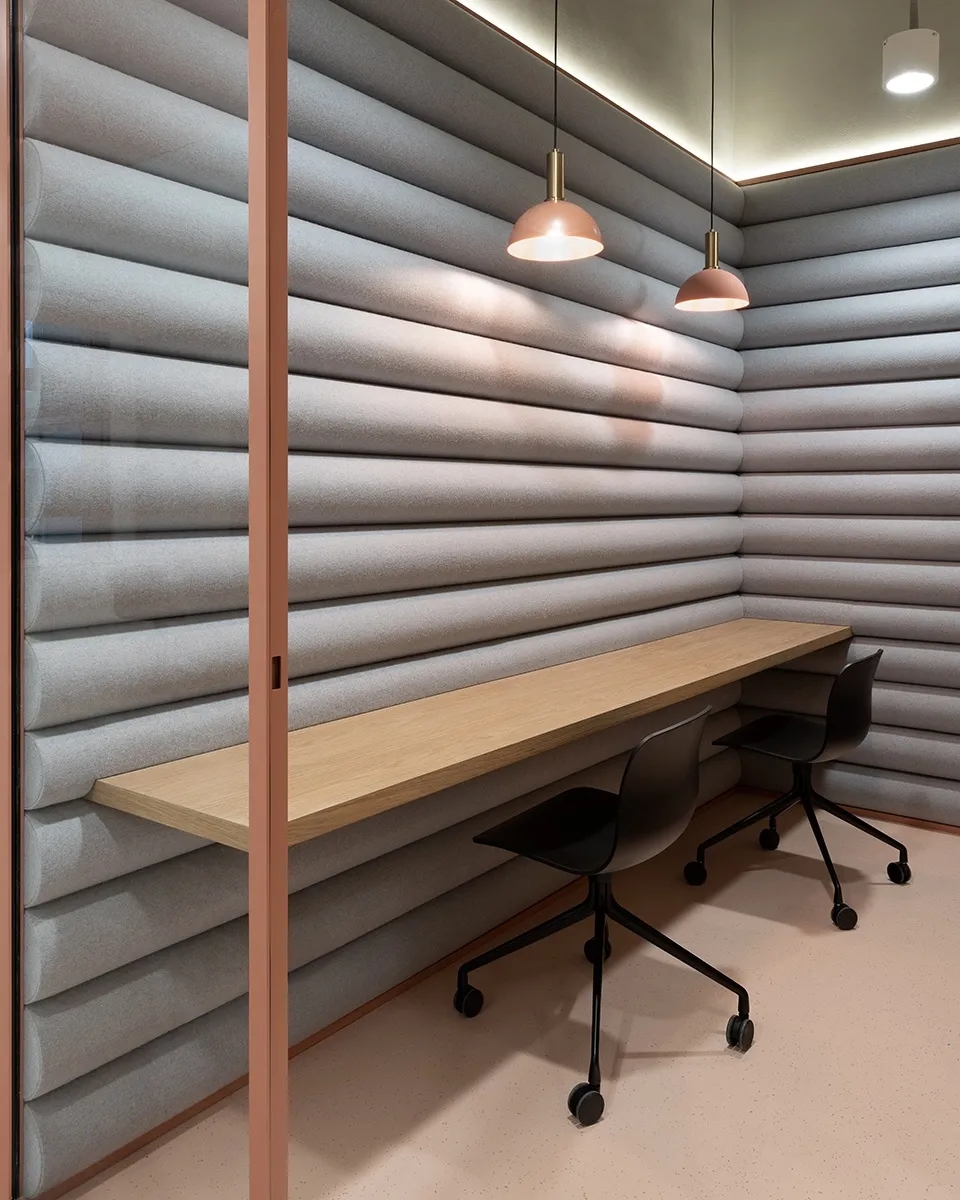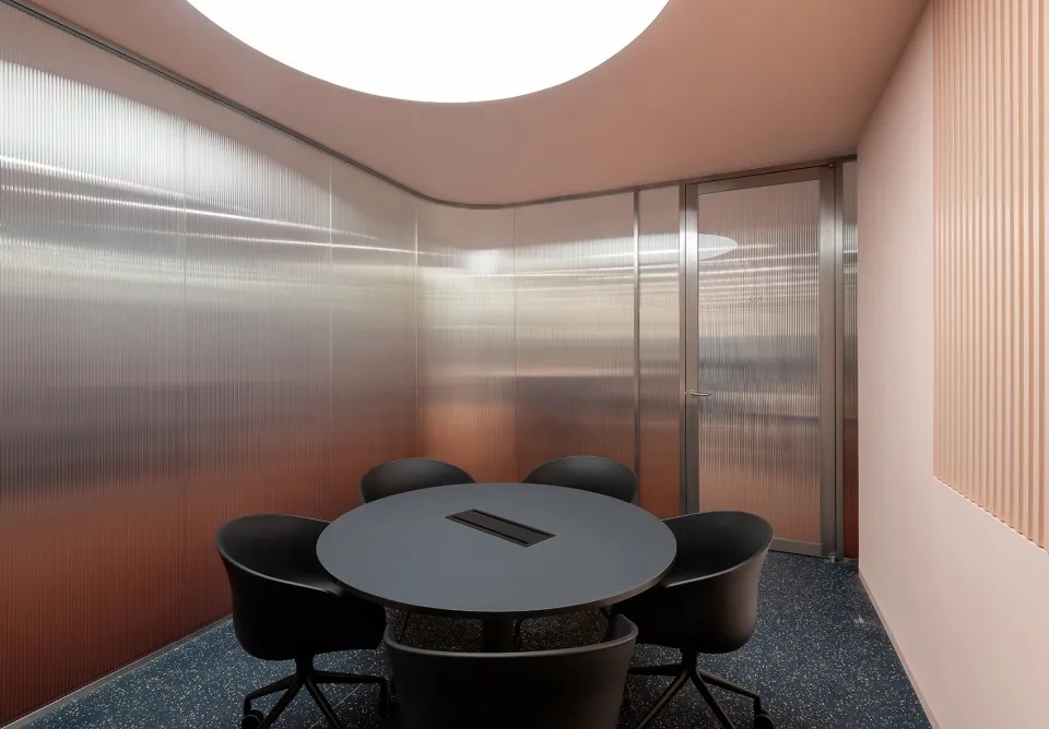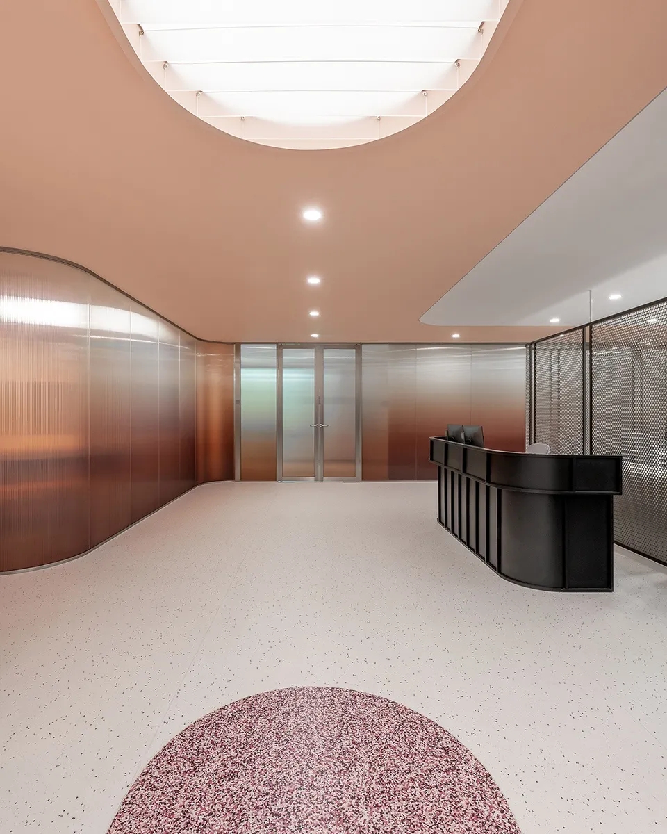 进门处和前台旁的三间会客室均使用了渐变色长虹玻璃,颜色由粉色向透明过渡。会议室内墙壁是柔粉色,嵌有不对称装饰面板,天花采用椭圆形透光膜照明,地面则为深蓝色Tarkett得嘉地板。会客区与办公区由弧形黑框不锈钢穿孔板屏风隔开。屏风上的镂空图案尺寸自下而上的渐变设计,在保护隐私的同时确保视平线内视野的开阔。