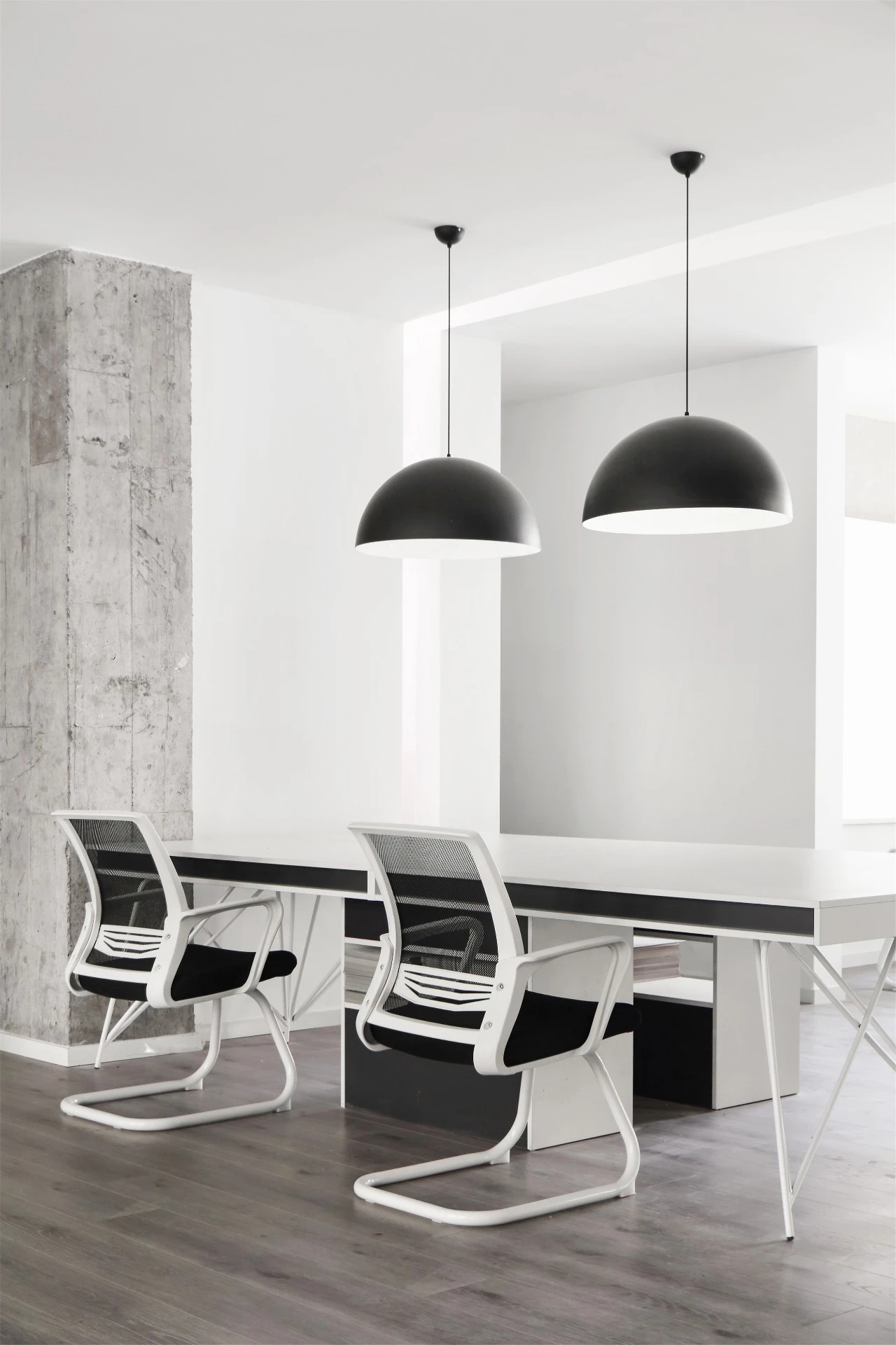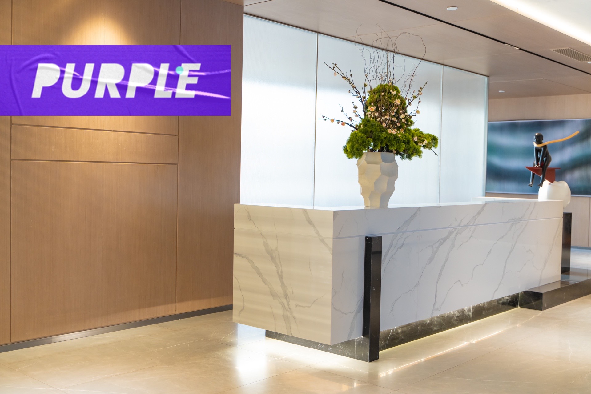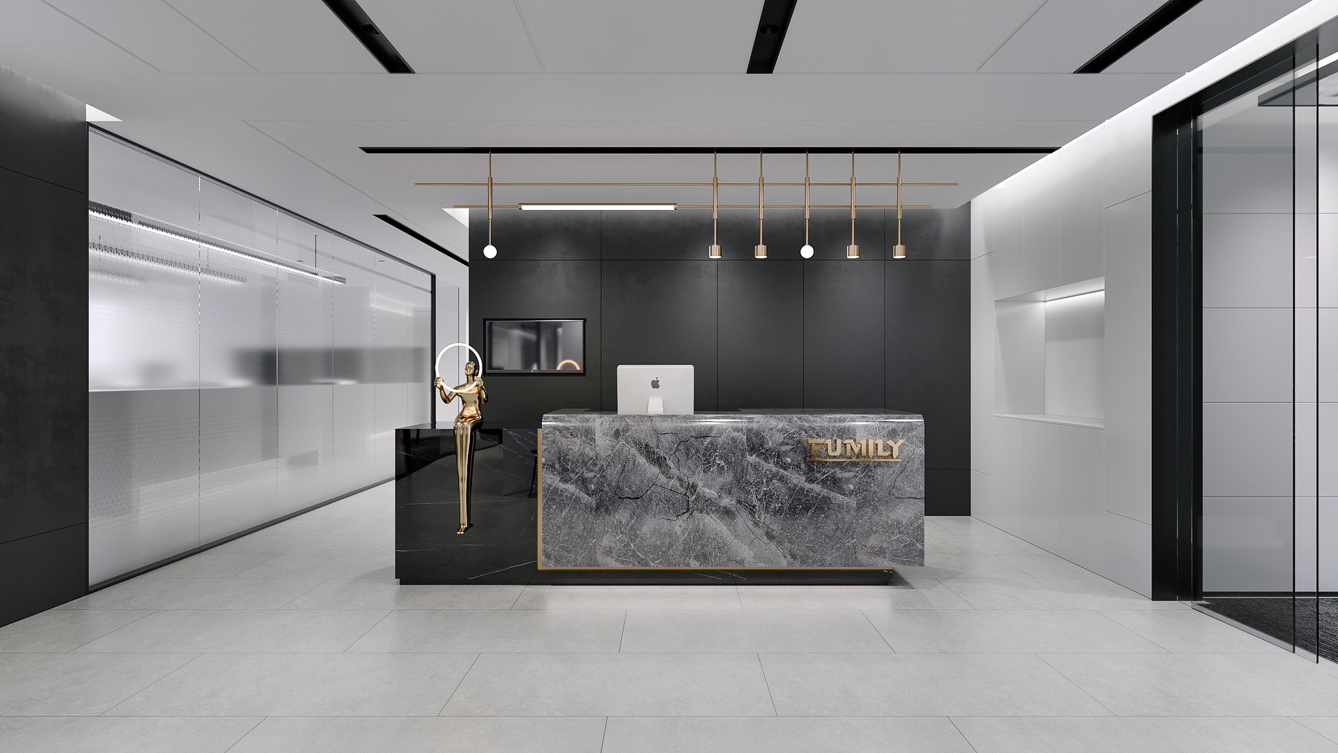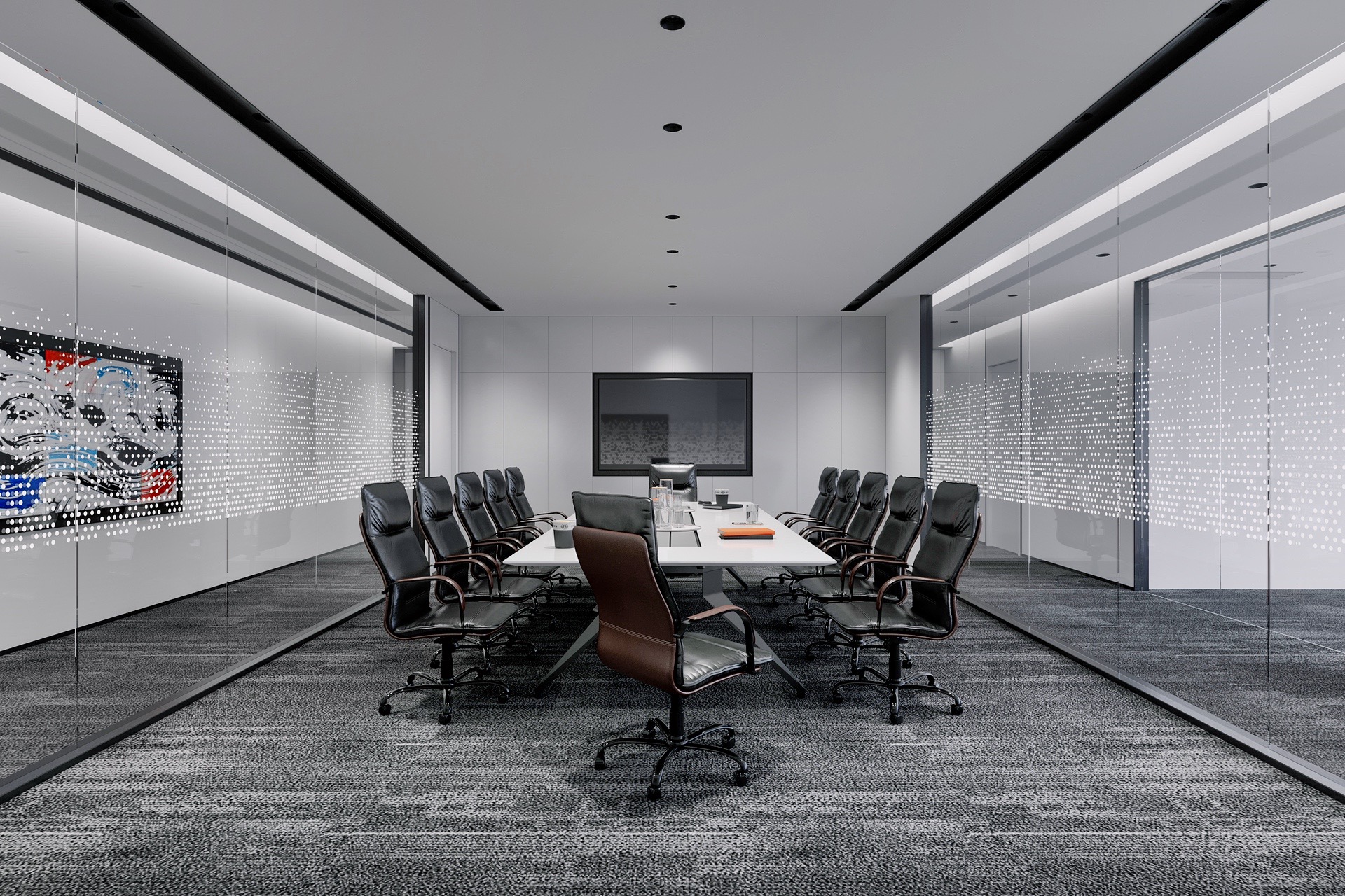 进门处和前台旁的三间会客室均使用了渐变色长虹玻璃,颜色由粉色向透明过渡。会议室内墙壁是柔粉色,嵌有不对称装饰面板,天花采用椭圆形透光膜照明,地面则为深蓝色Tarkett得嘉地板。会客区与办公区由弧形黑框不锈钢穿孔板屏风隔开。屏风上的镂空图案尺寸自下而上的渐变设计,在保护隐私的同时确保视平线内视野的开阔。
