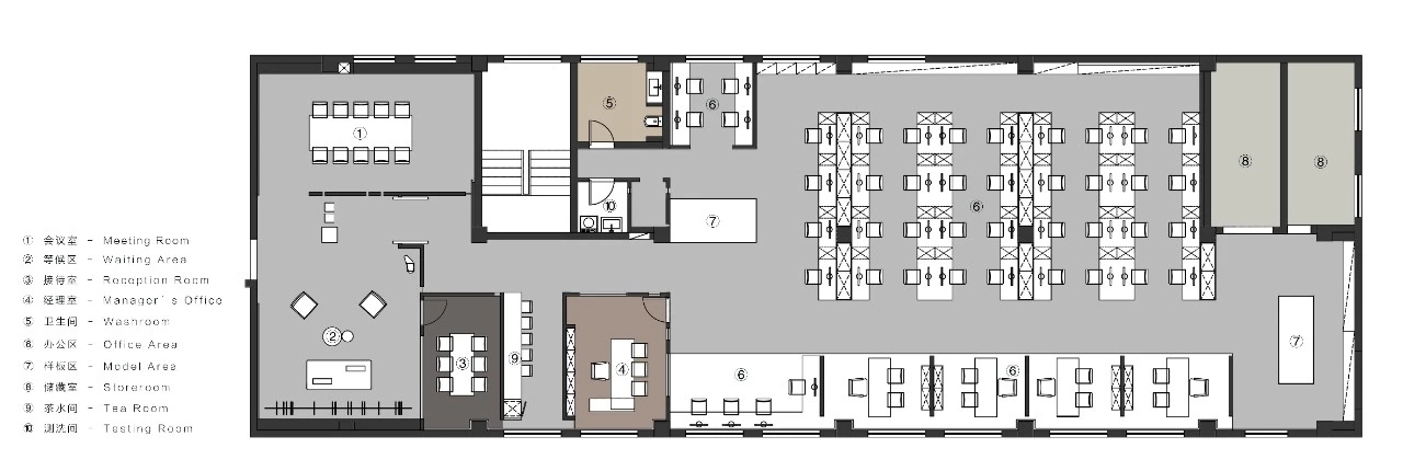 区别于传统的以部门为核心的办公室布局结构,设计师依据专注、社交、接待、协作等工作属性,划分为专注公区、共享工位区,会议室、非正式协作区,休闲社交等区域,力求以灵活化的布局,在有限的物理空间内打造出多层次的办公场景。
