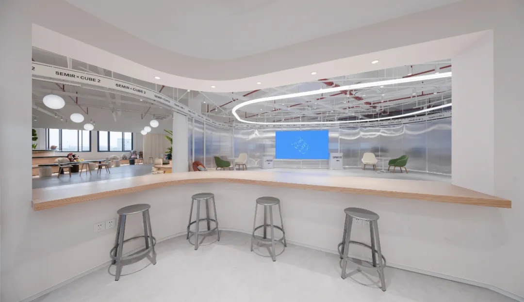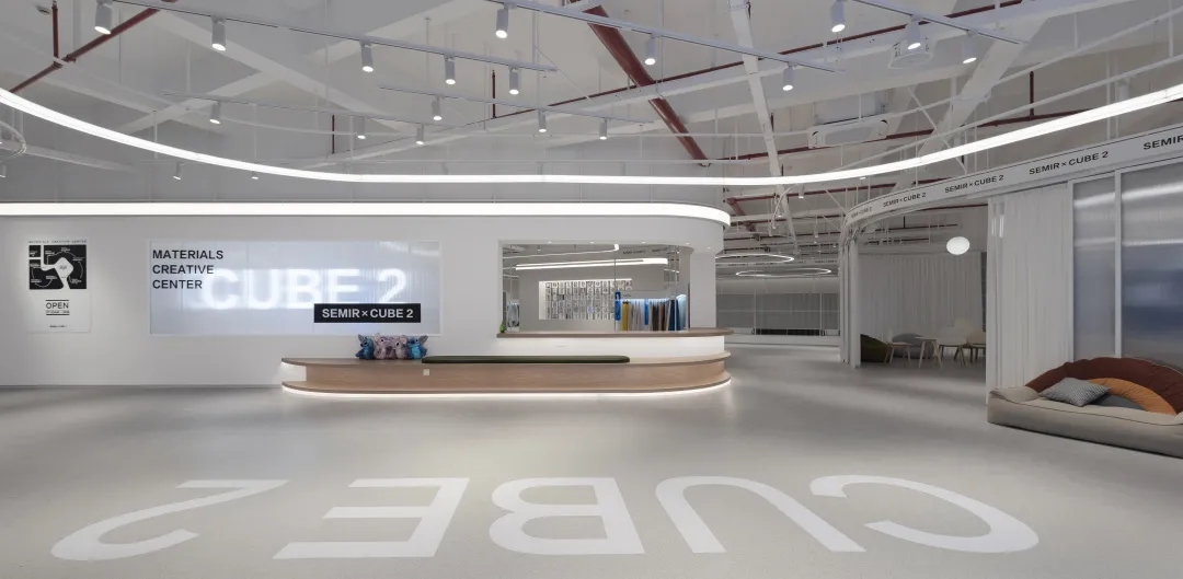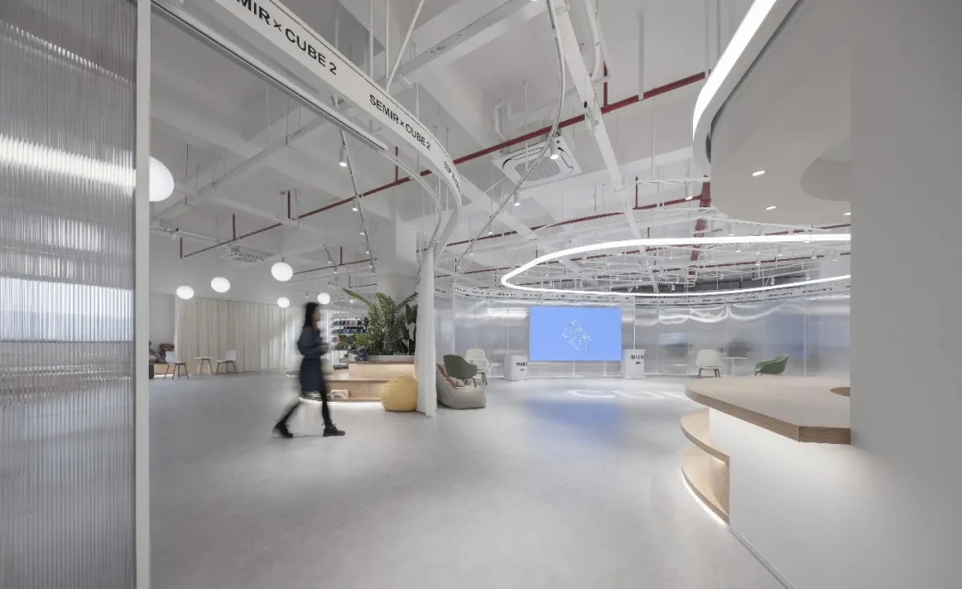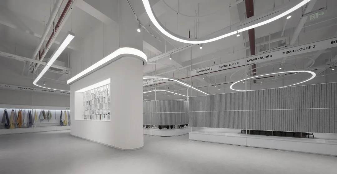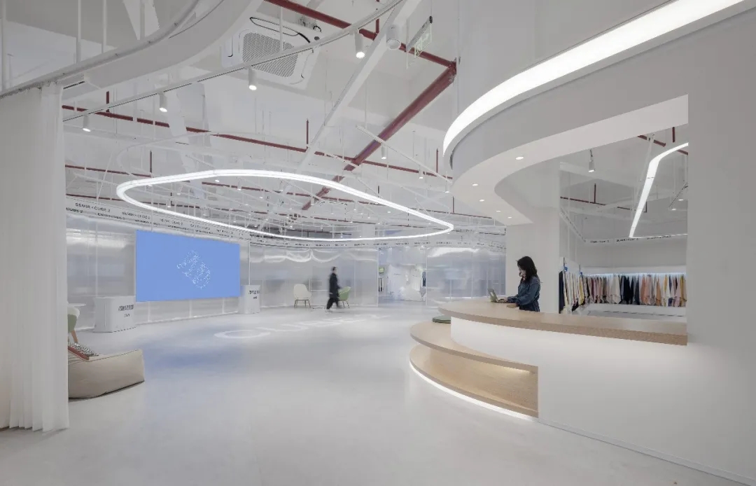 由于空间主要功能用于面料的展示,因此我们在设计中尽可能弱化空间的存在感,采用大面积的白色肌理漆和海灰色地坪塑造纯粹的空间基底,没有丝毫喧宾夺主的意味,让服装面料成为空间的主角。9mm厚度的聚碳酸酯曲面隔断在内置灯带的作用下创造了朦胧的透光感和科技感,是营造空间氛围的一大“功臣”。由于曲面的做法在市场上并不普遍,而过于厚的聚碳酸酯又无法表达通透轻盈的感觉,因此,设计团队仔细研究了材料的制作工艺,按照100mm*100mm的模数,每米间距进行钢管固定以提高其硬度和强度。