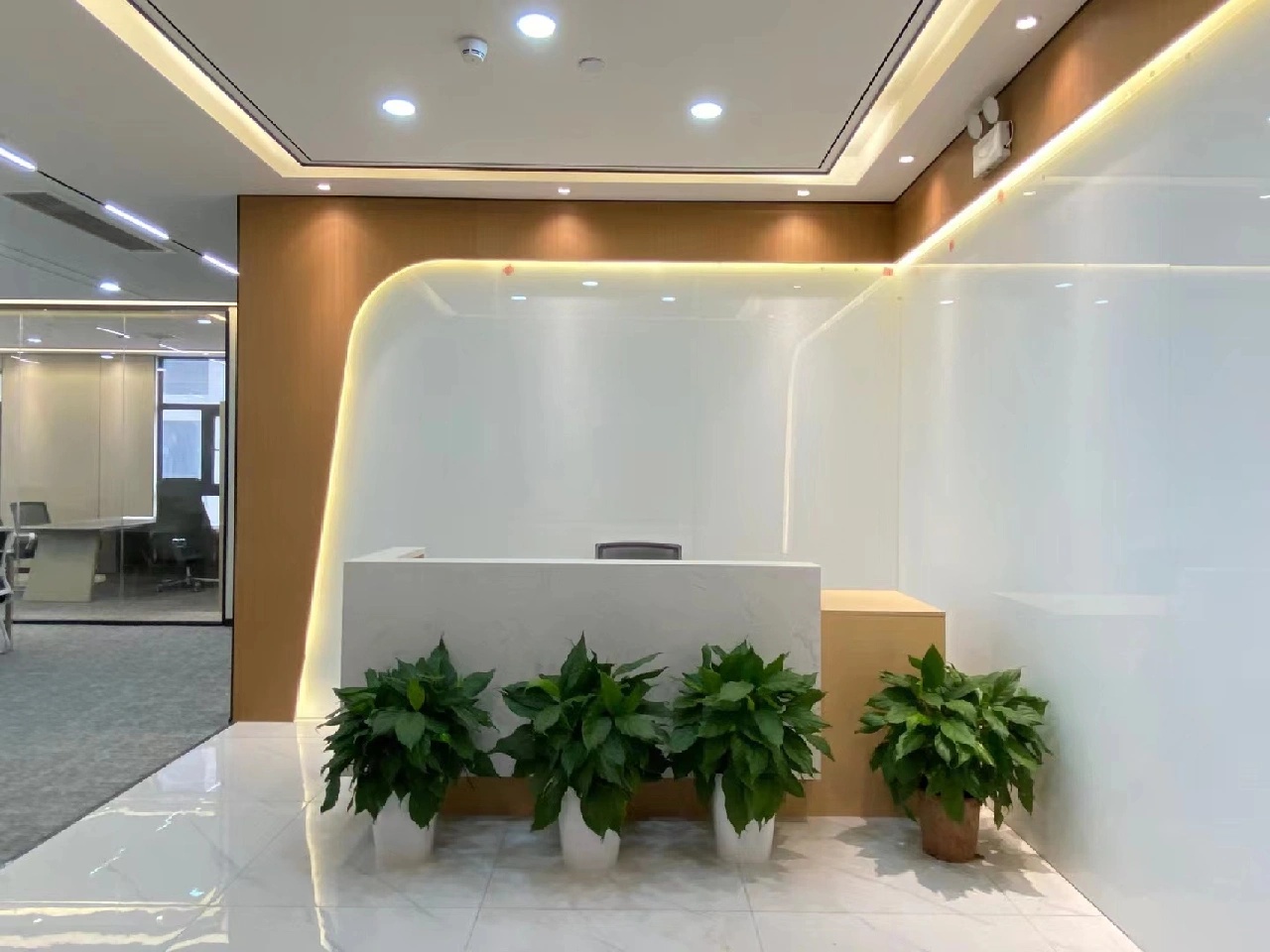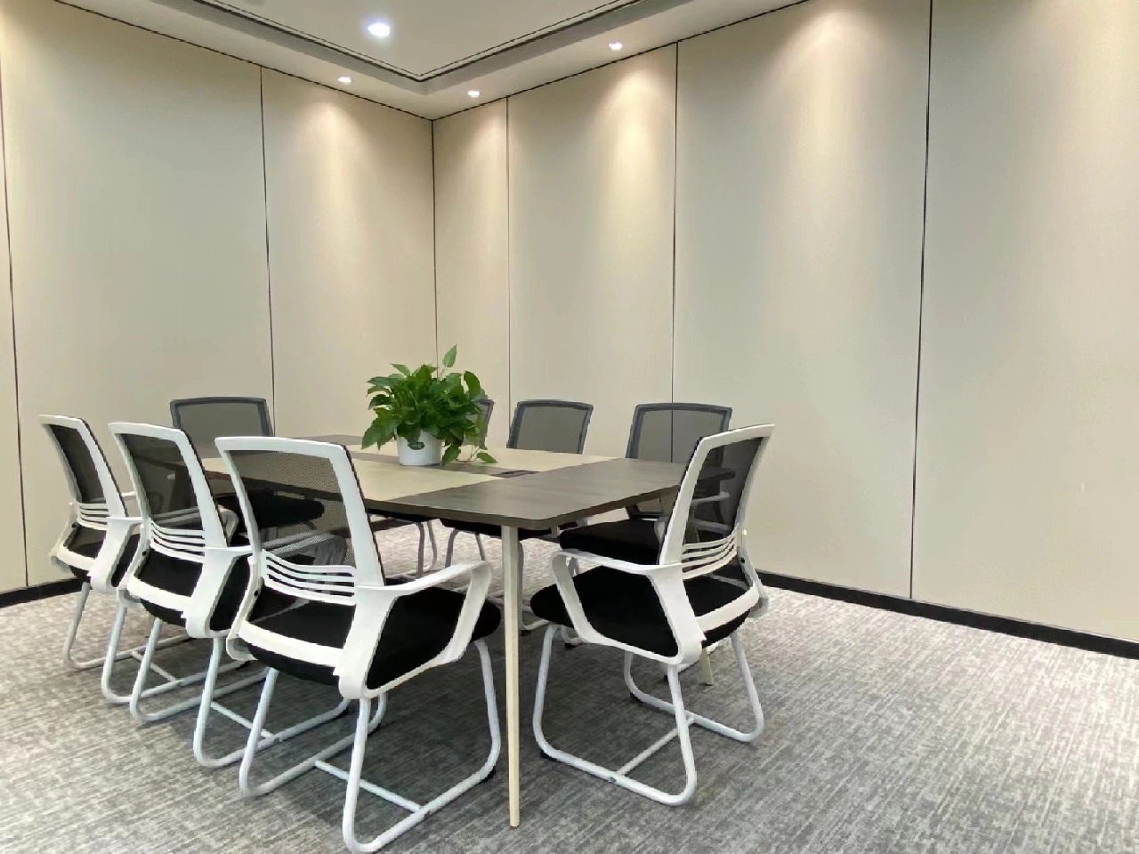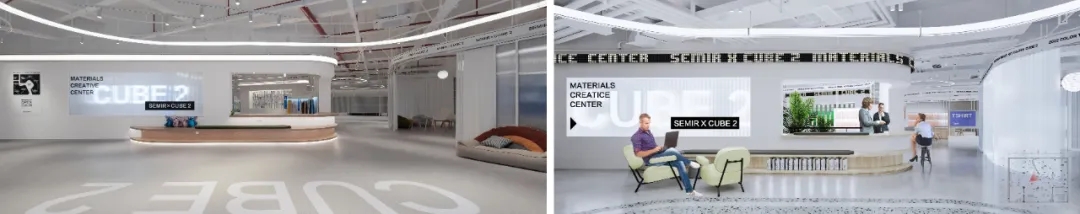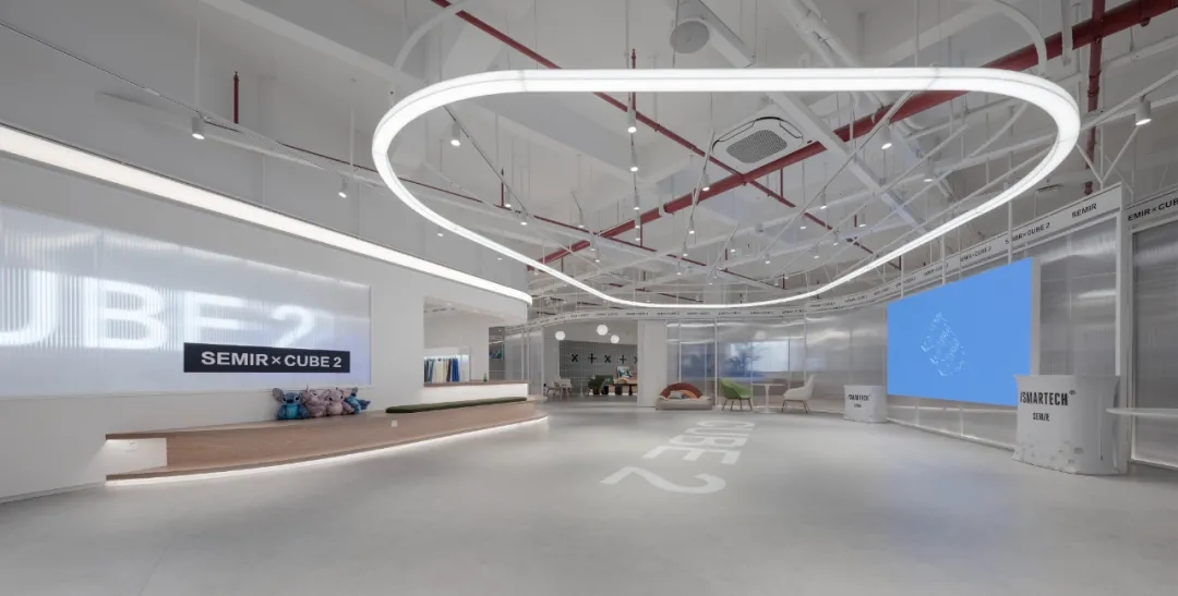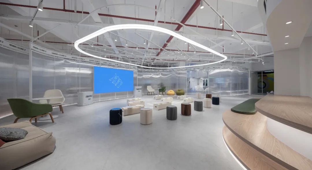 由于空间主要功能用于面料的展示,因此我们在设计中尽可能弱化空间的存在感,采用大面积的白色肌理漆和海灰色地坪塑造纯粹的空间基底,没有丝毫喧宾夺主的意味,让服装面料成为空间的主角。9mm厚度的聚碳酸酯曲面隔断在内置灯带的作用下创造了朦胧的透光感和科技感,是营造空间氛围的一大“功臣”。由于曲面的做法在市场上并不普遍,而过于厚的聚碳酸酯又无法表达通透轻盈的感觉,因此,设计团队仔细研究了材料的制作工艺,按照100mm*100mm的模数,每米间距进行钢管固定以提高其硬度和强度。