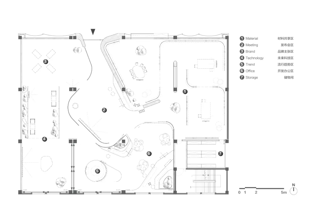 开放的中庭是整个空间的精神内核,需要满足办公、发布会和走秀等不同功能间的灵活转变。因此,从入口延伸至中庭区域的流线简洁明晰,空间尽可能开放灵活。尽管几个功能模块的布局几经易稿,但这一空间始终没有变化,作为一个聚合性空间,所有功能都围绕着它展开。