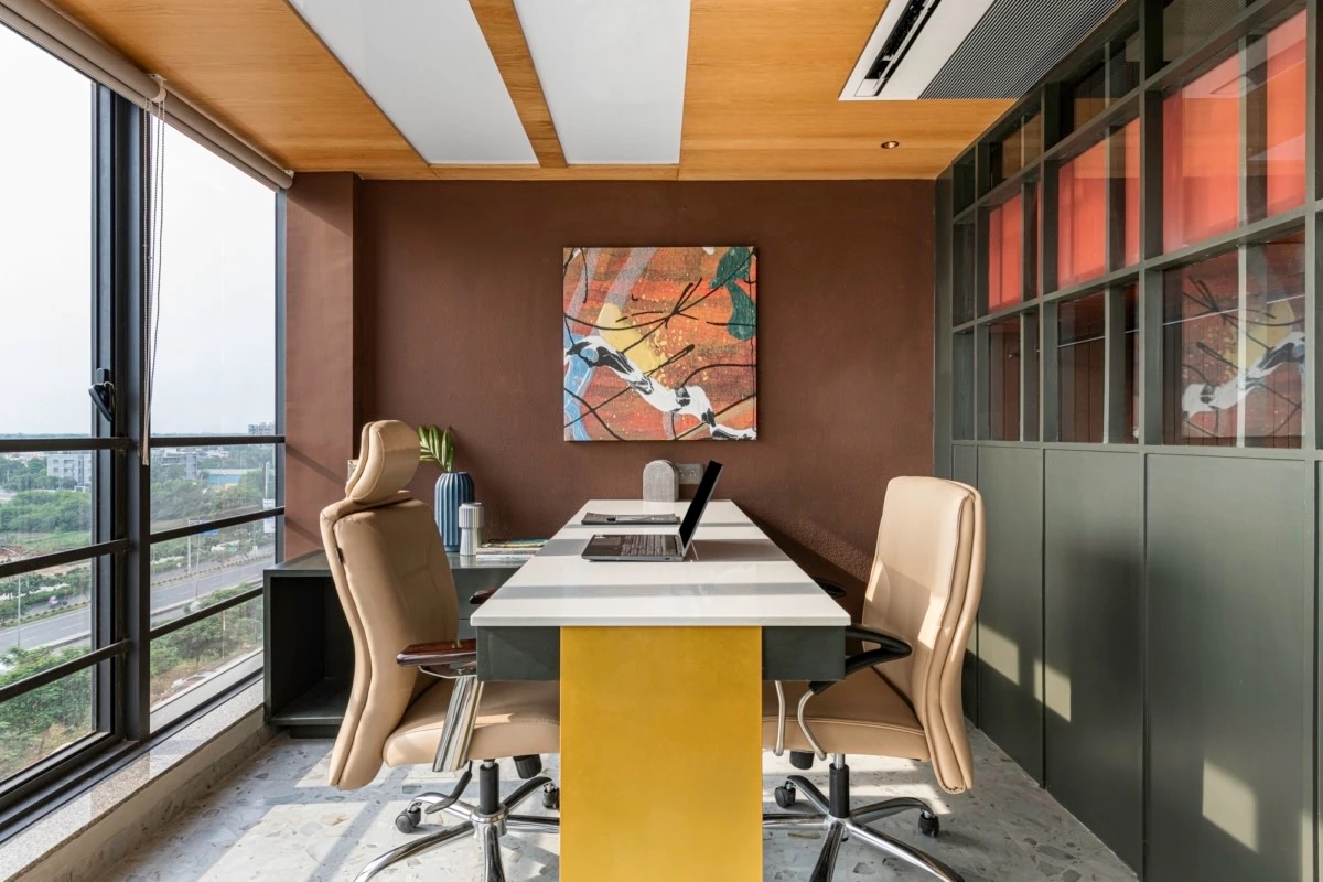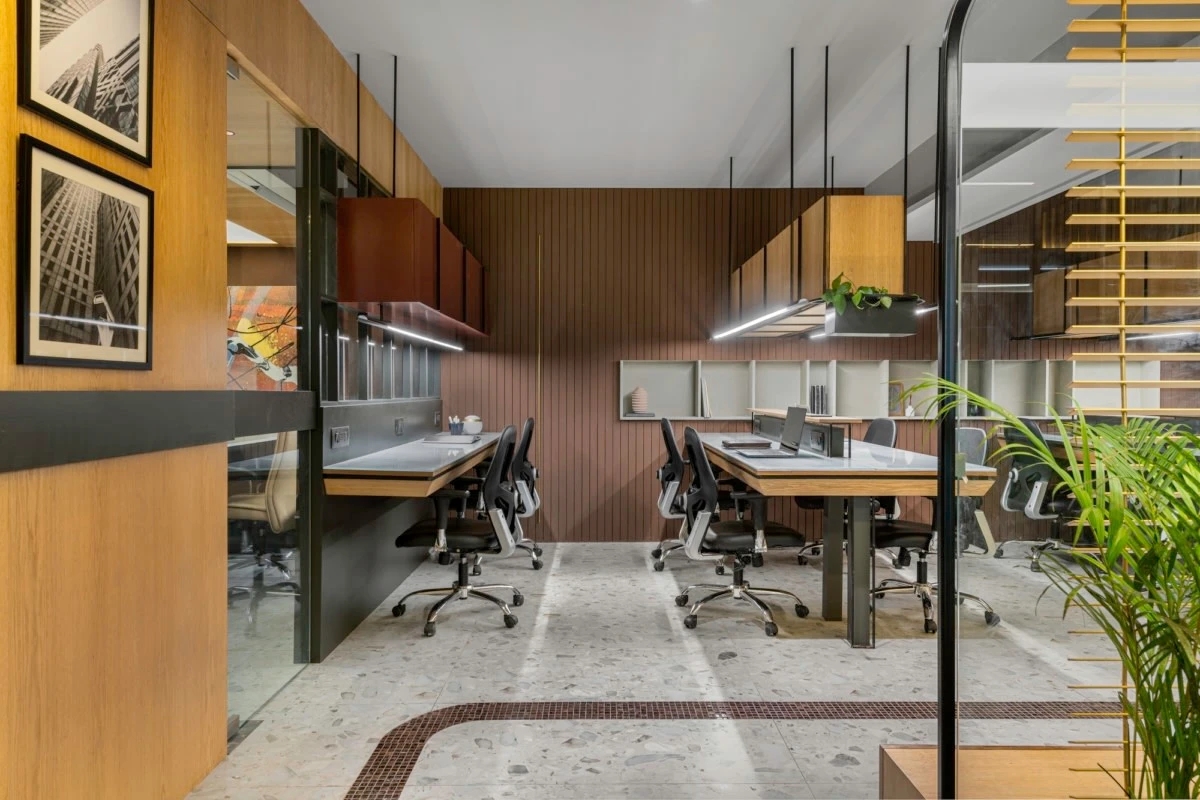 小木屋和员工区之间的隔断是一个伪三中心的金属拱门,上面悬挂着一块玻璃板。它的一侧有一个木质储物柜,另一侧有一个花盆。播种机顶部装有光合作用灯,以便更好地生长植物。黄铜涂层的金属元素强化了美学,带来了优雅的外观。宽松的家具放置在中间,鼓励激励工作空间文化。整个空间的艺术以流动为导向。流体艺术作品组成了几个小木屋,而两个小木屋的标志性墙壁上绘有流体主题。小木屋由带有悬挂式储物间的玻璃隔板隔开。玻璃隔断确保了视觉上的联系,并提供了一种开放的感觉。