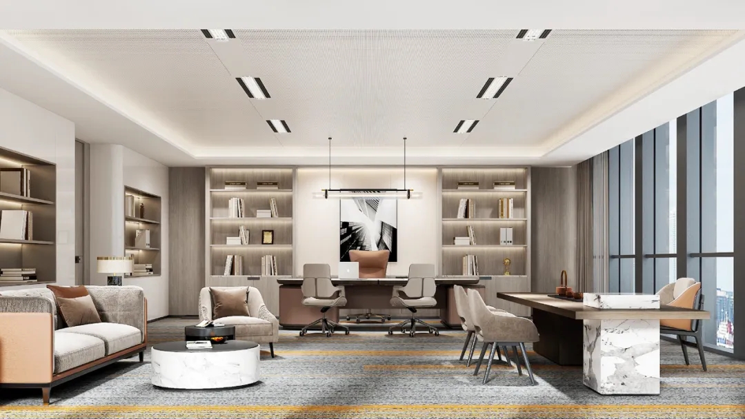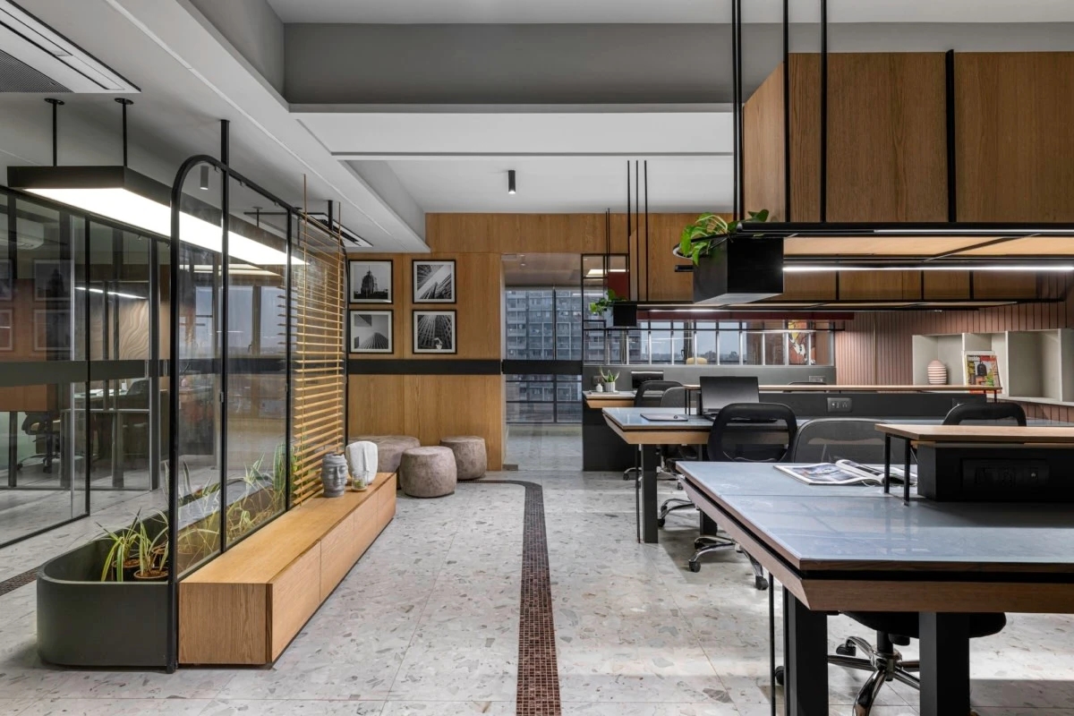 设计突出了办公室的工作功能,其元素与自然元素是同义词。整个办公室使用了干净的单板调色板,带有黑色金属和土红色色调。这是一个元素设计,有意识地提高每个方面。