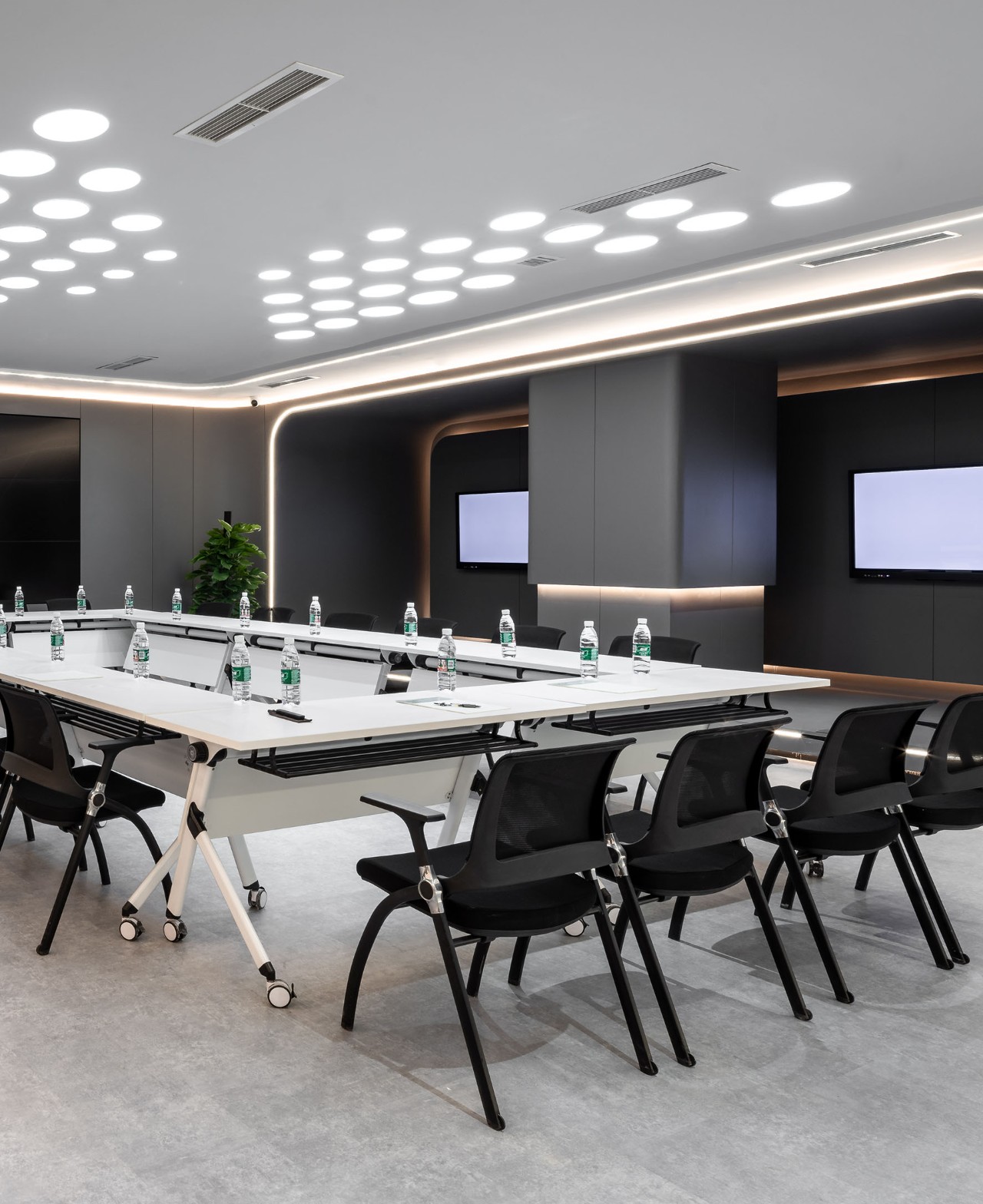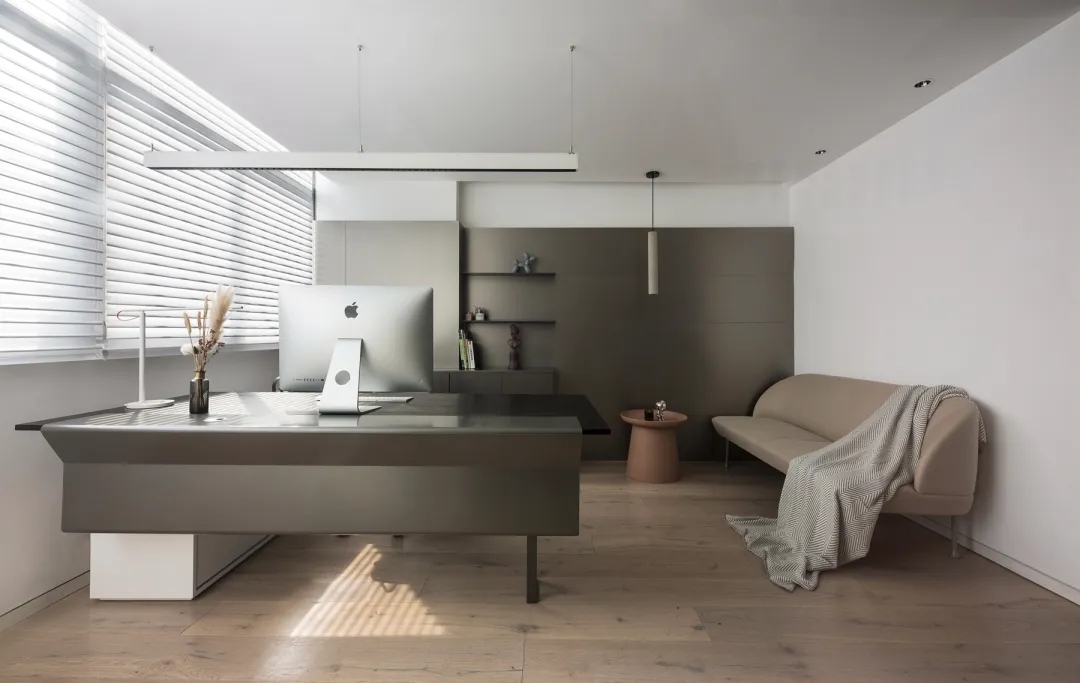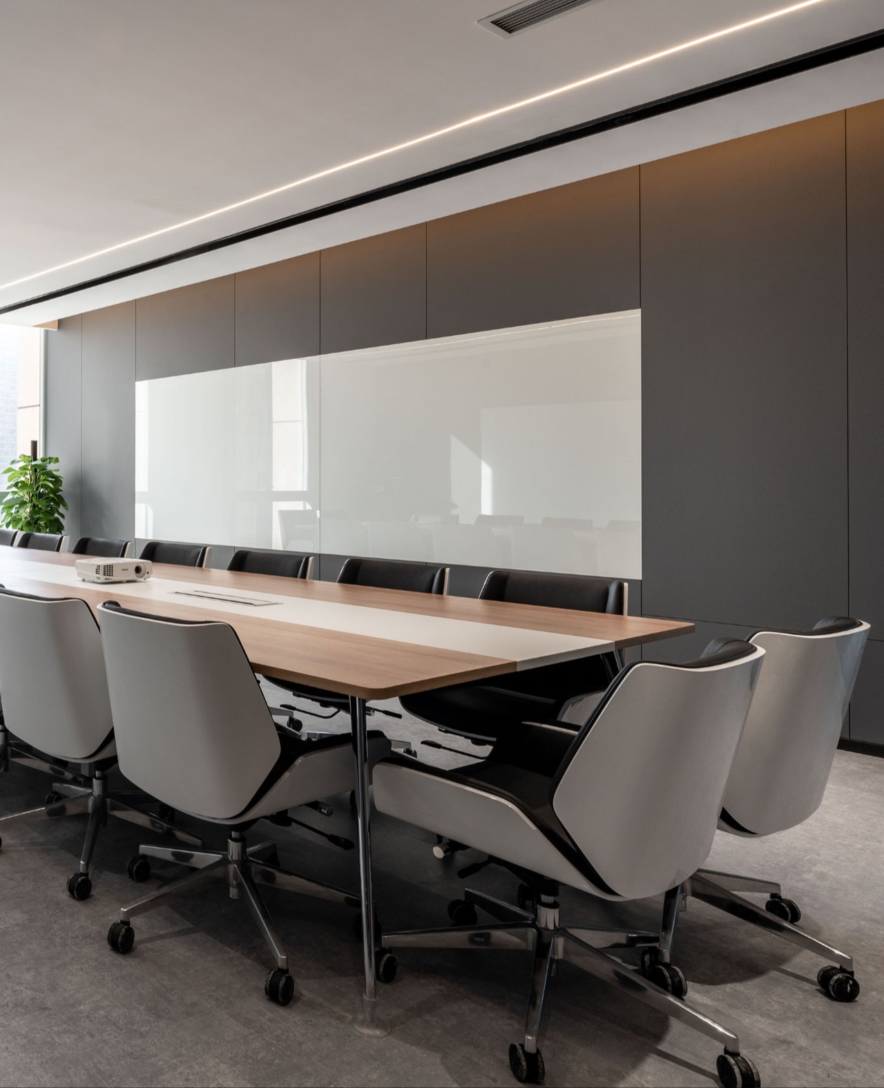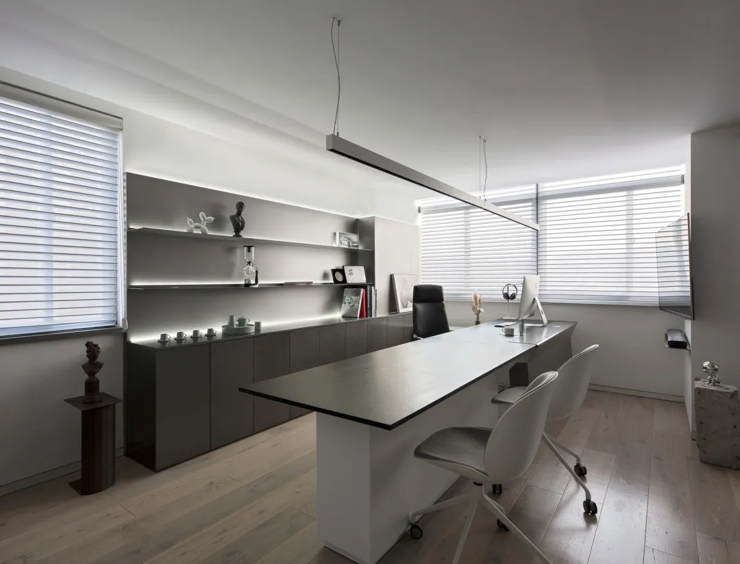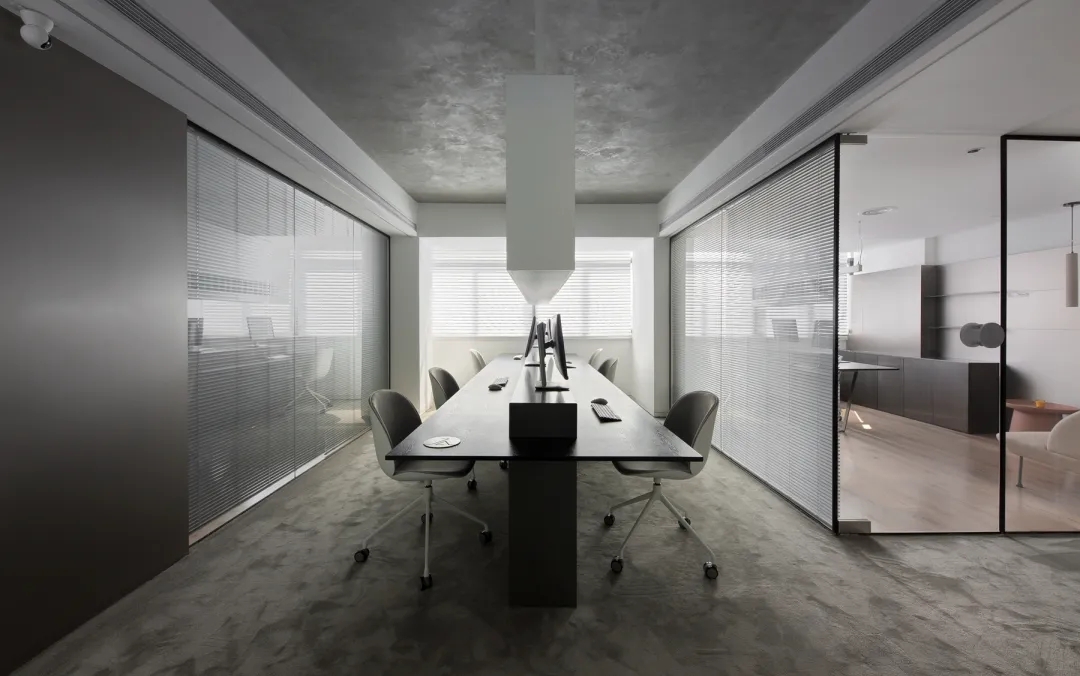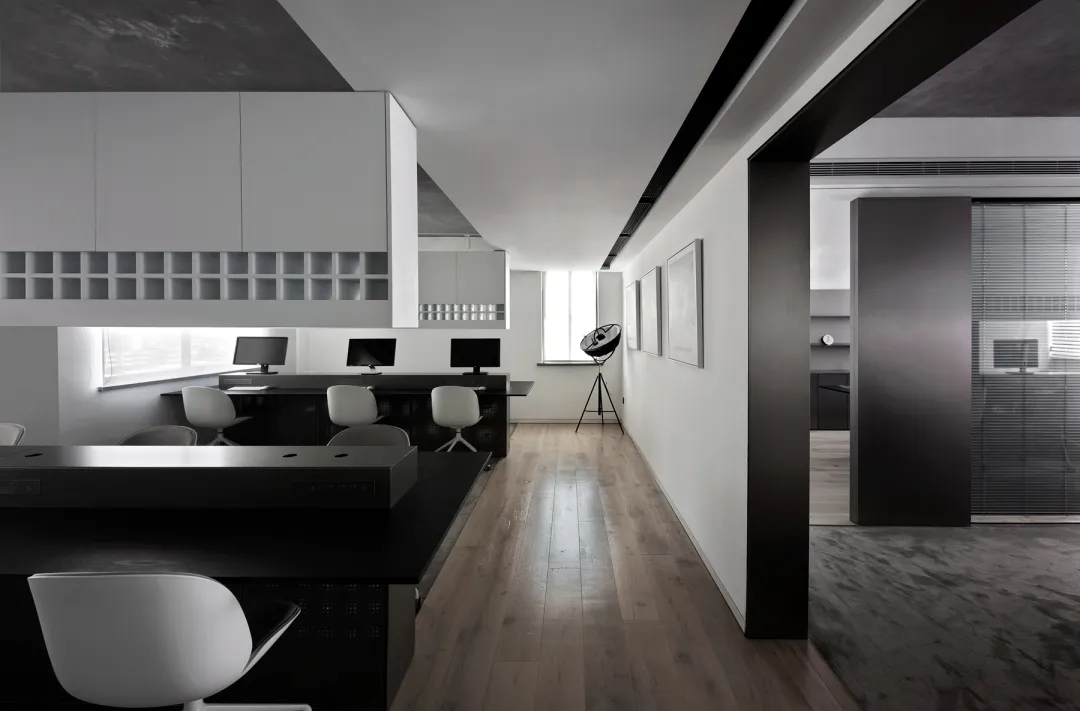设计总监的办公室并不大,可重要的接待与提案汇报皆在此进行。将办公桌与茶桌连为一体,长达4米的桌面成为巨大的工作平面,办公与接待状态可随时切换,甚至还可以随时召开小型会议。墙上的电视90度旋转后摇身一变成为会议屏幕,房间可同时容纳8~12人。用于陈列藏品与荣誉的超薄层板仿佛置身于引力作用之外,冷魅的线性灯光衬出哑光不锈钢的质感,低调内敛,却毫不将就。
