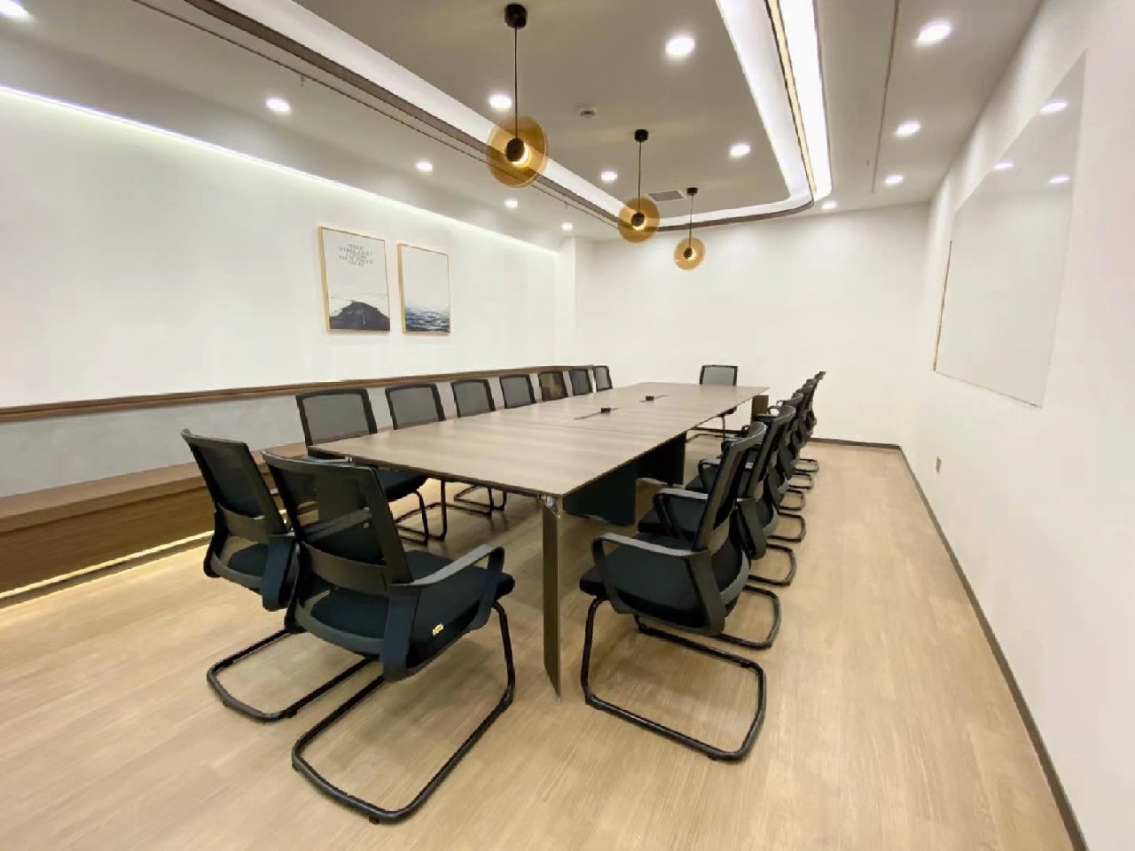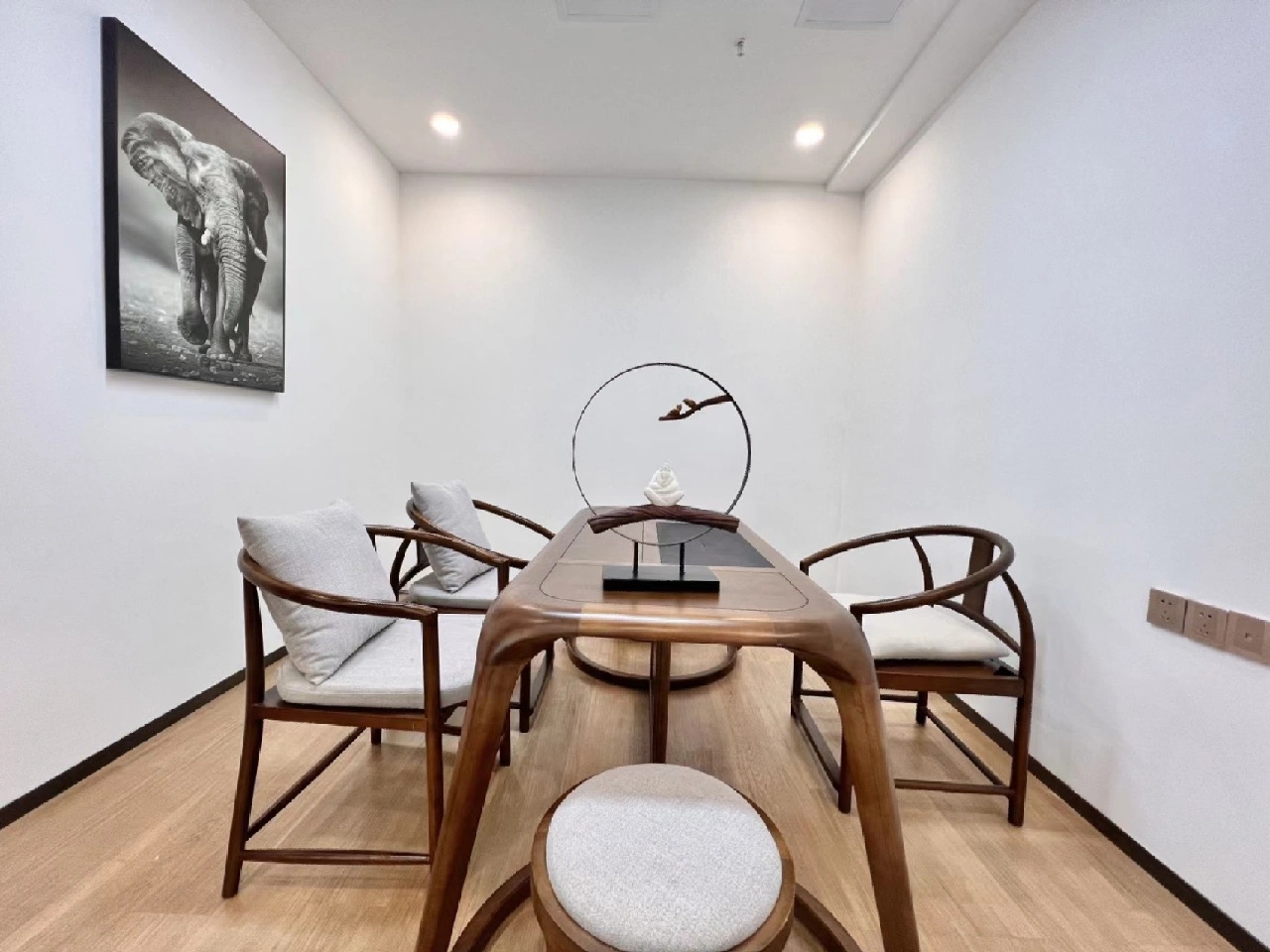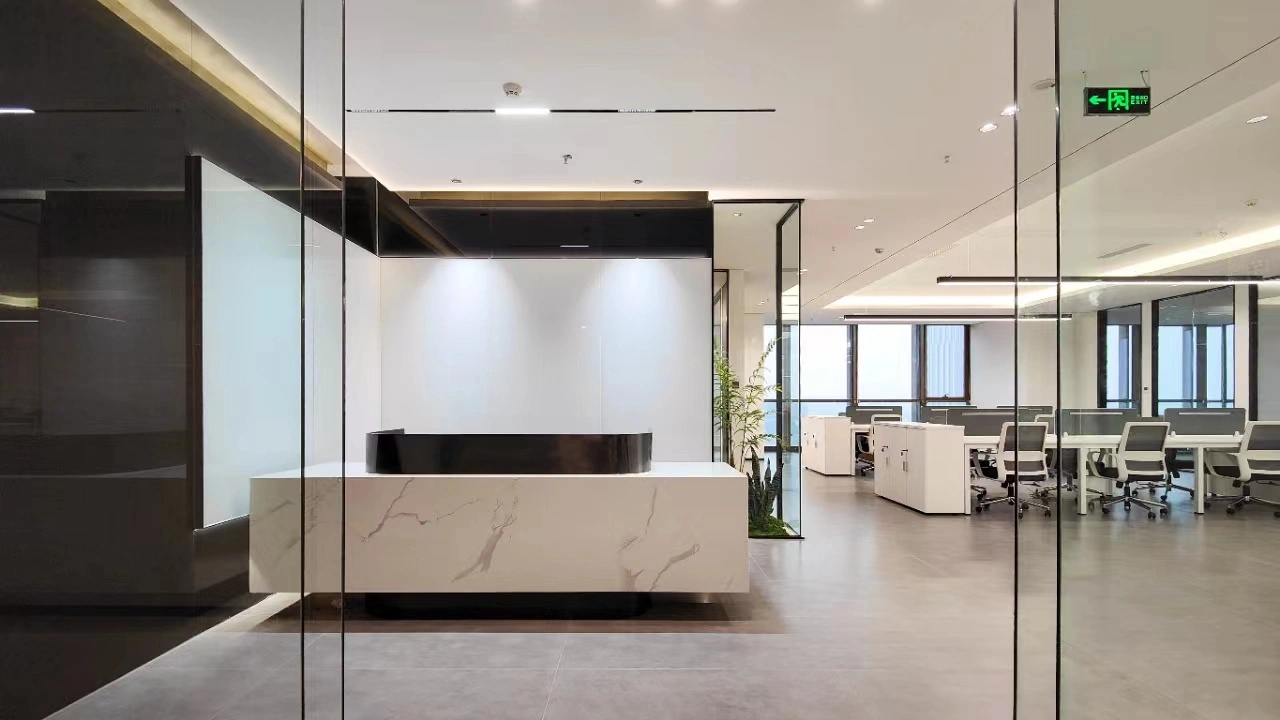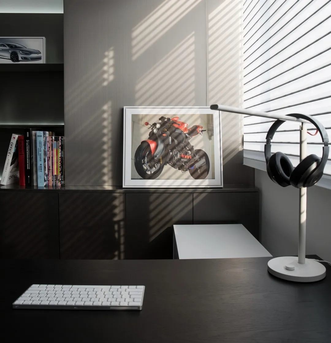 设计总监的办公室并不大,可重要的接待与提案汇报皆在此进行。将办公桌与茶桌连为一体,长达4米的桌面成为巨大的工作平面,办公与接待状态可随时切换,甚至还可以随时召开小型会议。墙上的电视90度旋转后摇身一变成为会议屏幕,房间可同时容纳8~12人。用于陈列藏品与荣誉的超薄层板仿佛置身于引力作用之外,冷魅的线性灯光衬出哑光不锈钢的质感,低调内敛,却毫不将就。