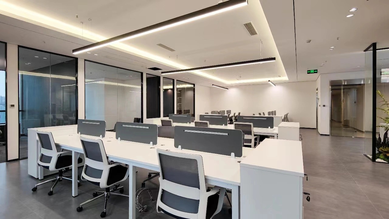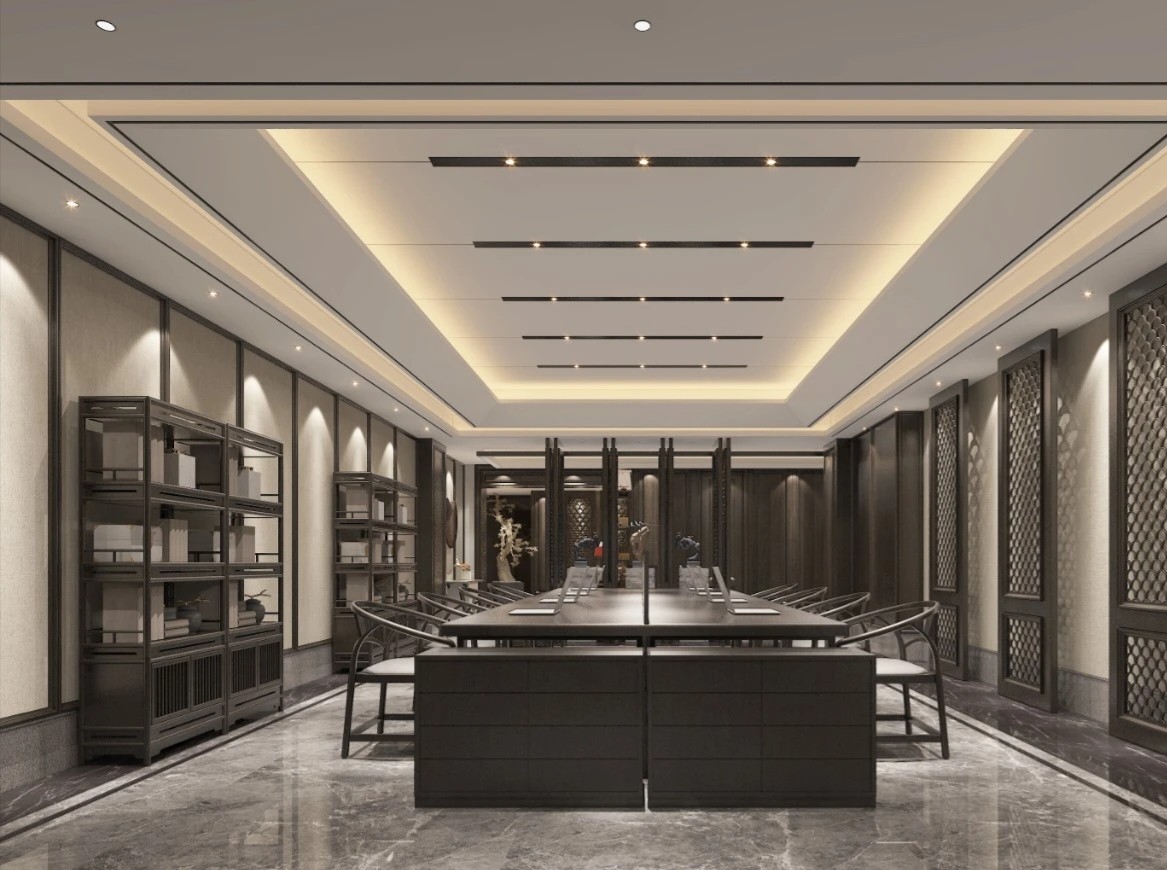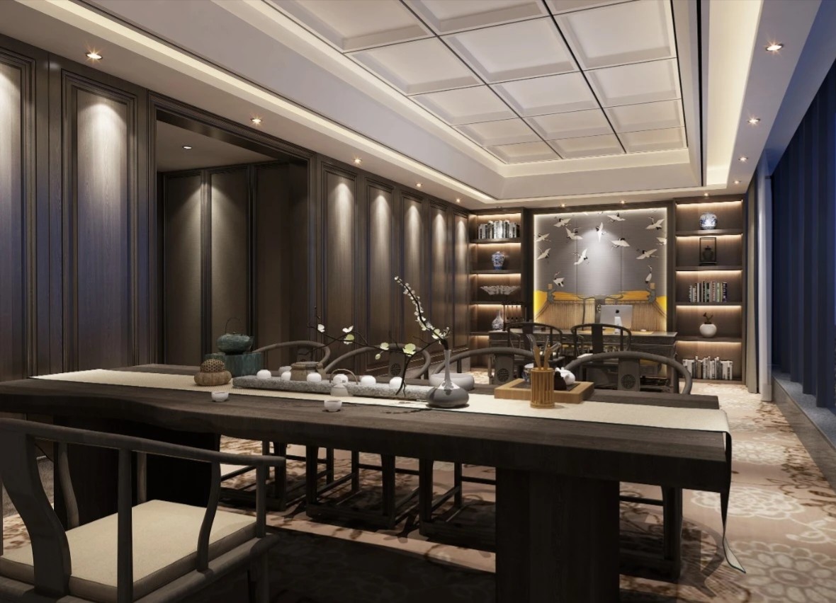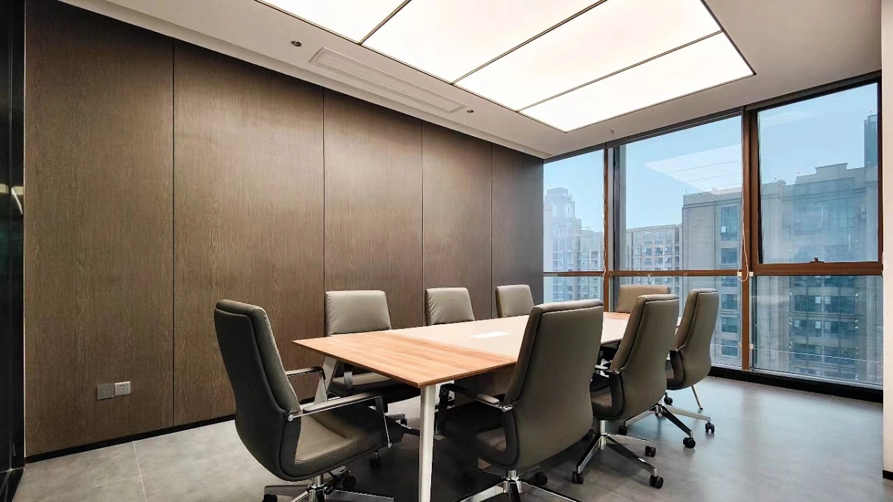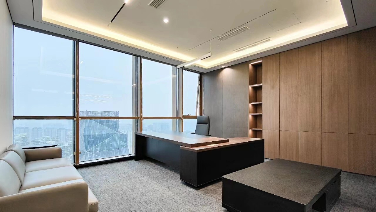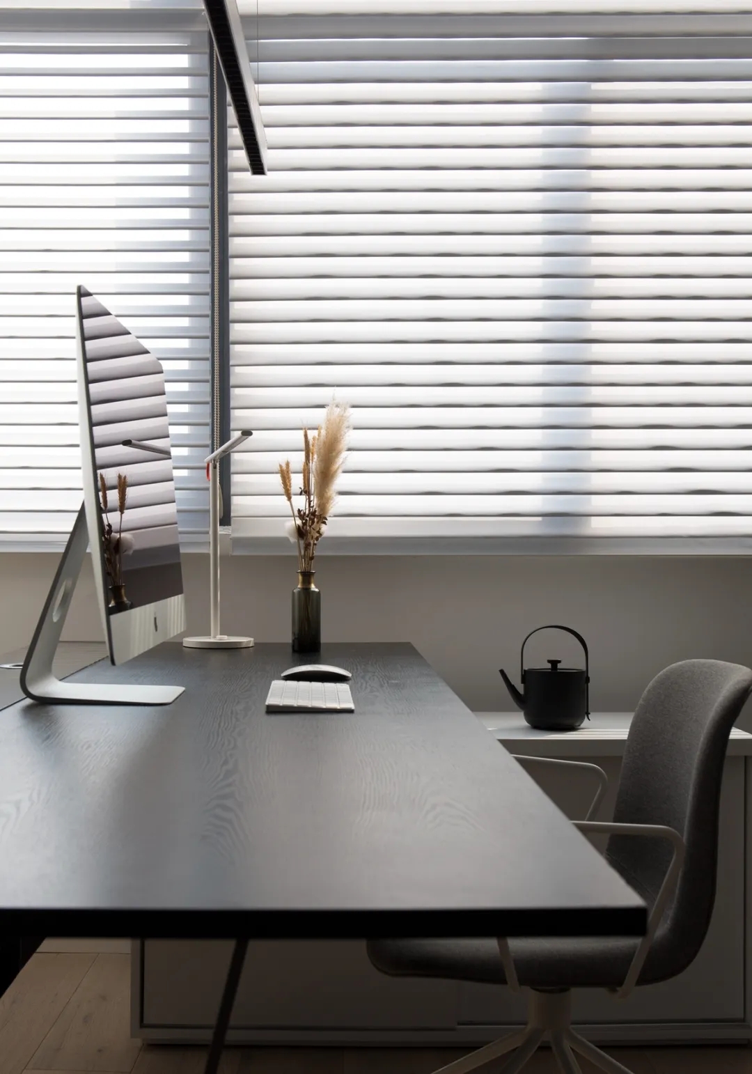 设计总监的办公室并不大,可重要的接待与提案汇报皆在此进行。将办公桌与茶桌连为一体,长达4米的桌面成为巨大的工作平面,办公与接待状态可随时切换,甚至还可以随时召开小型会议。墙上的电视90度旋转后摇身一变成为会议屏幕,房间可同时容纳8~12人。用于陈列藏品与荣誉的超薄层板仿佛置身于引力作用之外,冷魅的线性灯光衬出哑光不锈钢的质感,低调内敛,却毫不将就。