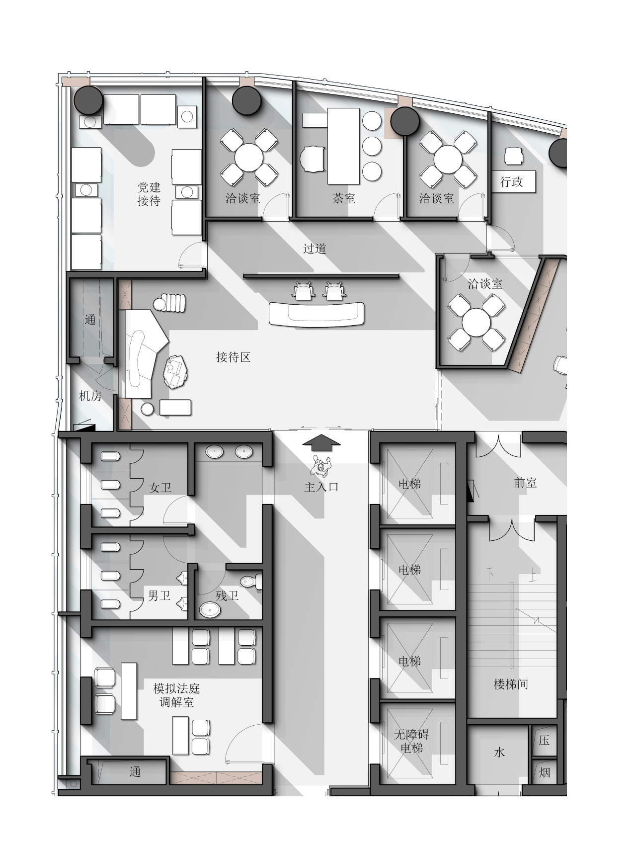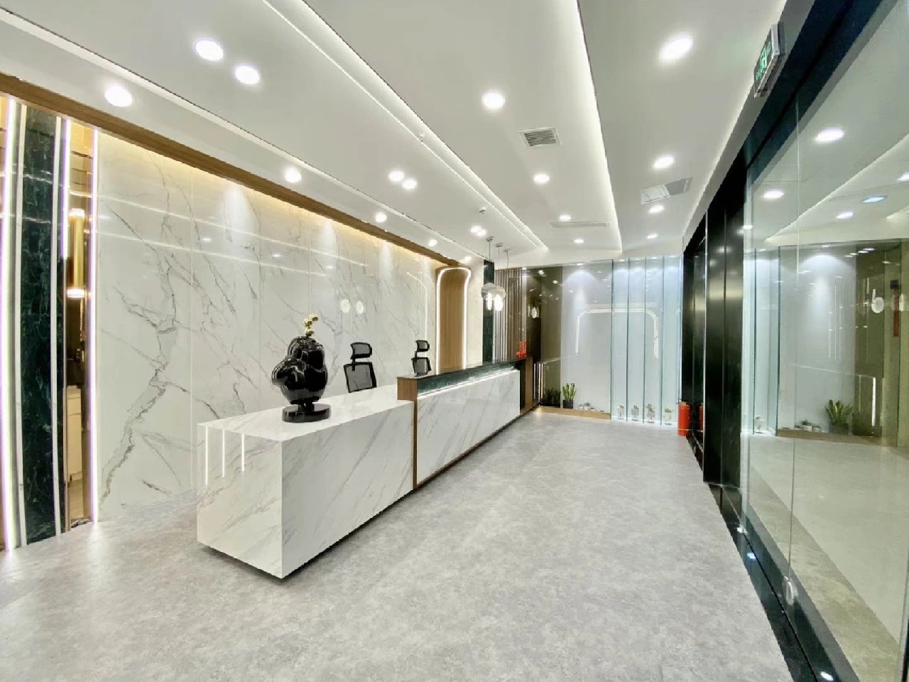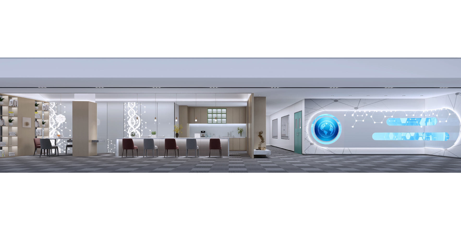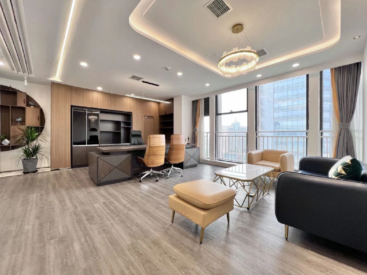 设计总监的办公室并不大,可重要的接待与提案汇报皆在此进行。将办公桌与茶桌连为一体,长达4米的桌面成为巨大的工作平面,办公与接待状态可随时切换,甚至还可以随时召开小型会议。墙上的电视90度旋转后摇身一变成为会议屏幕,房间可同时容纳8~12人。用于陈列藏品与荣誉的超薄层板仿佛置身于引力作用之外,冷魅的线性灯光衬出哑光不锈钢的质感,低调内敛,却毫不将就。