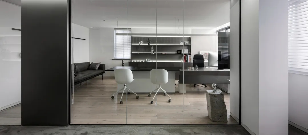全透明独立办公室的设计是为了减少疏离感,不保留的展示自己的工作状态,亦是一种互相督促和勉励的方式,同时得到了更开阔的空间感。从工地上捡回的废弃水泥墩,放在这里竟毫不生硬,像极了这刚硬时代与设计师柔软情怀之间的对话,互不退让,又惺惺相惜。