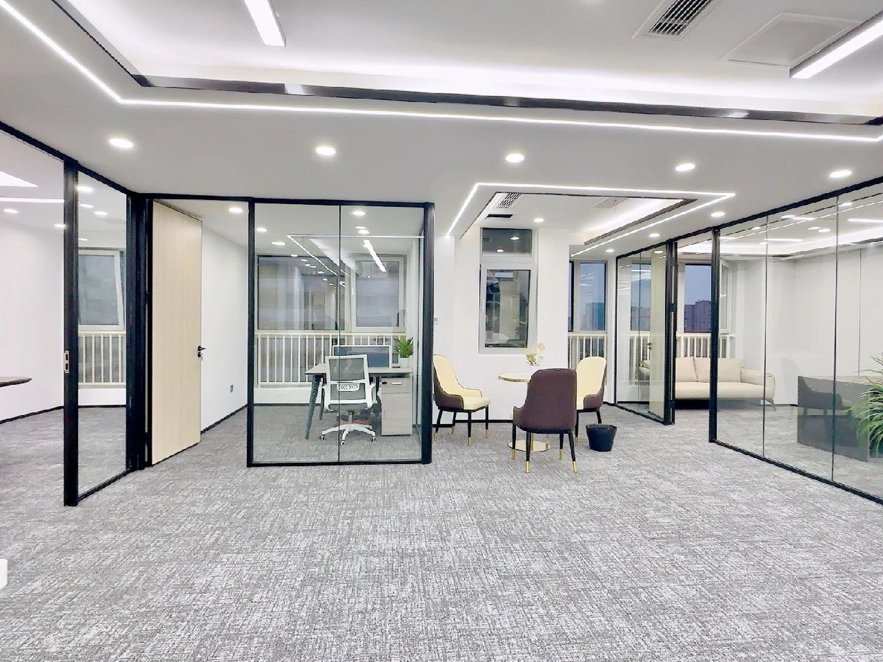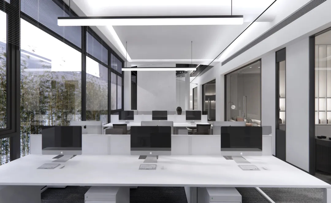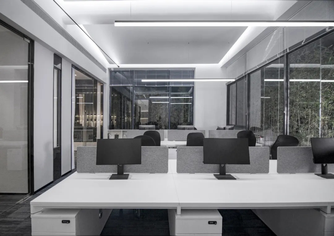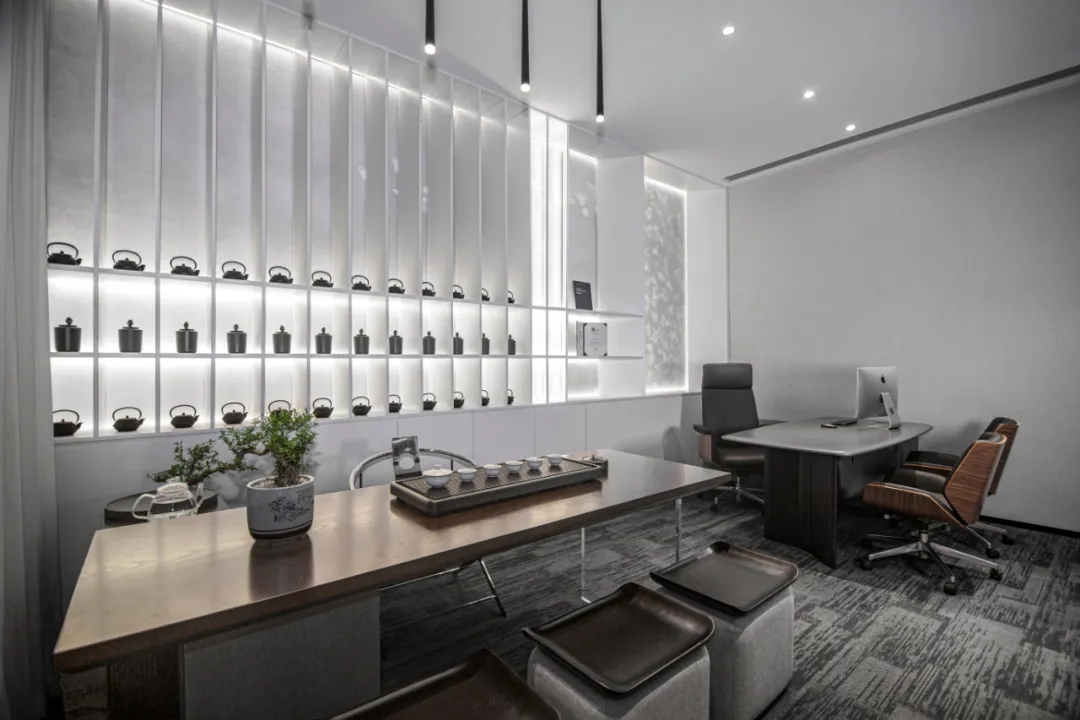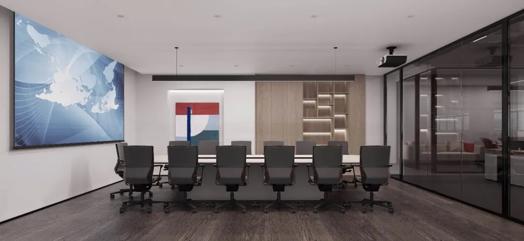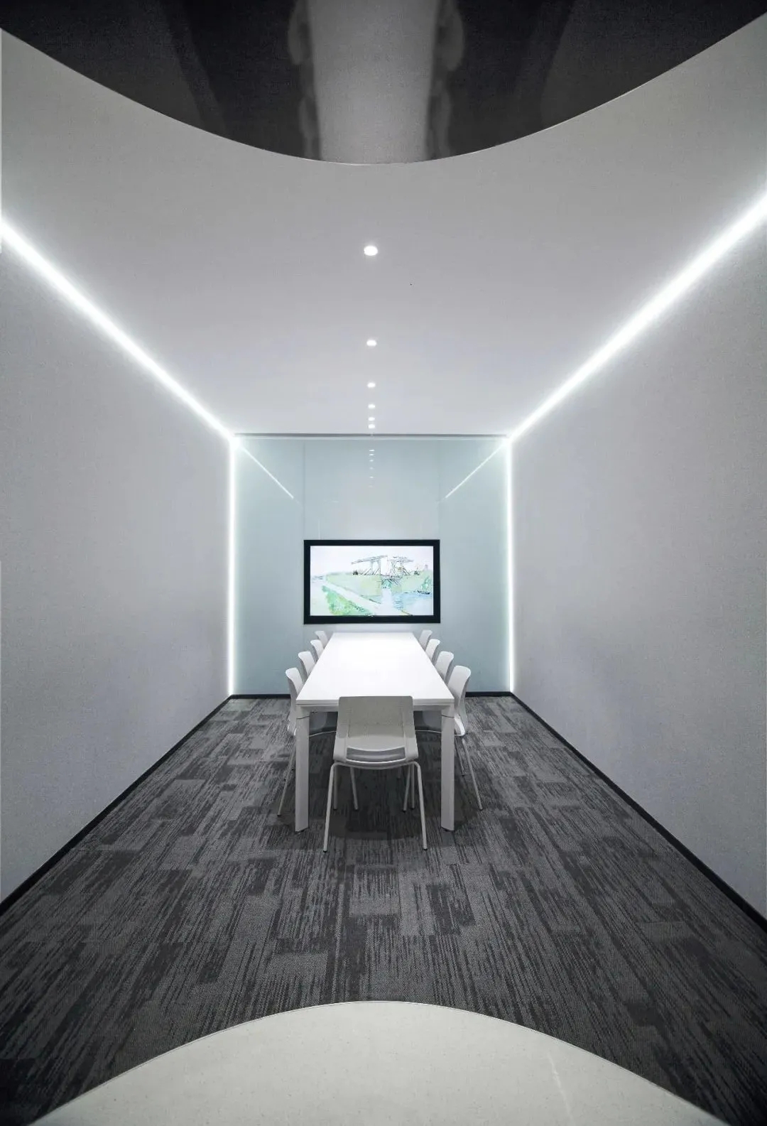 玻璃材质在光线的折射下为会议室营造了多重镜面的效果,简洁明亮,视觉通透。白色配套桌椅与顶部细长环绕灯带增加纵深感,流动敞开的同时充满丰沛的情感、秩序。