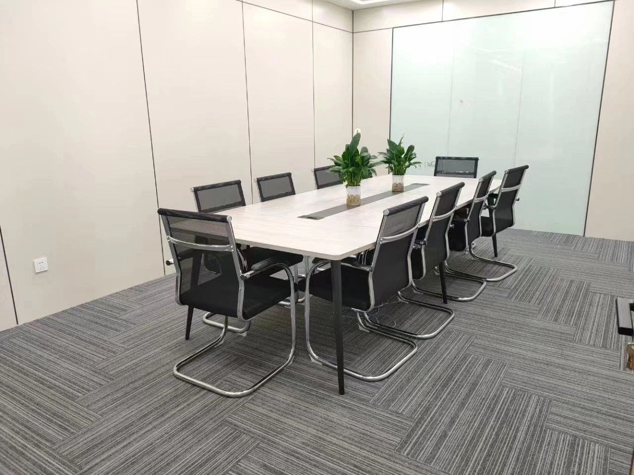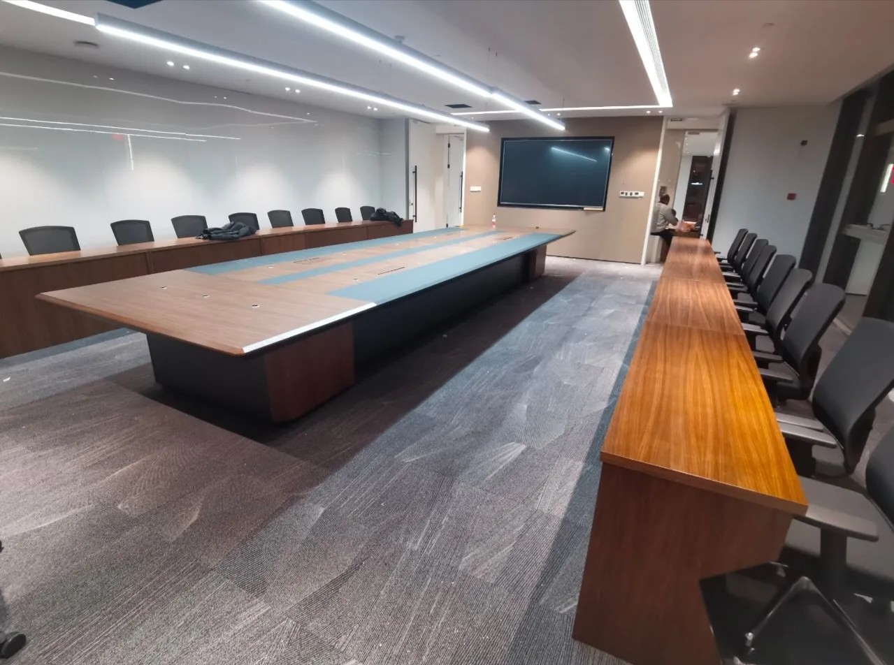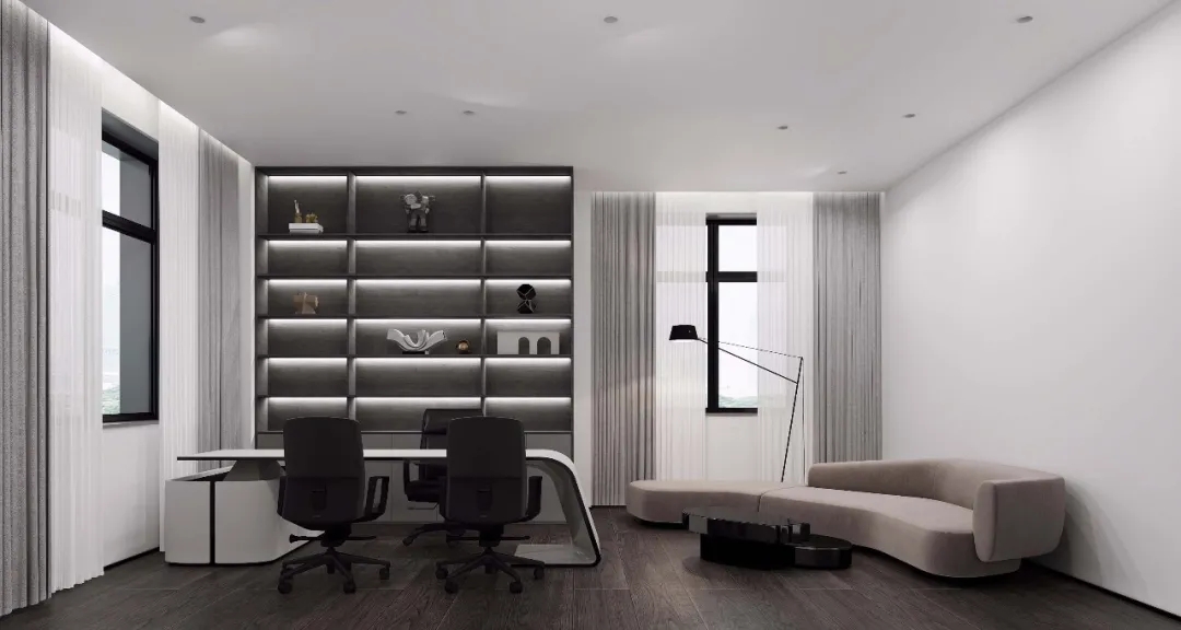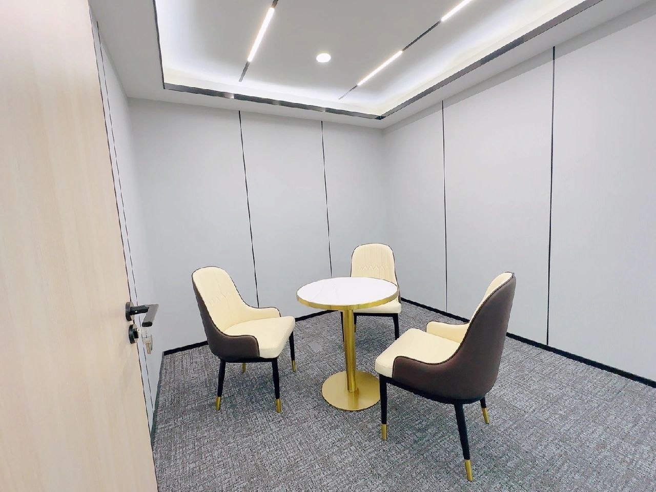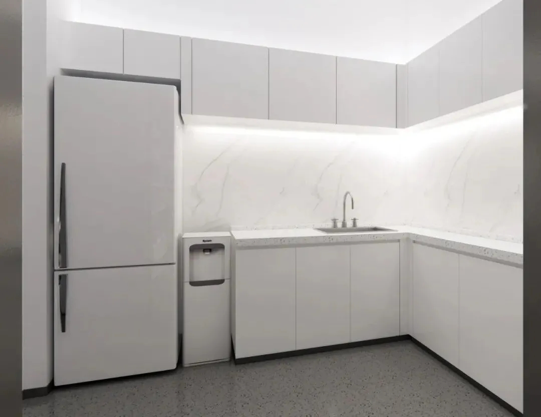 玻璃材质在光线的折射下为会议室营造了多重镜面的效果,简洁明亮,视觉通透。白色配套桌椅与顶部细长环绕灯带增加纵深感,流动敞开的同时充满丰沛的情感、秩序。