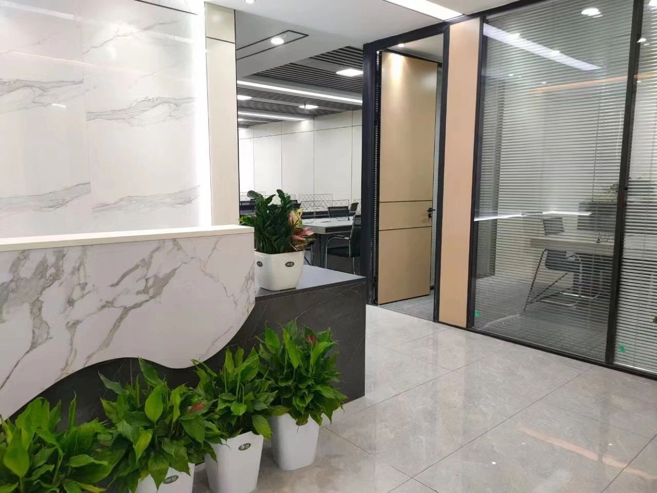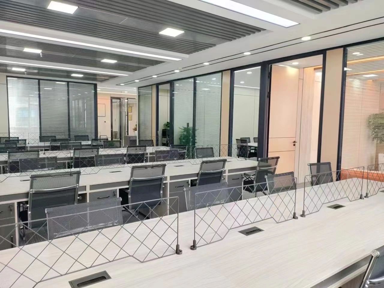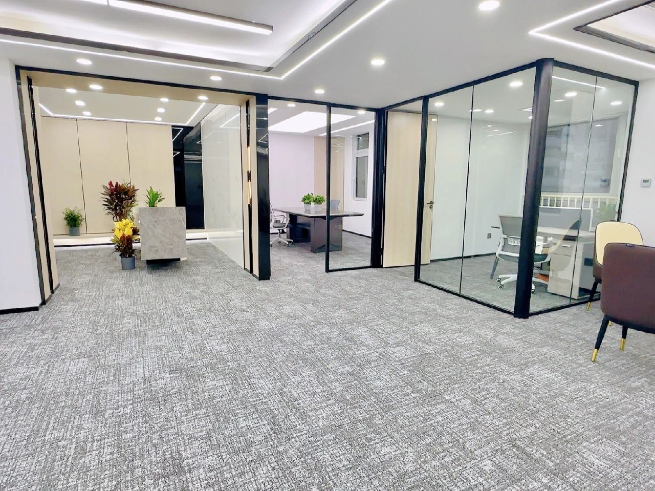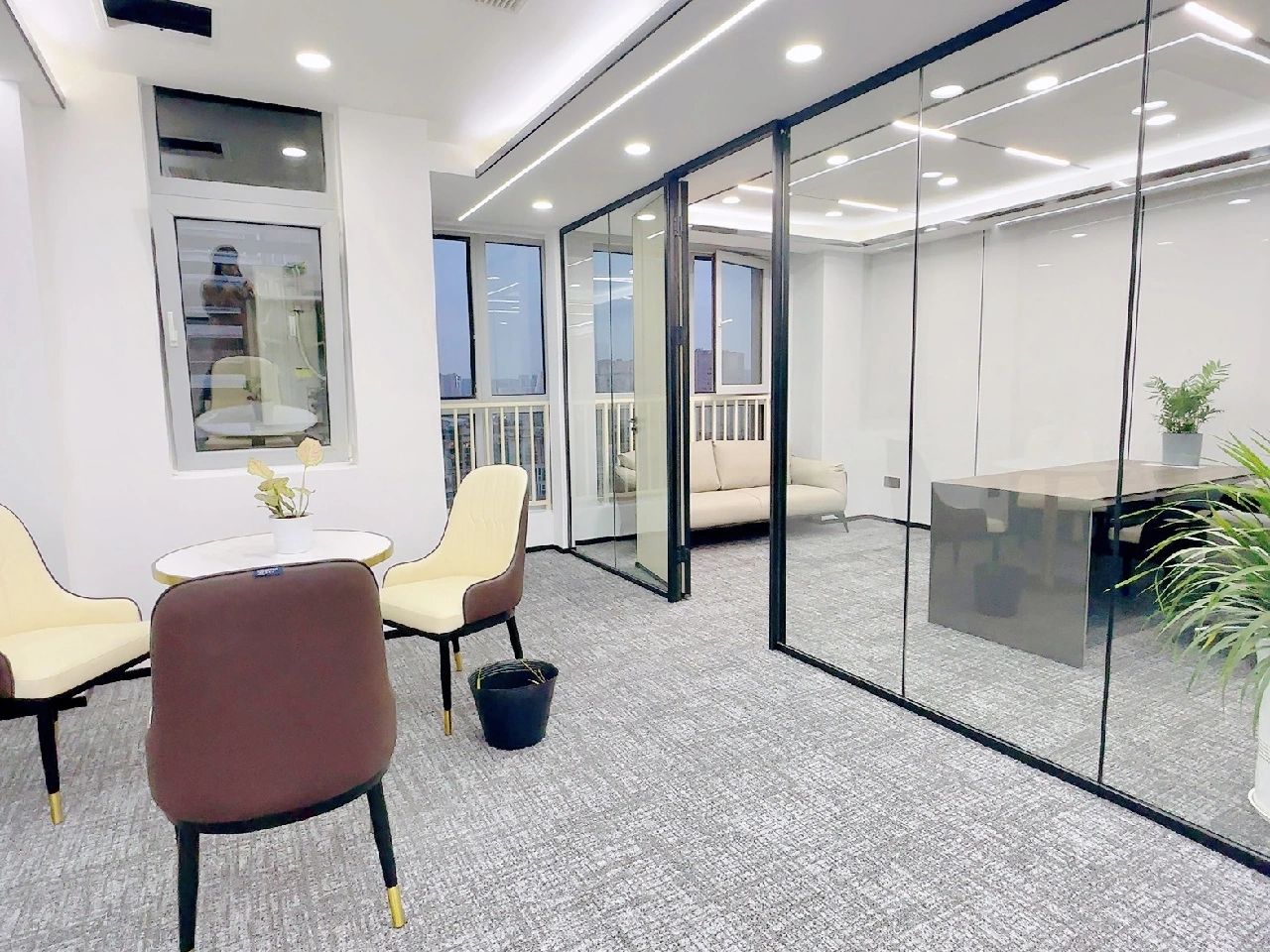 玻璃材质在光线的折射下为会议室营造了多重镜面的效果,简洁明亮,视觉通透。白色配套桌椅与顶部细长环绕灯带增加纵深感,流动敞开的同时充满丰沛的情感、秩序。