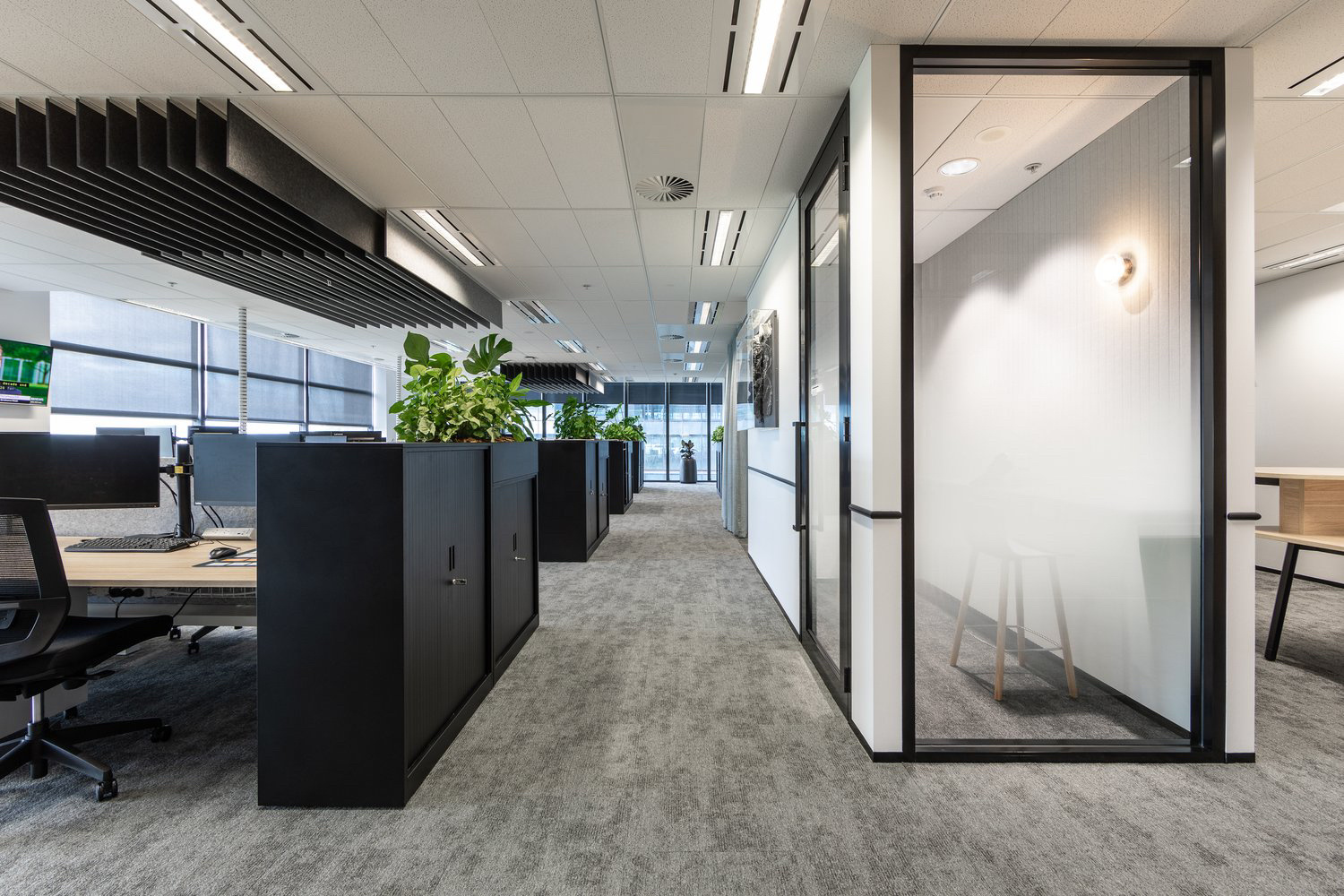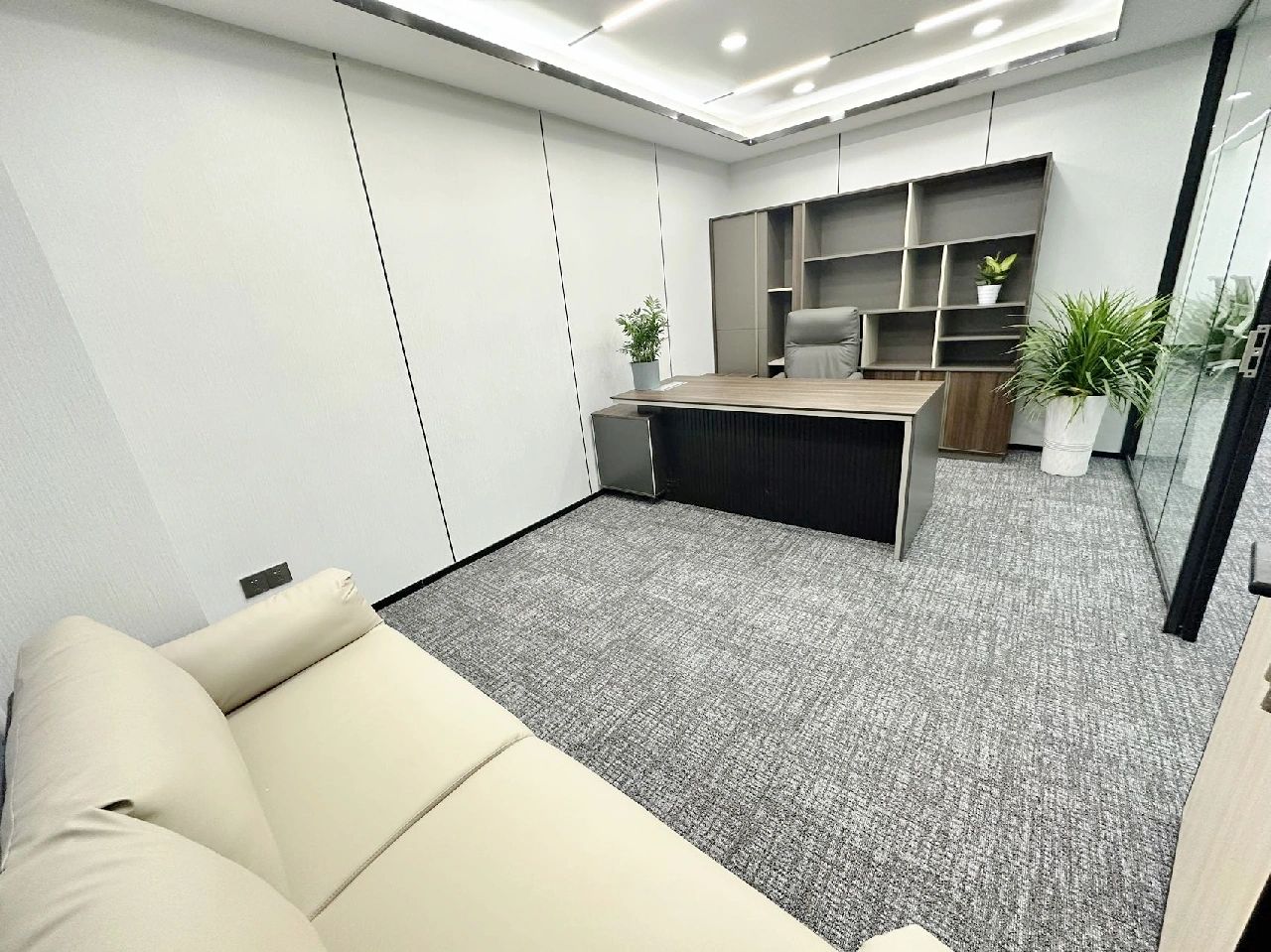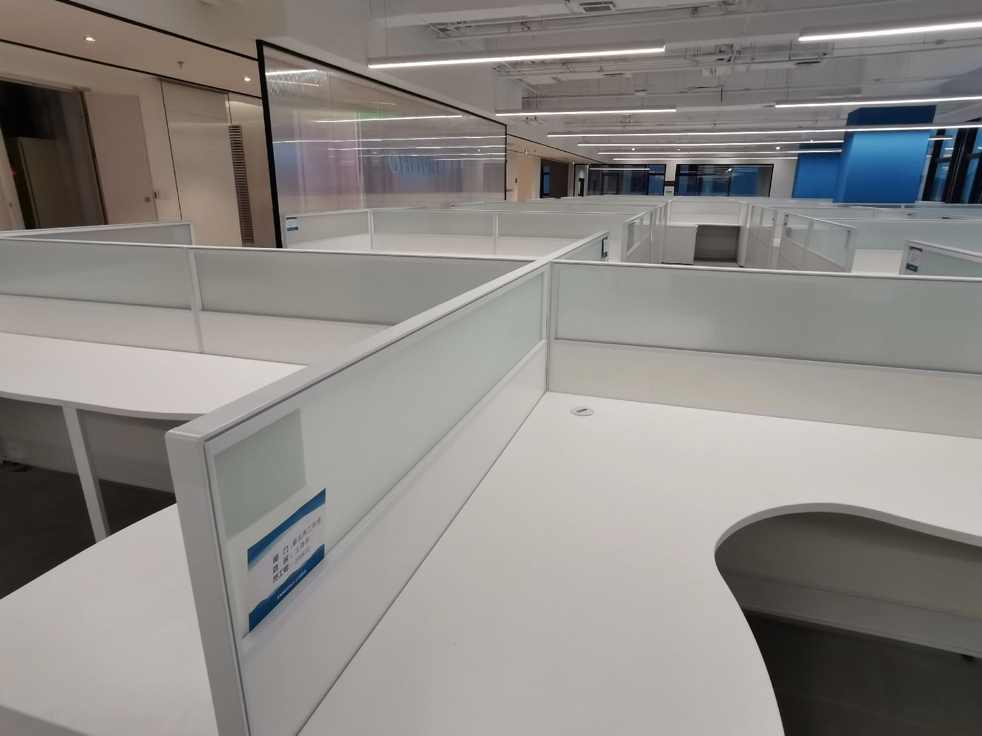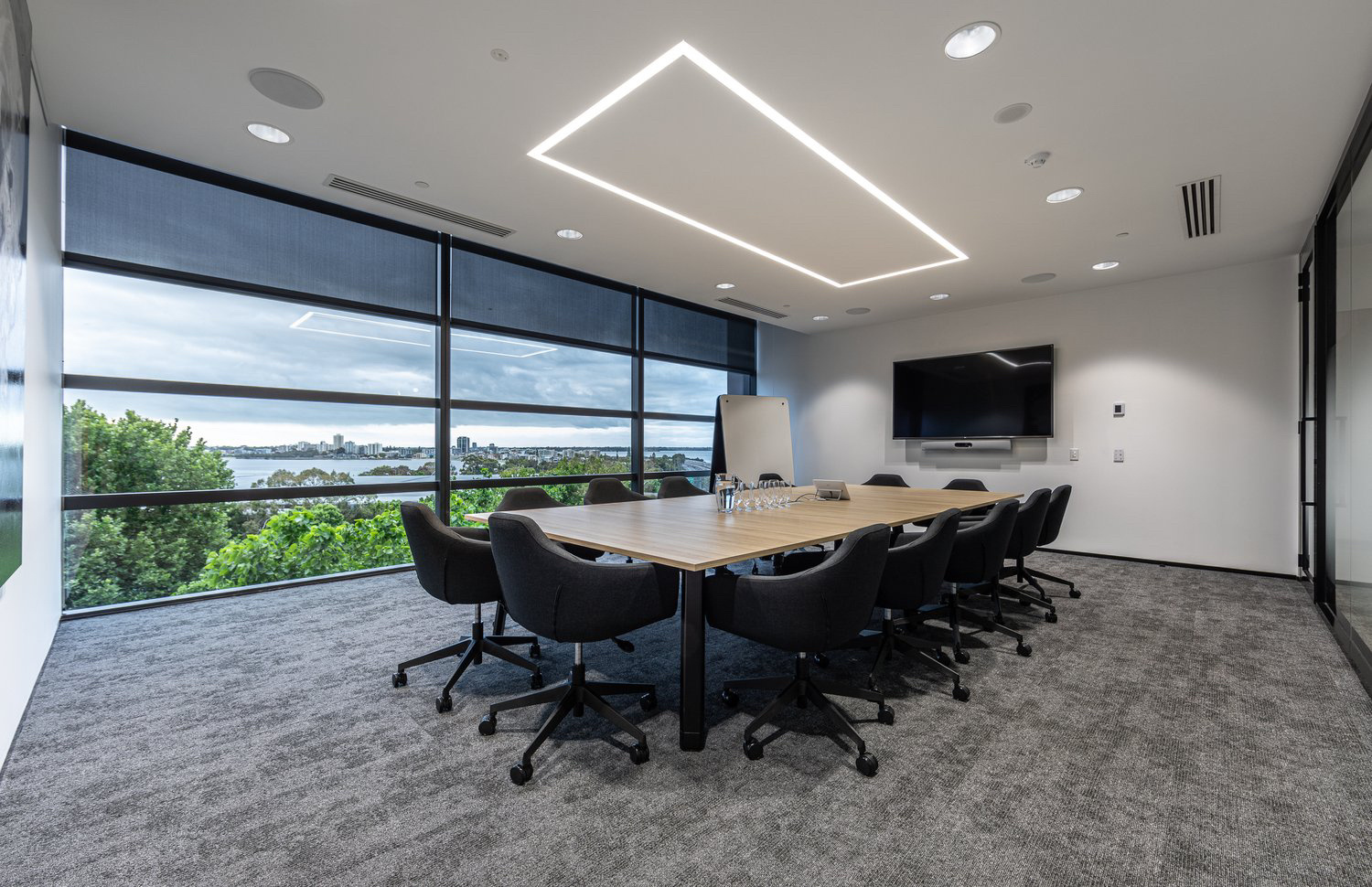 玻璃材质在光线的折射下为会议室营造了多重镜面的效果,简洁明亮,视觉通透。白色配套桌椅与顶部细长环绕灯带增加纵深感,流动敞开的同时充满丰沛的情感、秩序。
