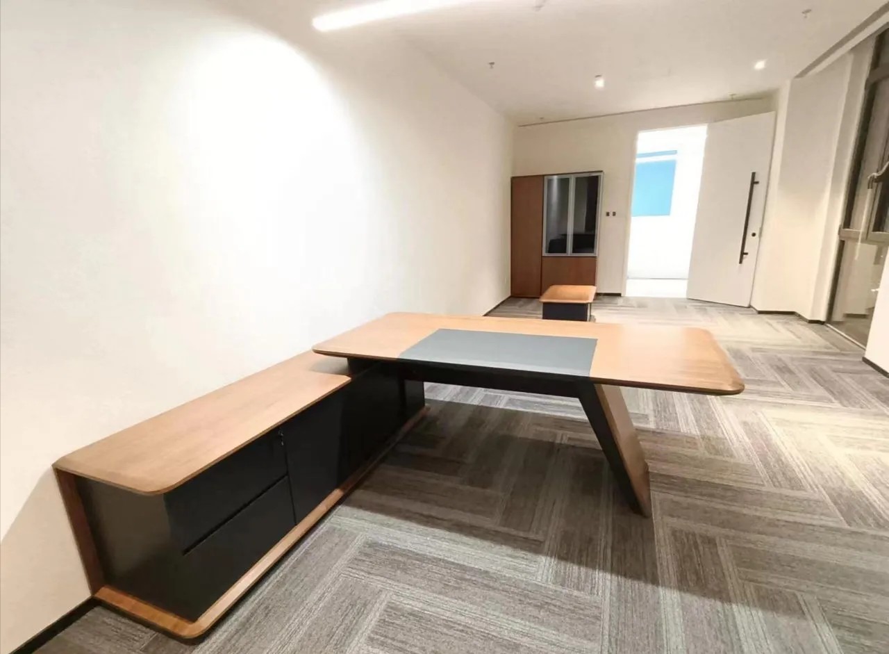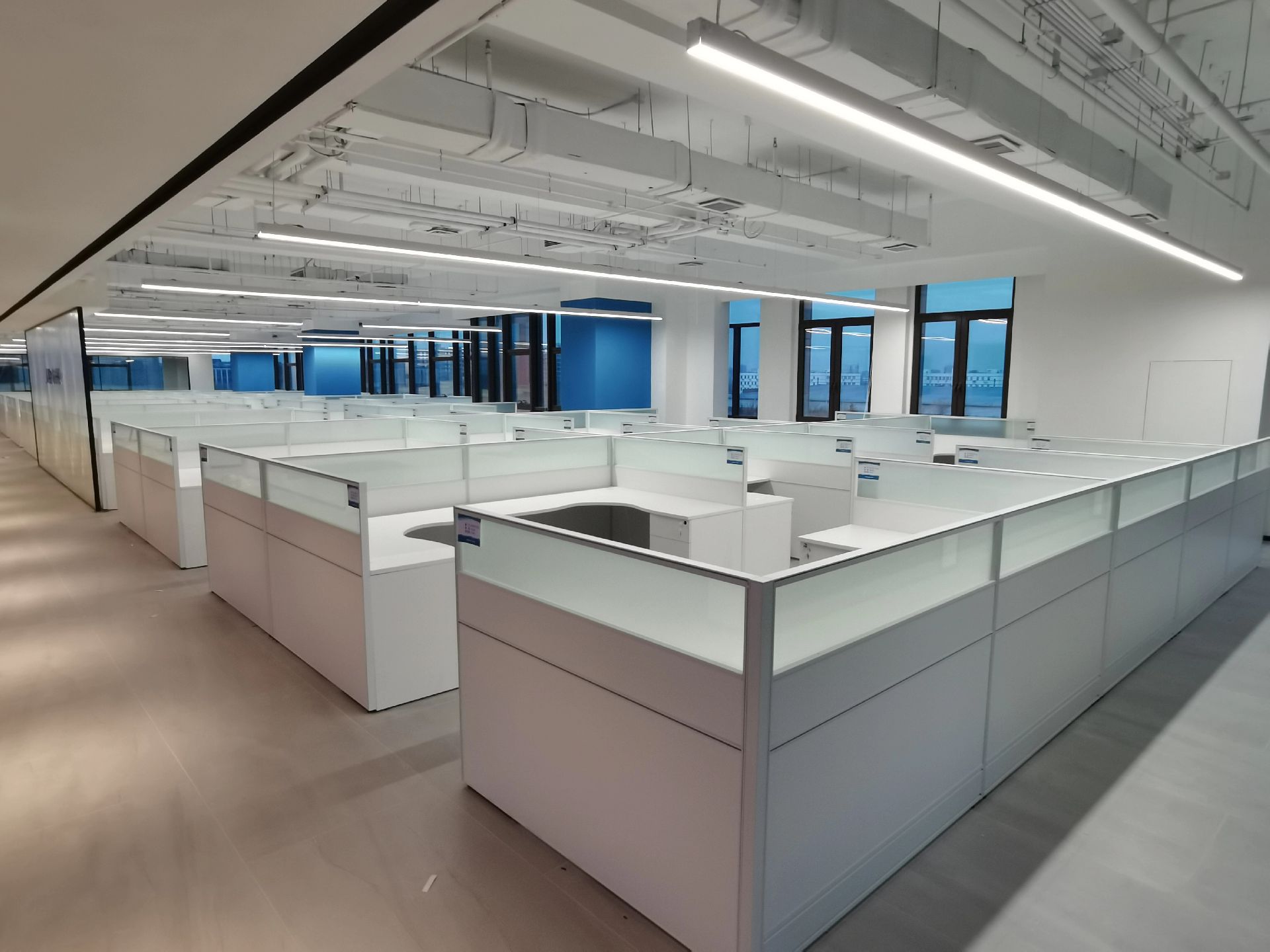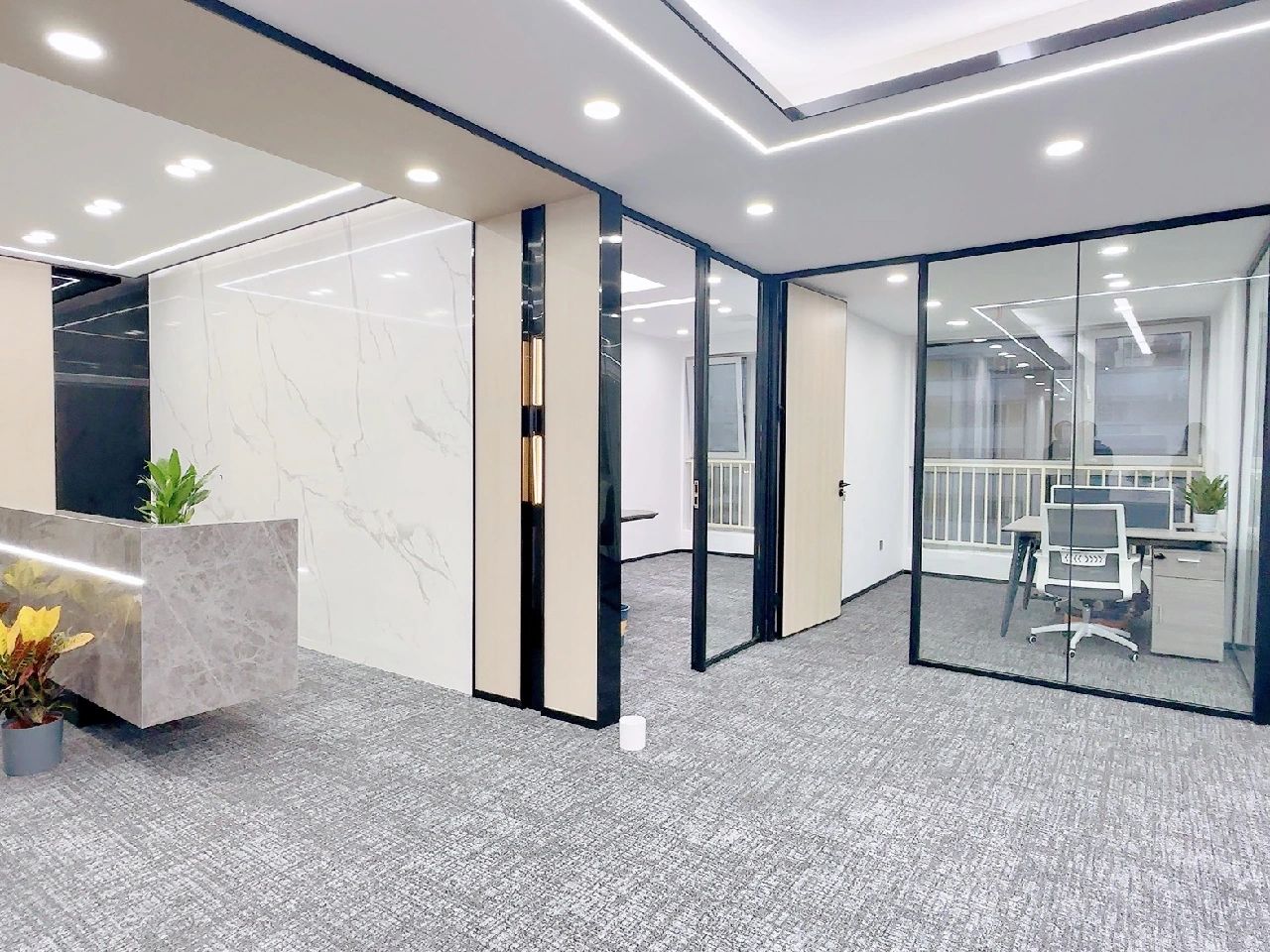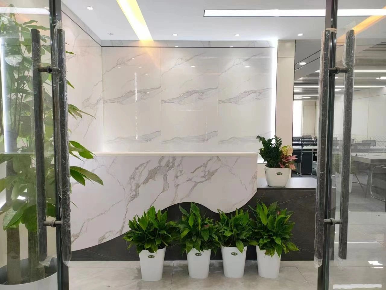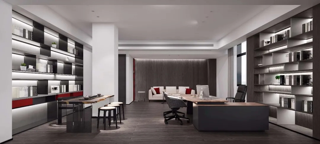 本案中所使用的天际灯设计师要求两条天际灯交错而过,每一条灯的安装支点标高都不相同,对于灯具的安装都带来的很大的挑战 。顶面的镜面不锈钢从前厅天花一直延伸到会议室,界定了交通动线的流向,在空间上释放空间的高度,使空间在视觉上得到延伸。