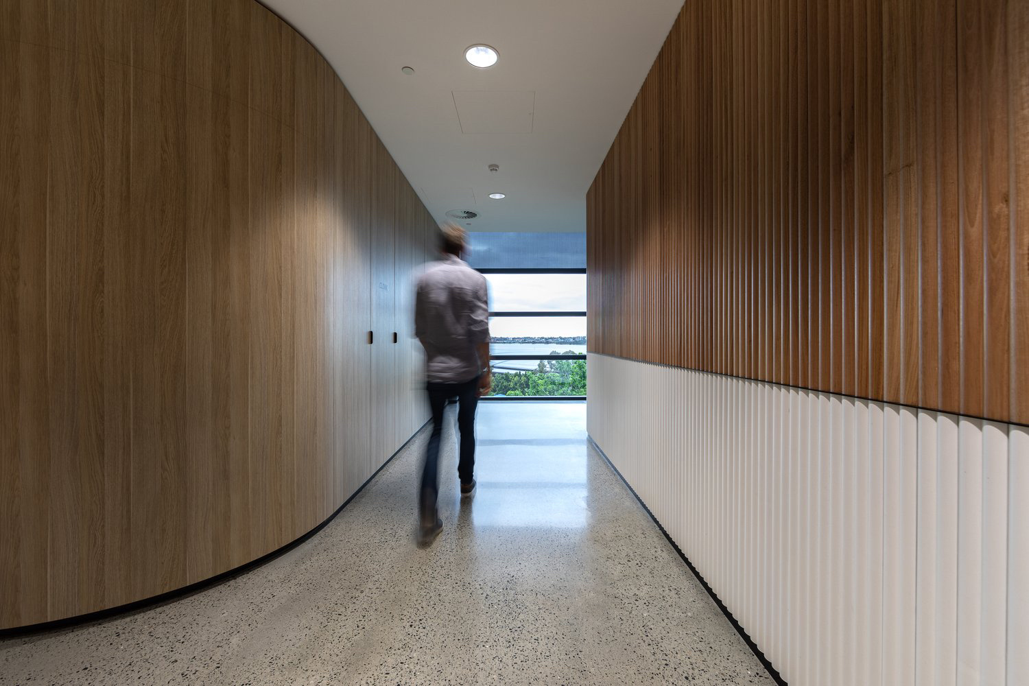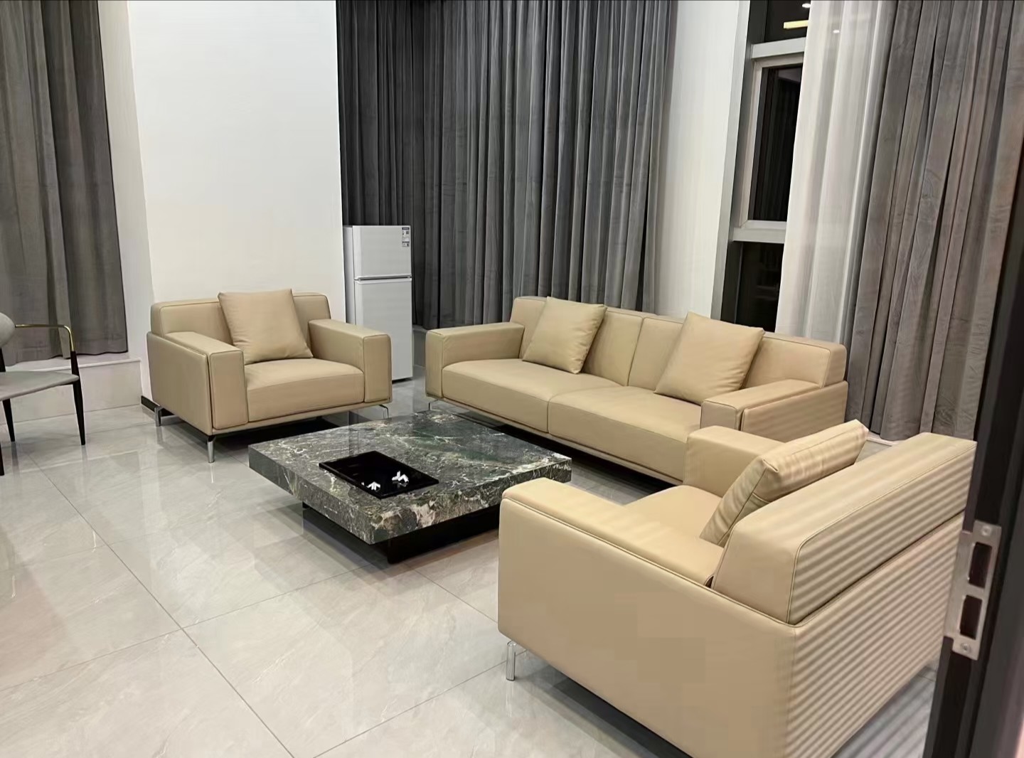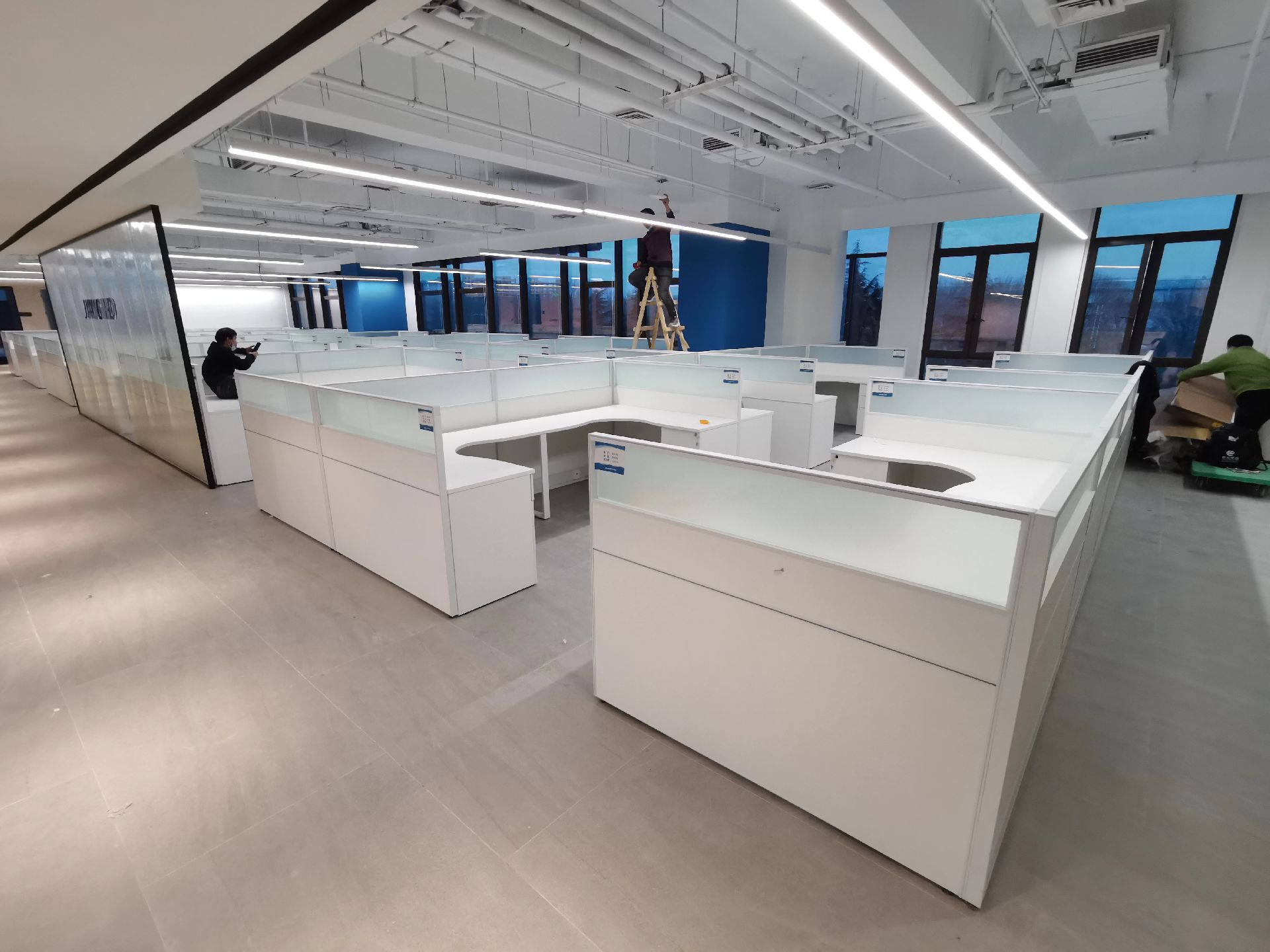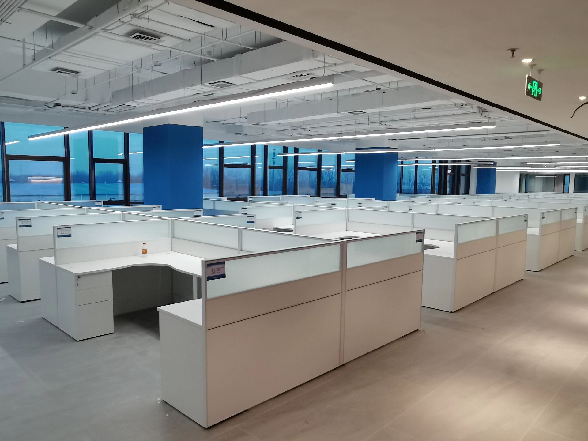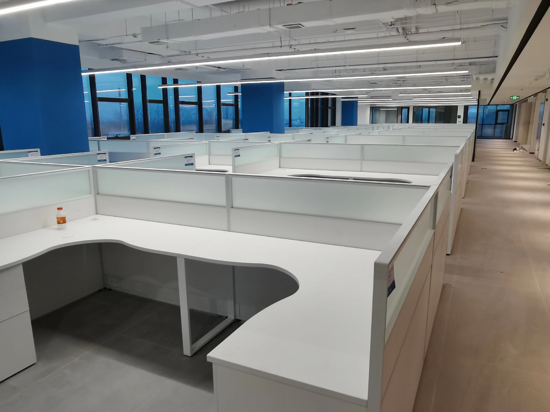 本案中所使用的天际灯设计师要求两条天际灯交错而过,每一条灯的安装支点标高都不相同,对于灯具的安装都带来的很大的挑战 。顶面的镜面不锈钢从前厅天花一直延伸到会议室,界定了交通动线的流向,在空间上释放空间的高度,使空间在视觉上得到延伸。