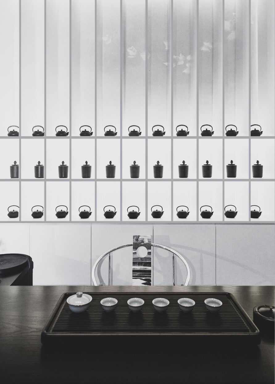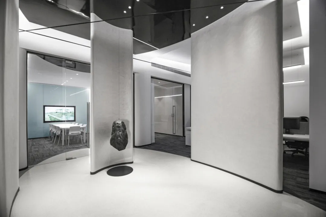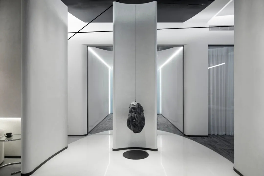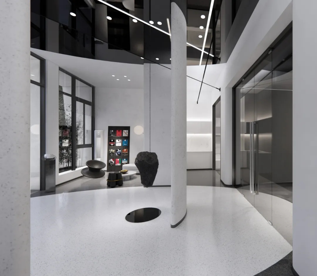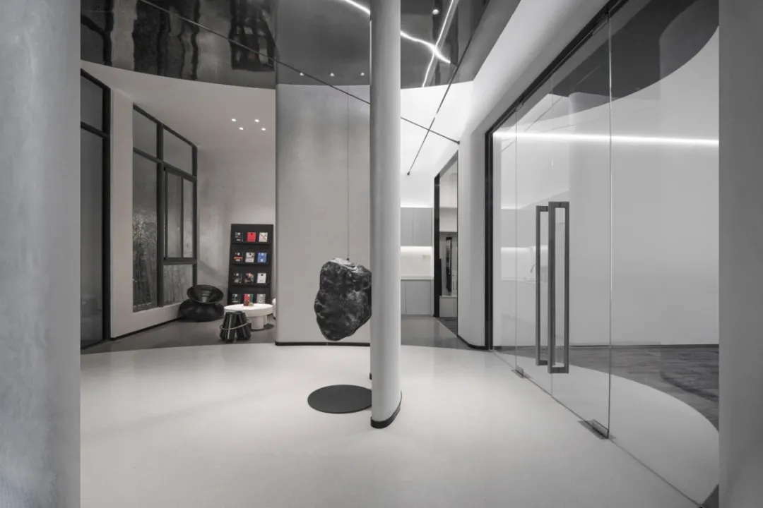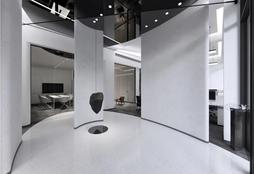 运用陨石和黑镜这两种粗糙和光滑的肌理,去除冰冷而强烈的造型,着力建设一种言有尽而意无穷的空间意境。