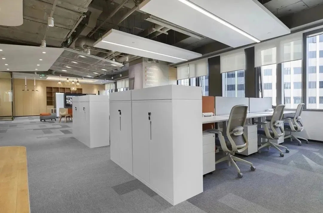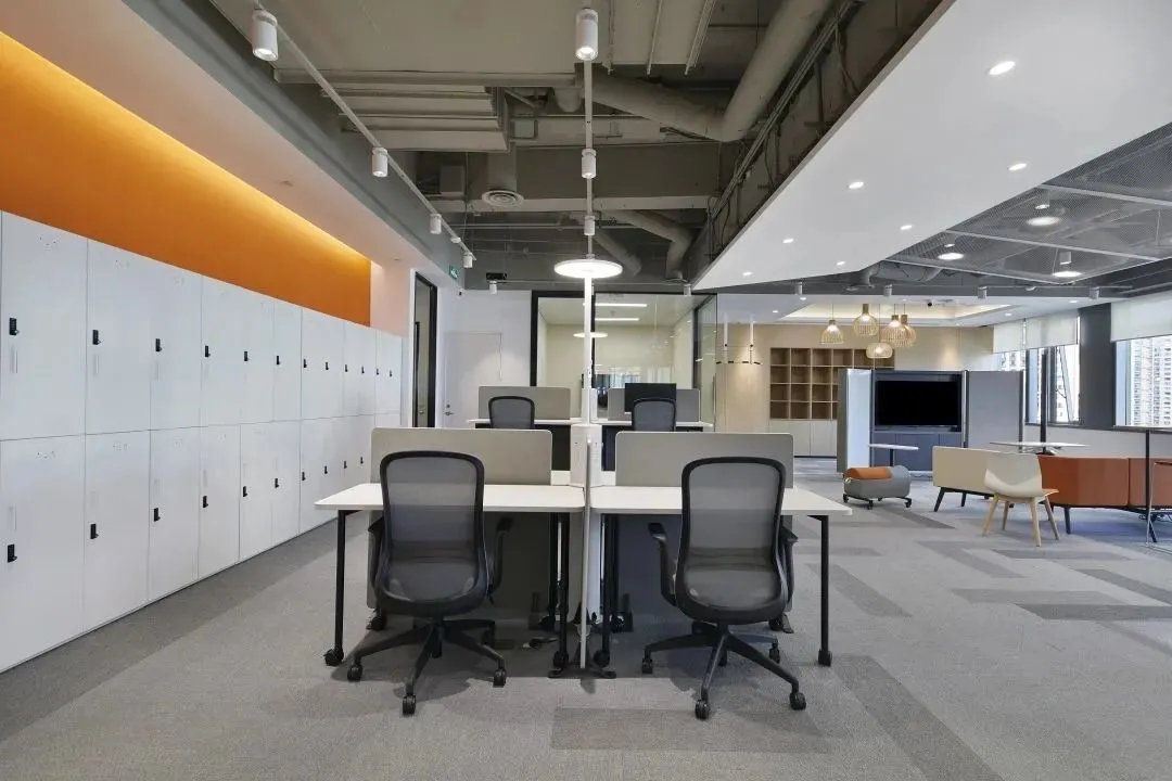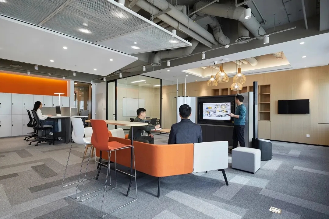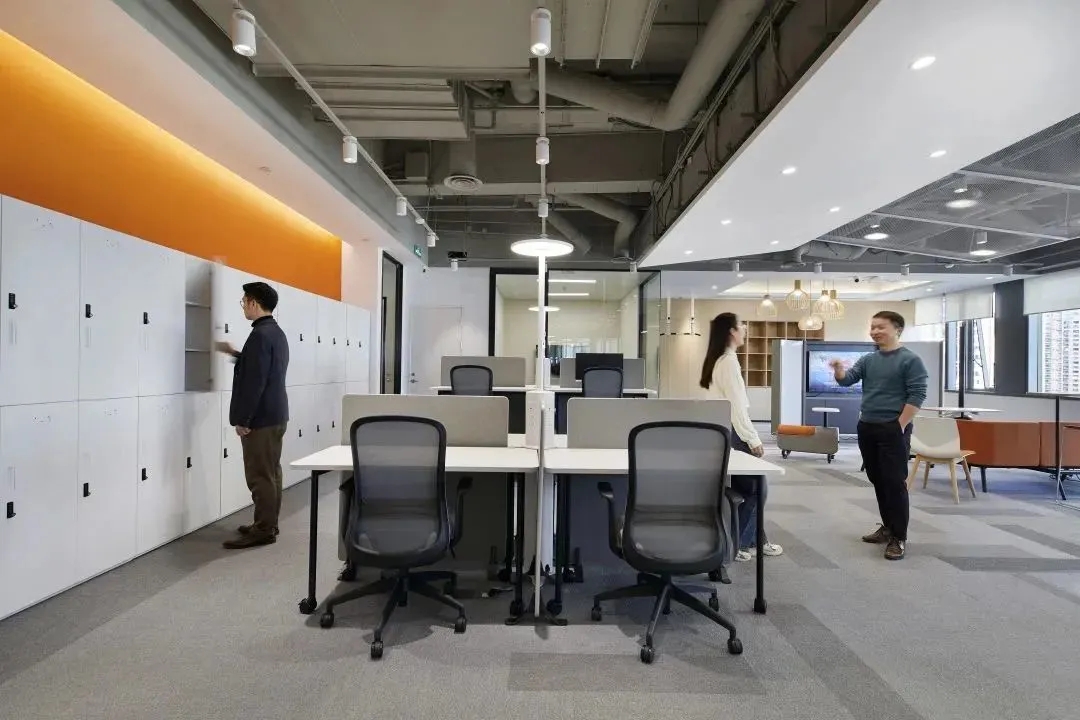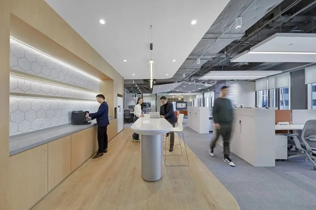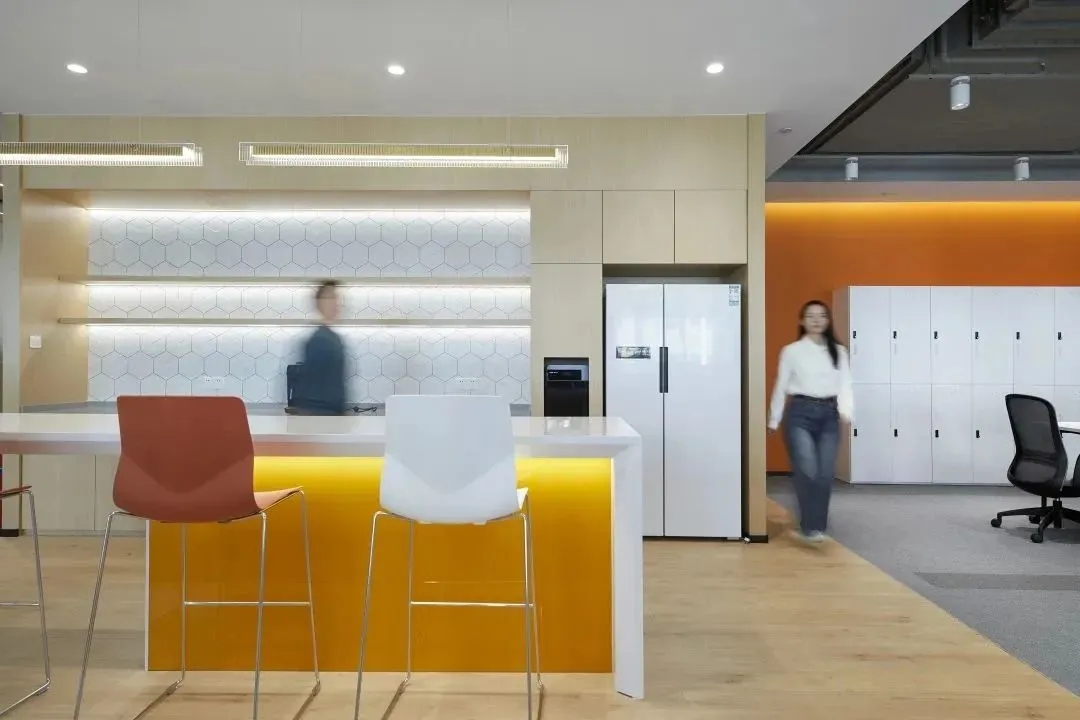 企业已经开始关注久坐不动的工作方式所带来的健康问题。因此鼓励员工流动起来,增加活动量也是本案的一个重点,设计师在开放员工区周围配置了各种休闲的座椅、沙发和桌子、吧台、还有高度可调的办公桌、人体工学座椅、健身器材及可自由组合的办公家具,这里员工可以根据自己的工作需求选择最舒适的工作方式,鼓励员工不定时在办公室里走动,以促进健康的工作方式,这也正体现出康稳关爱员工身心健康的企业文化。