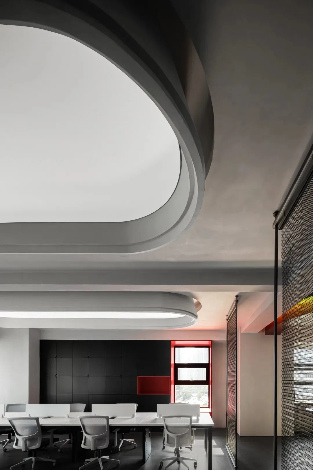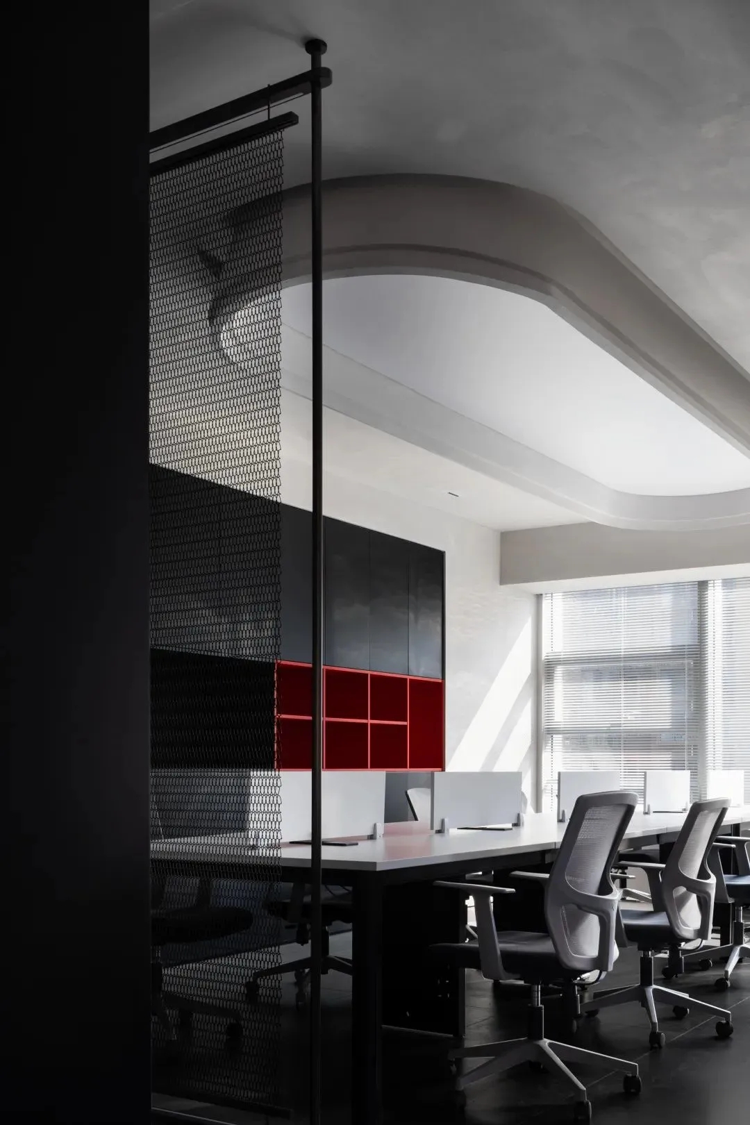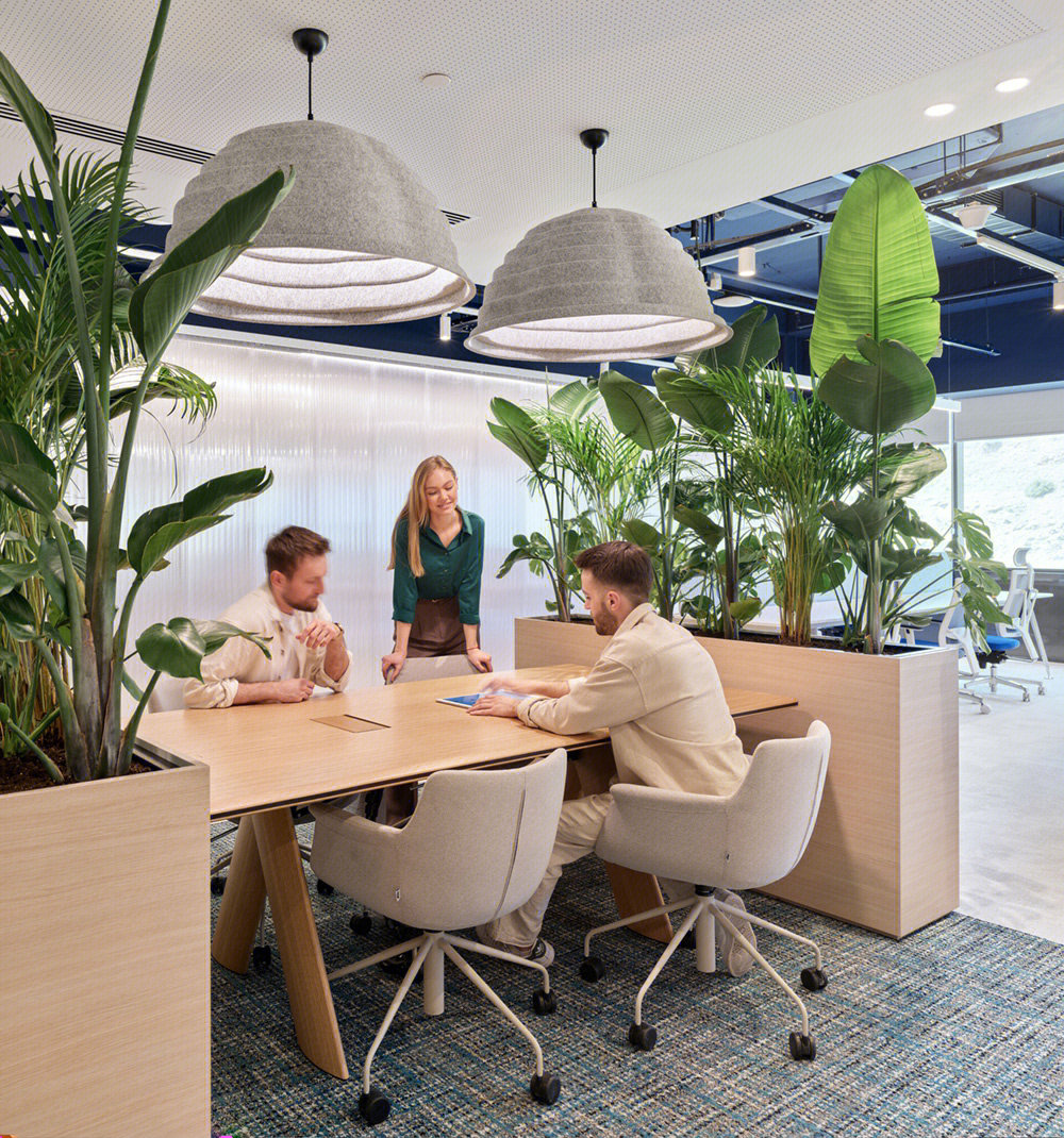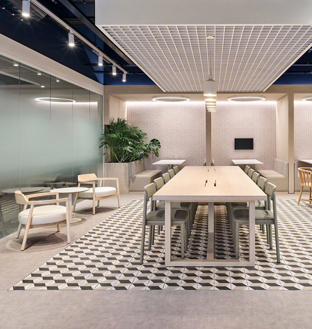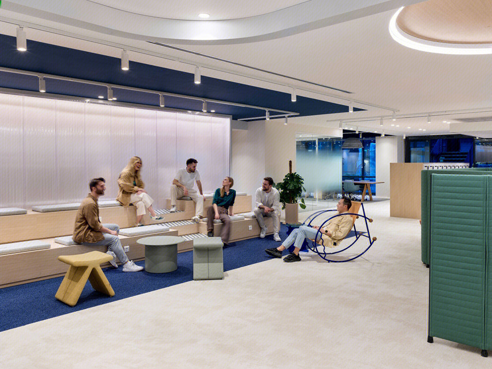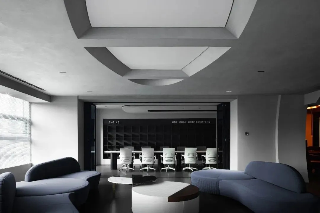 开放办公区打破传统的封闭布局,办公与休闲长条岛台空间的交融,在空间中形成一种更开放更自由的交流及办公空间氛围。