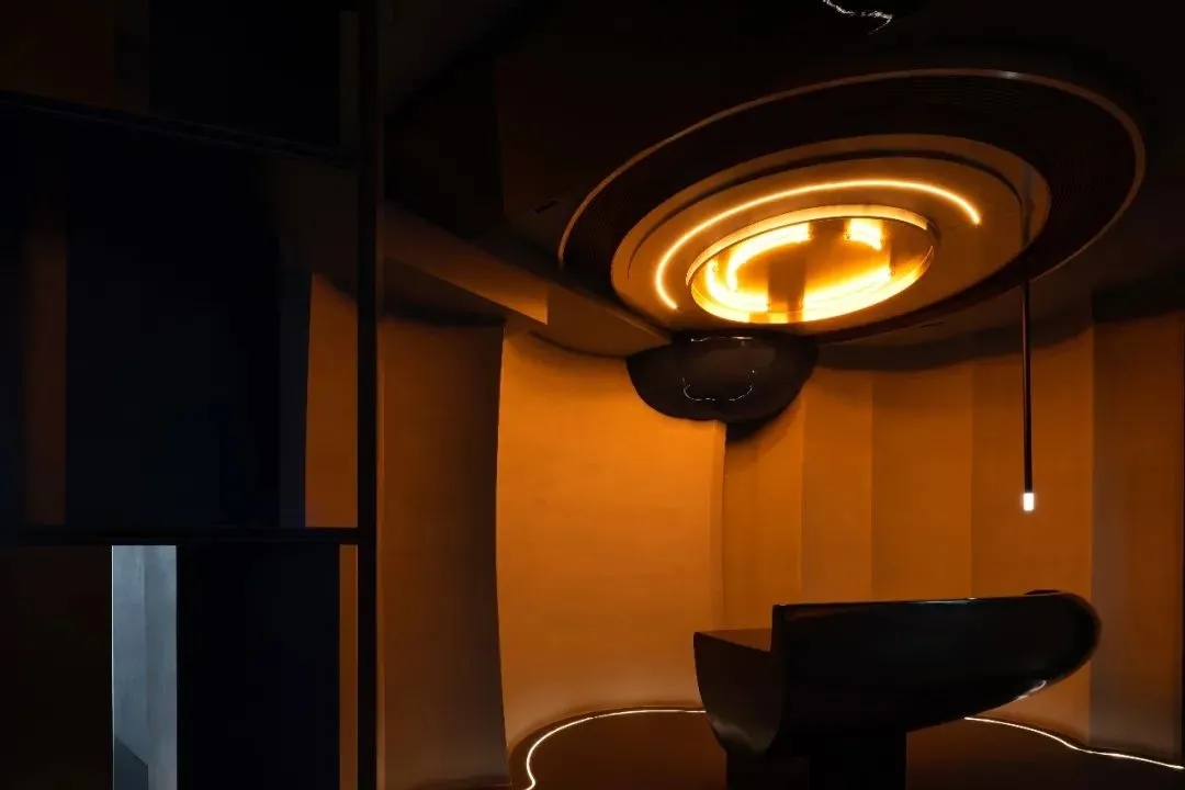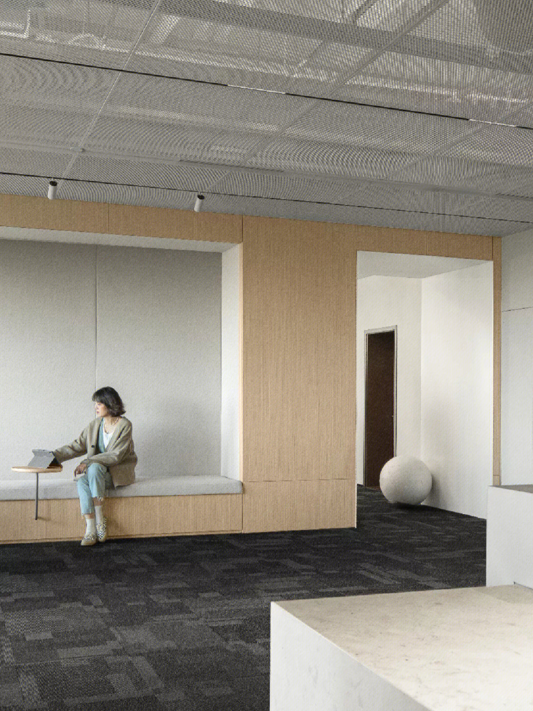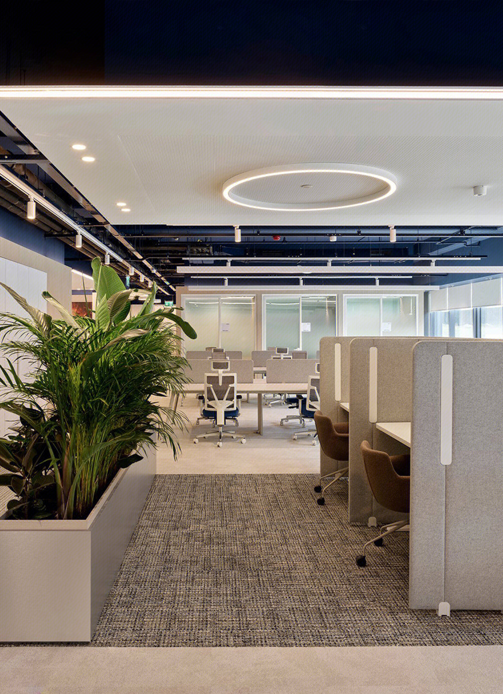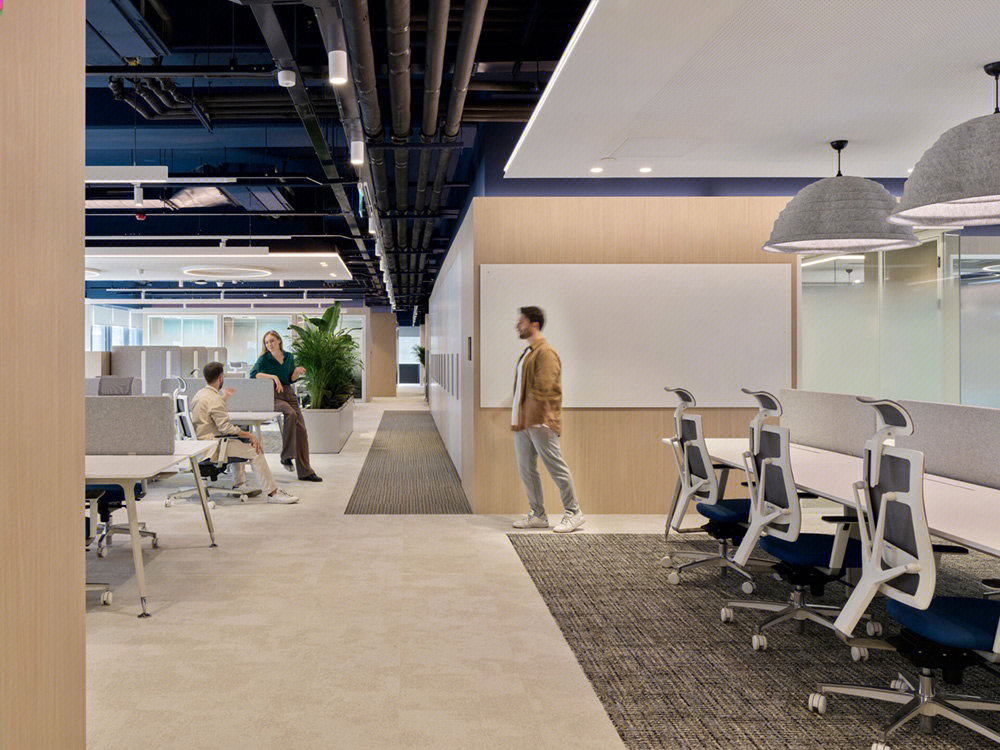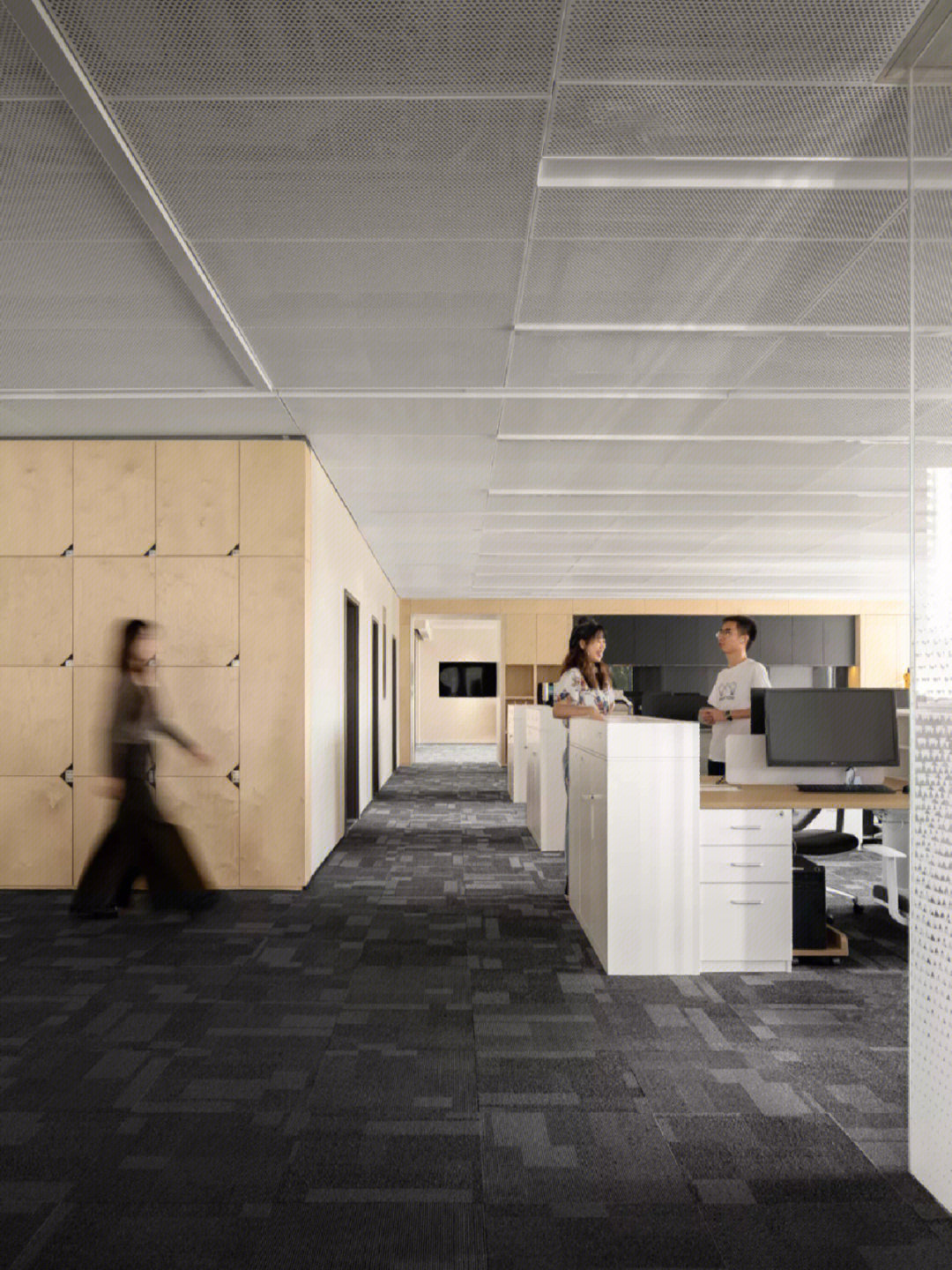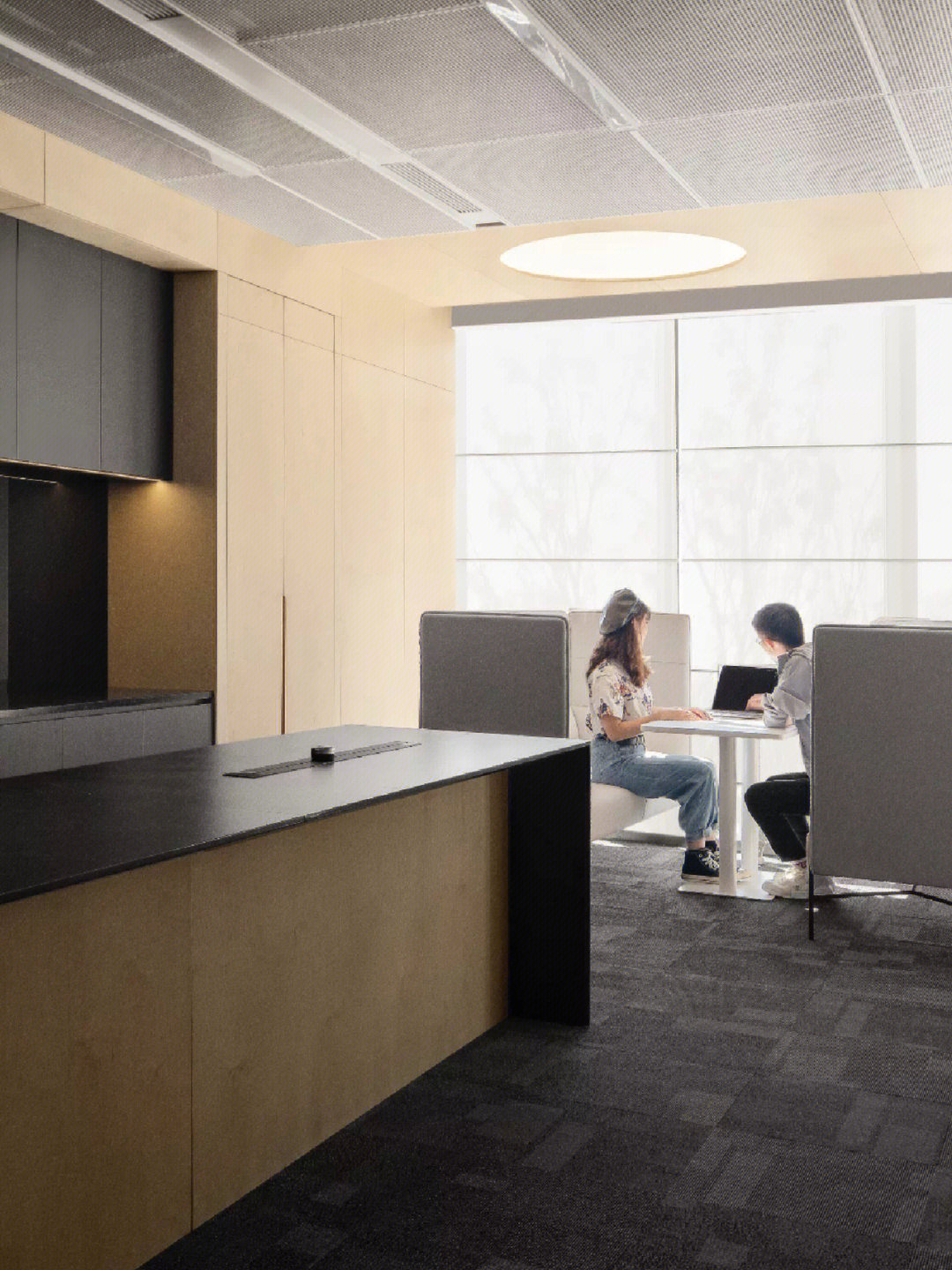 开放办公区打破传统的封闭布局,办公与休闲长条岛台空间的交融,在空间中形成一种更开放更自由的交流及办公空间氛围。