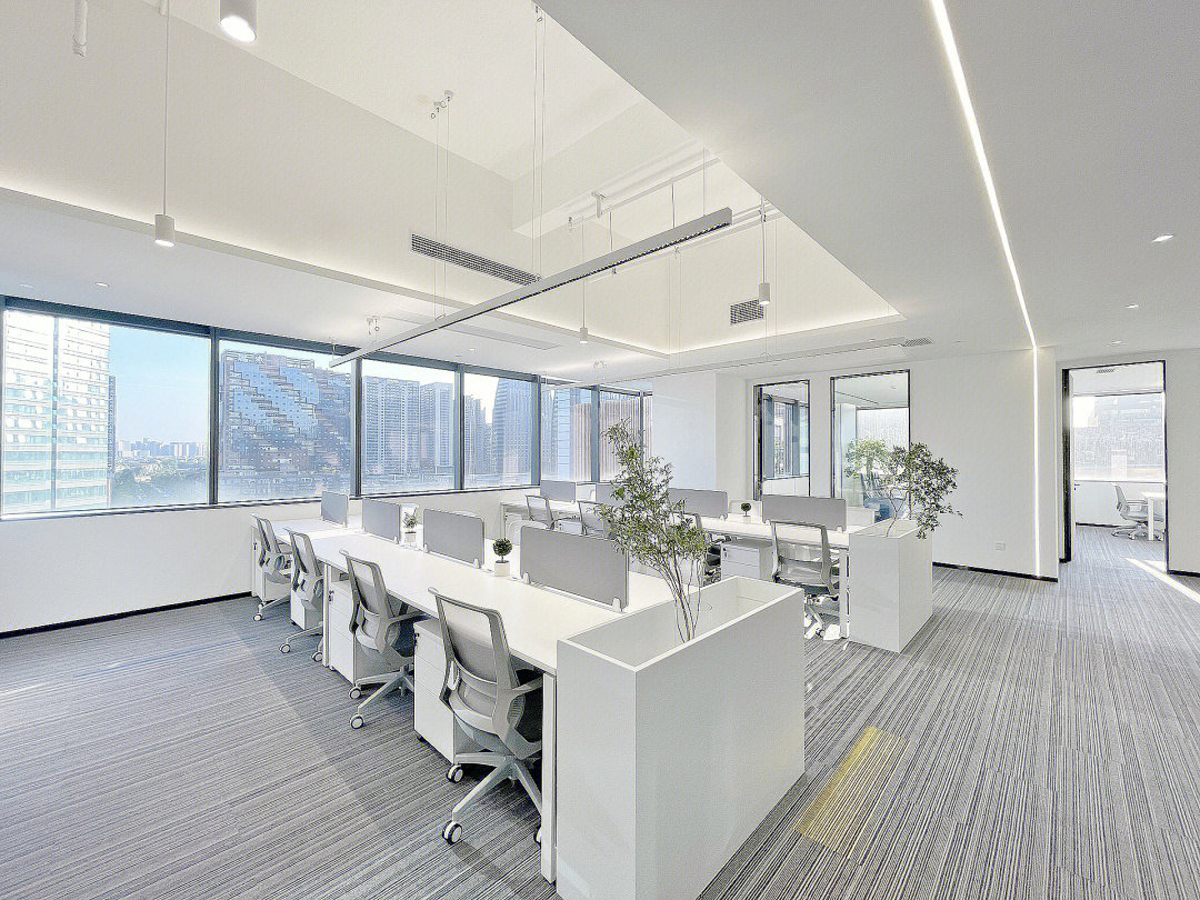 办公区域设计主要以简洁为主,让空间看起来更大气通透,简约的灯饰、科技感色彩明快,让空间表现出灵动的气质。