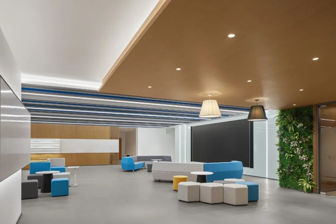 室内空间由功能家具和装置形成自然分隔,空间整体因祛除隔断而产生了流动,这与科学巨匠斯蒂芬·霍金的宇宙观具有一种相通性。Robbie太空兔和陨石一起来到这里,被安置在接待台和会议室中,向来访的人们讲述宇宙的故事,犹如那些激动人心的创业事迹一样,源于有限的奇点,产生突破界限的无穷能量。