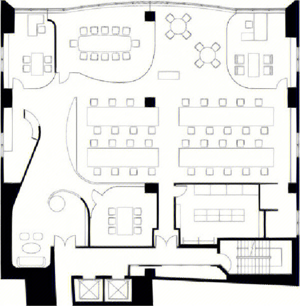 整个办公空间的格局呈“半回字”状,公共办公区分别位列空间的两翼处,设计师依据不同工作属性,在两个公共办公区配备不同的辅助空间。