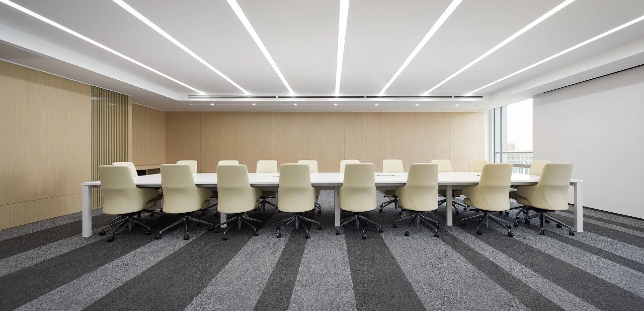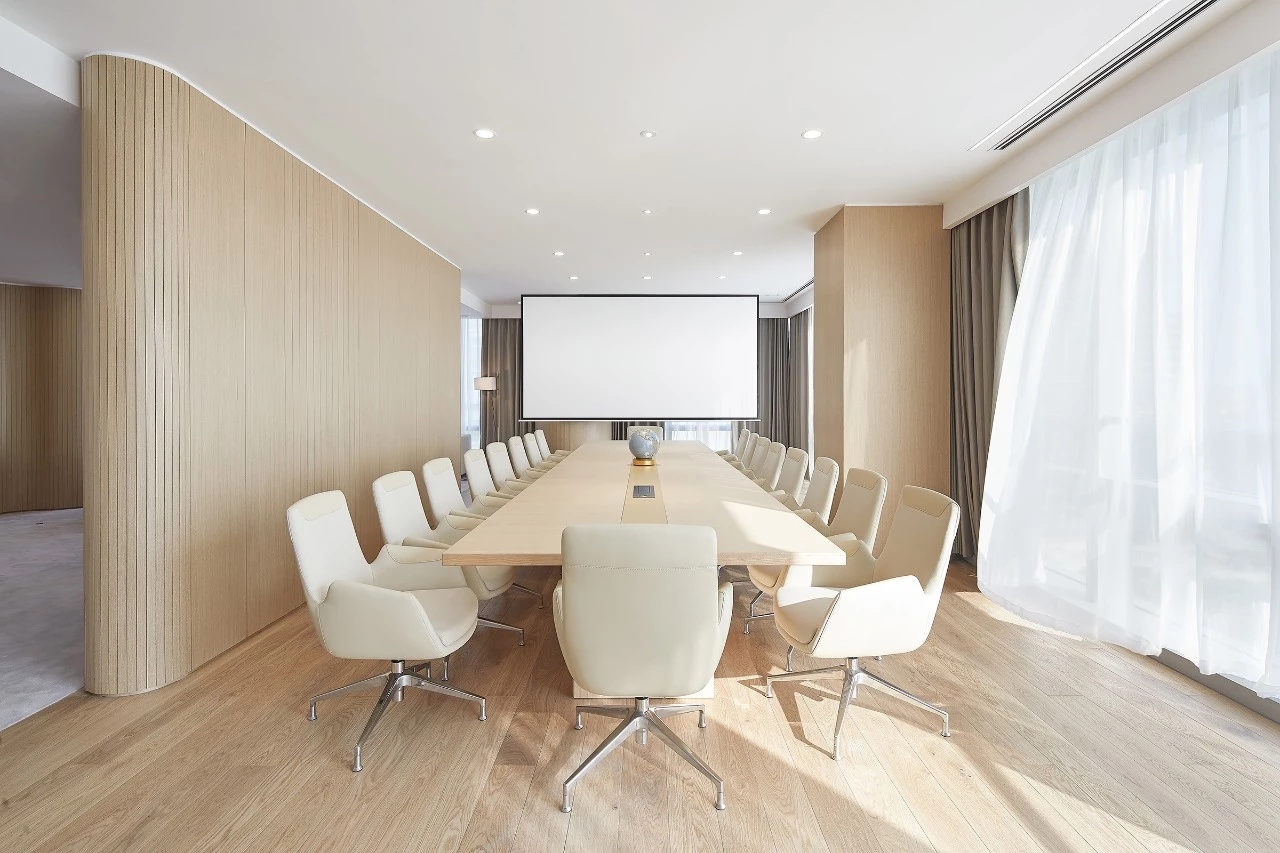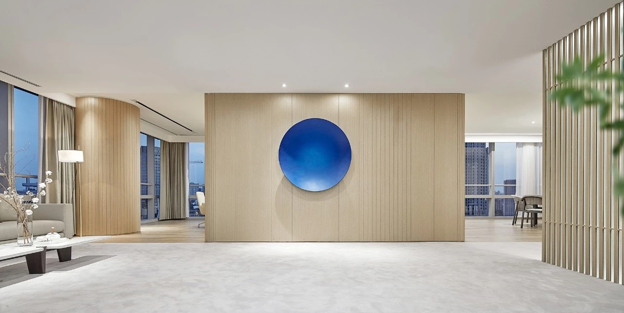 区别于常规办公区中用到的红色,自带艺术气息的克莱因蓝,为整个空间预留了想象的空间,从艺术家安尼施·卡普尔的作品获得灵感启发,置入的蓝色圆盘犹如空间沉稳静谧的灵魂,在总裁繁忙的会议中打开了放空、思考的绝佳契机。越过木质栅格,收获一片明净而开阔的办公格局。柔和的木质墙体,围合出放轻松气氛;简洁利落的线条组织,节奏明朗,勾勒出空间低调而谦和的气质。