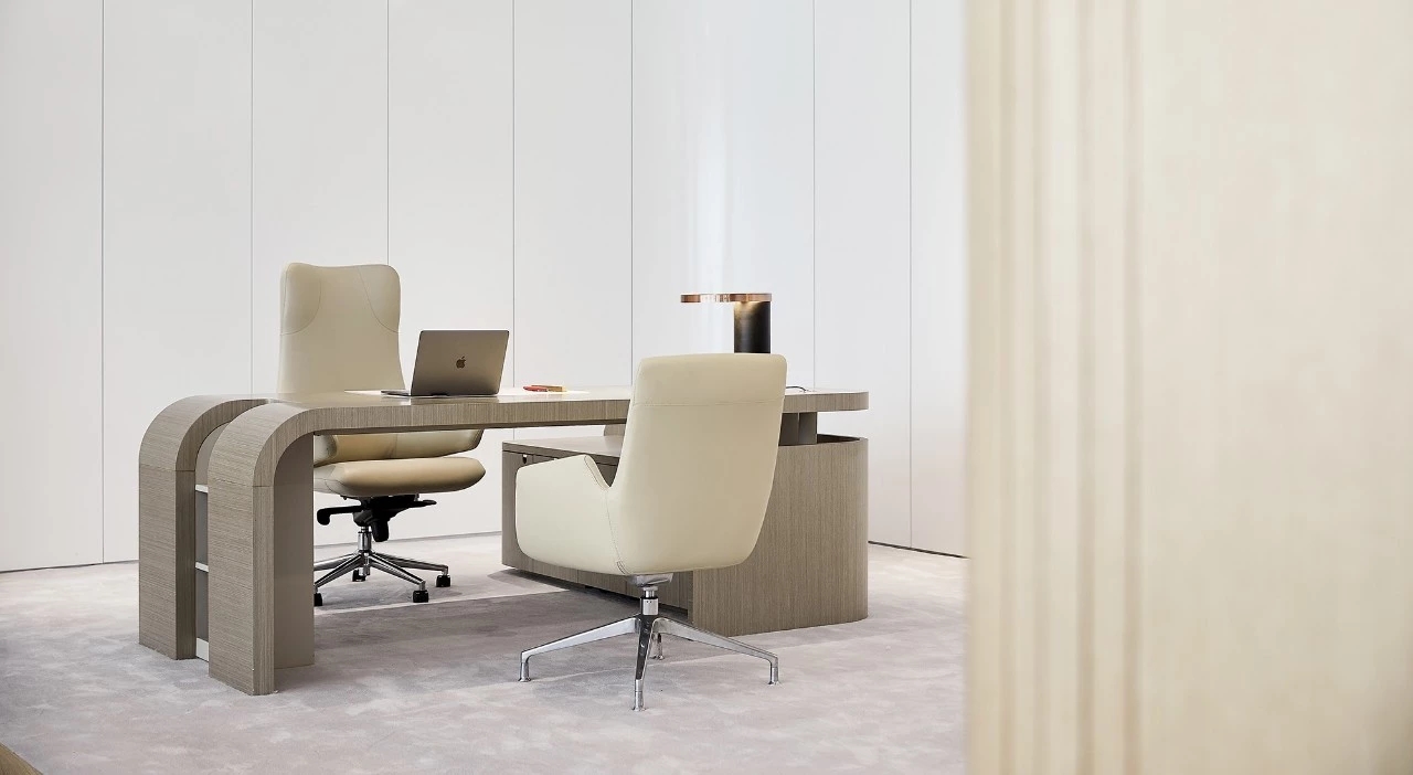 年迈的副董事长坐享的办公空间,更彰显沉稳气质。空间以木皮、皮革、金属的拼接组合构建出深浅有度、层次分明的感官体验。艺术品的置入,渲染出空间的份量感之余,构成视线的引导和虚化的空间分割节点。此起彼伏的空间节奏,构成一幅精致耐看的平面,适宜使用者长时间逗留。
