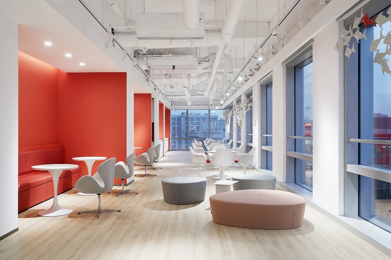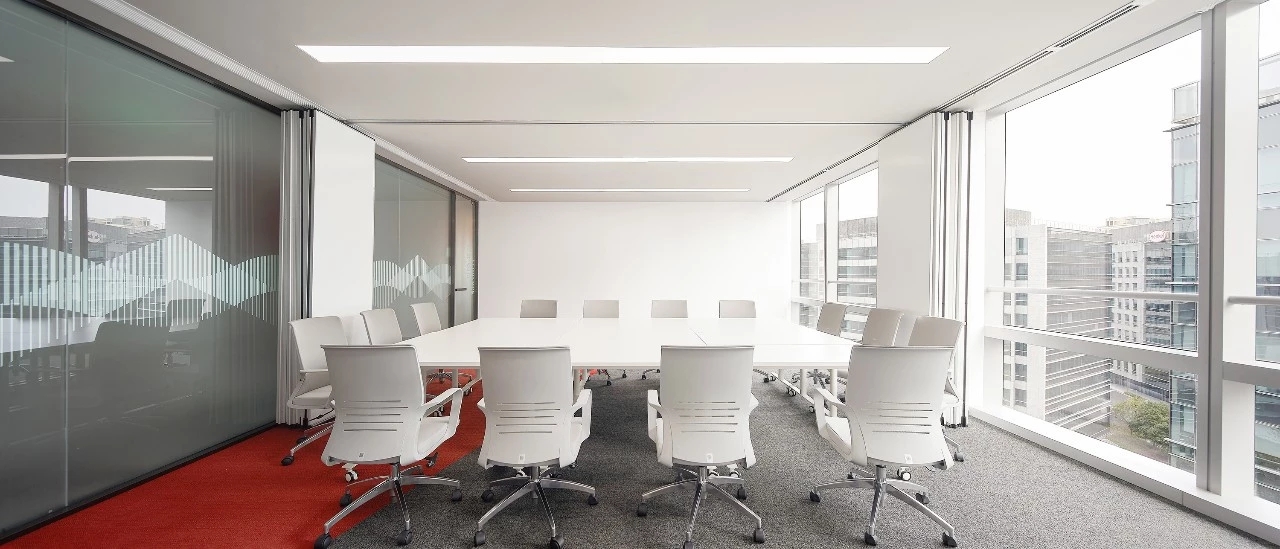 中型会议室同样使用品牌色作为墙体色,活泼的红色不但能够刺激大脑提高员工对会议的参与度,同时也能减少空间使用时间,实现会议空间的高效利用。为群体讨论创造了机会与条件同时,设计师配置可书写的白板及视讯系统,使创意表达的可视化更方便,让空间成为创新的工具。企业文化内容也可以在干净的墙体上进行平铺展现。