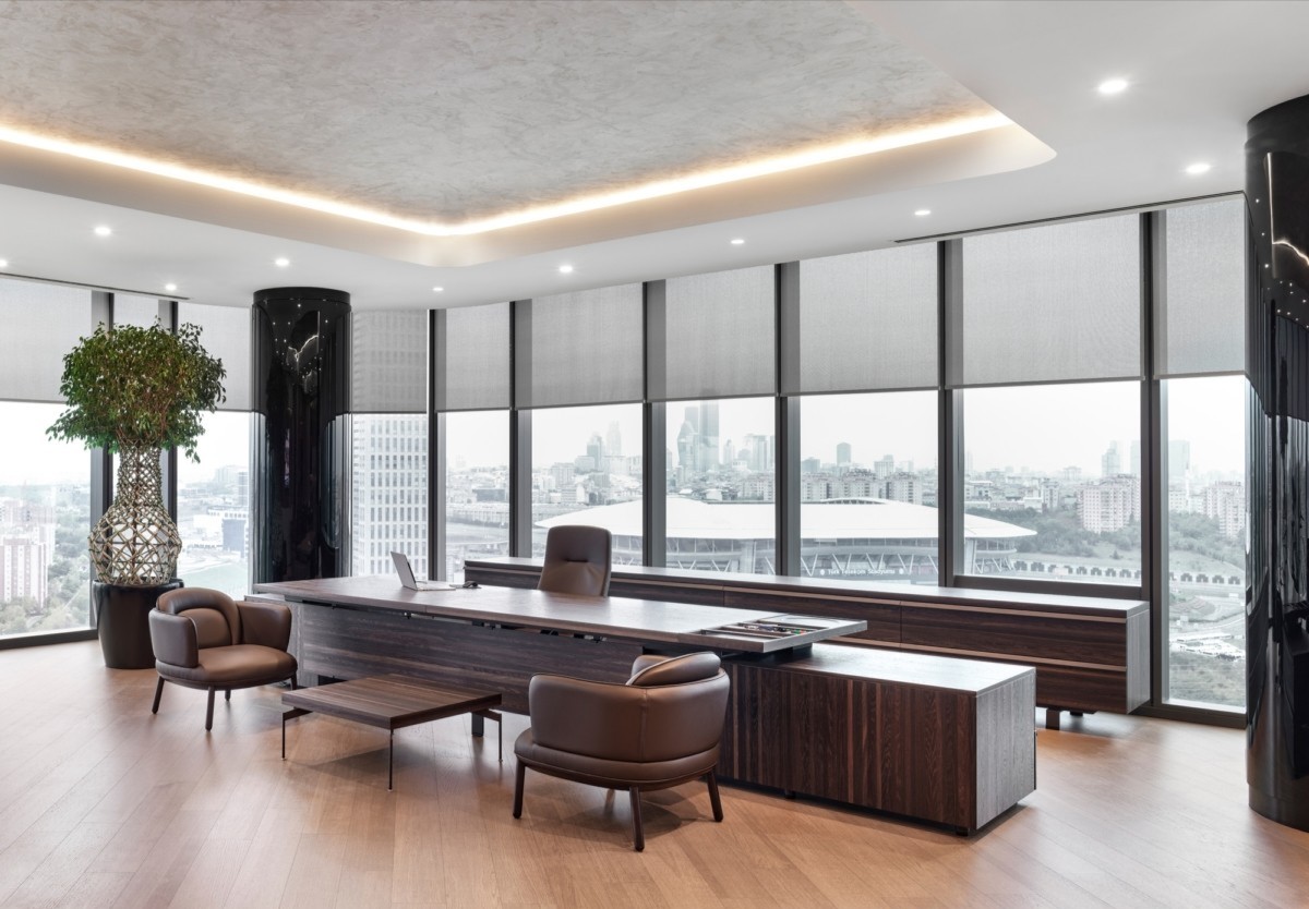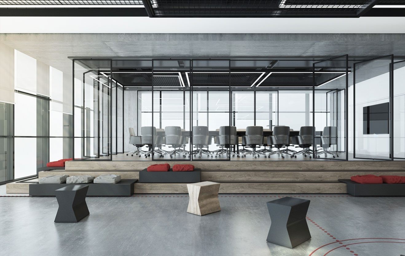 接待区的设计未来感十足。接待台前后两侧的墙面采用了金属材质的面板装饰,与天花自成一体;接待台的造型如同一列正在飞速穿越隧道的高速列车,一侧墙面上的拱形开口形似隧道的入口,具有高反射系数的可耐丽人造石创造出一种火车行驶而过的错觉。穿过“隧道”后会进入一个多功能大厅,包含一个带有模块化沙发的开放协作区以及一个露天剧场,剧场主要用于举办讲座和演讲等公共类活动。“都市感”是设计师想要在这一区域呈现的空间风格,这一点,从墙面上绘制的莫斯科与圣彼得堡城市景色图形中可以一目了然地发现。