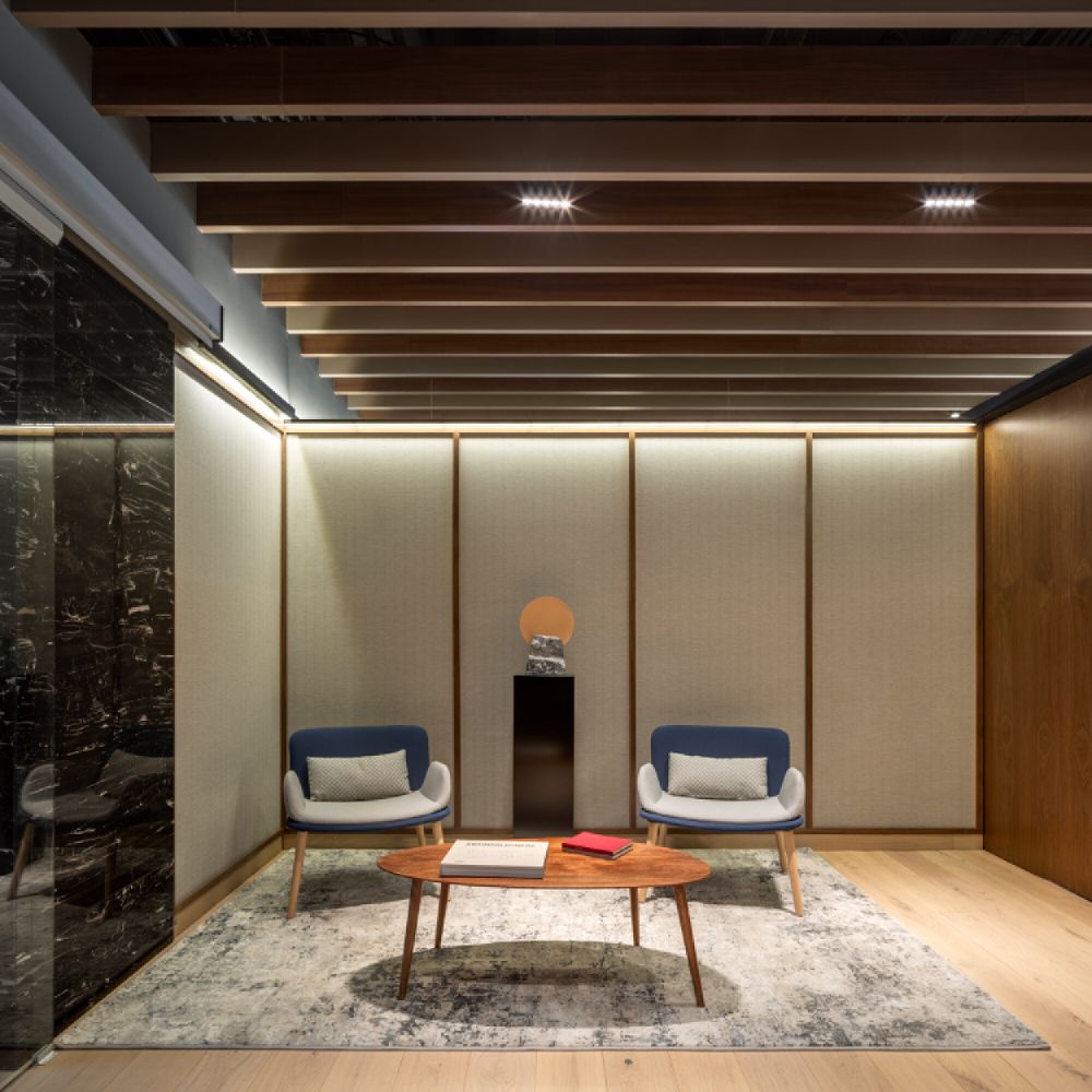 通过精心挑选的亲自然元素、木材和大理石材质,入口处营造出好客的氛围。这些设计元素重申了因美纳对可持续的承诺,并为宜人的空间旅程定调。