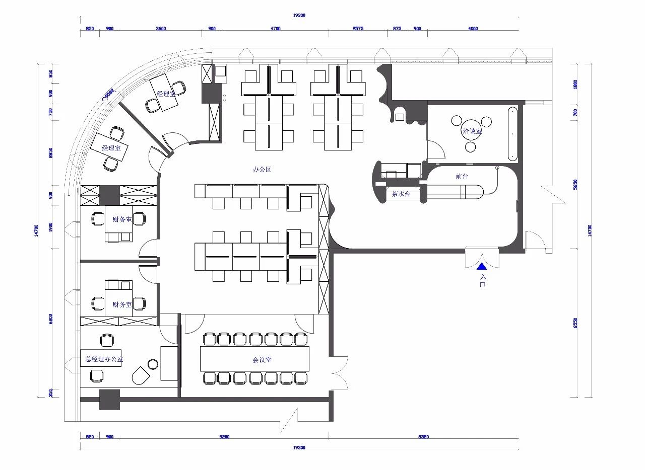 走廊的另一侧延伸是会议室与样品展示区,做到客户活动区域与工作区域的分离,保证洽谈环境的独立性。