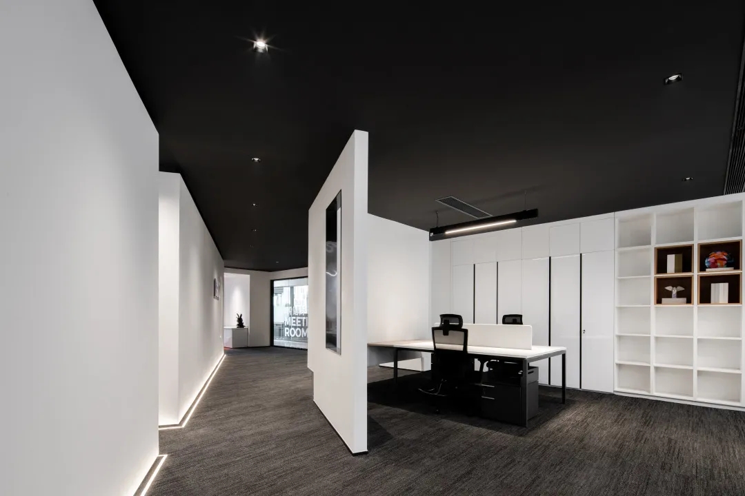 室内是6米的挑高空间,不规则的平面格局,我们利用空间优势,局部挑高,其他区域分割为二层空间,一楼为门厅,接待区,创意1区,经理和财务办公,及吧台,卫生间;大面积应用清水泥墙,和大面积留白,来映衬户外的自然景观,让绿色与阳光充分渗透到室内每一个角落,仿佛户外与室内的界面已不符成在,让每一位室内的人员最大限度的感受绿色,感受大自然,在空间处理上我们制造禅意---静态的美,光影的美,建筑的美,质朴的美,和谐的美,真正做到以人为本的设计理念.