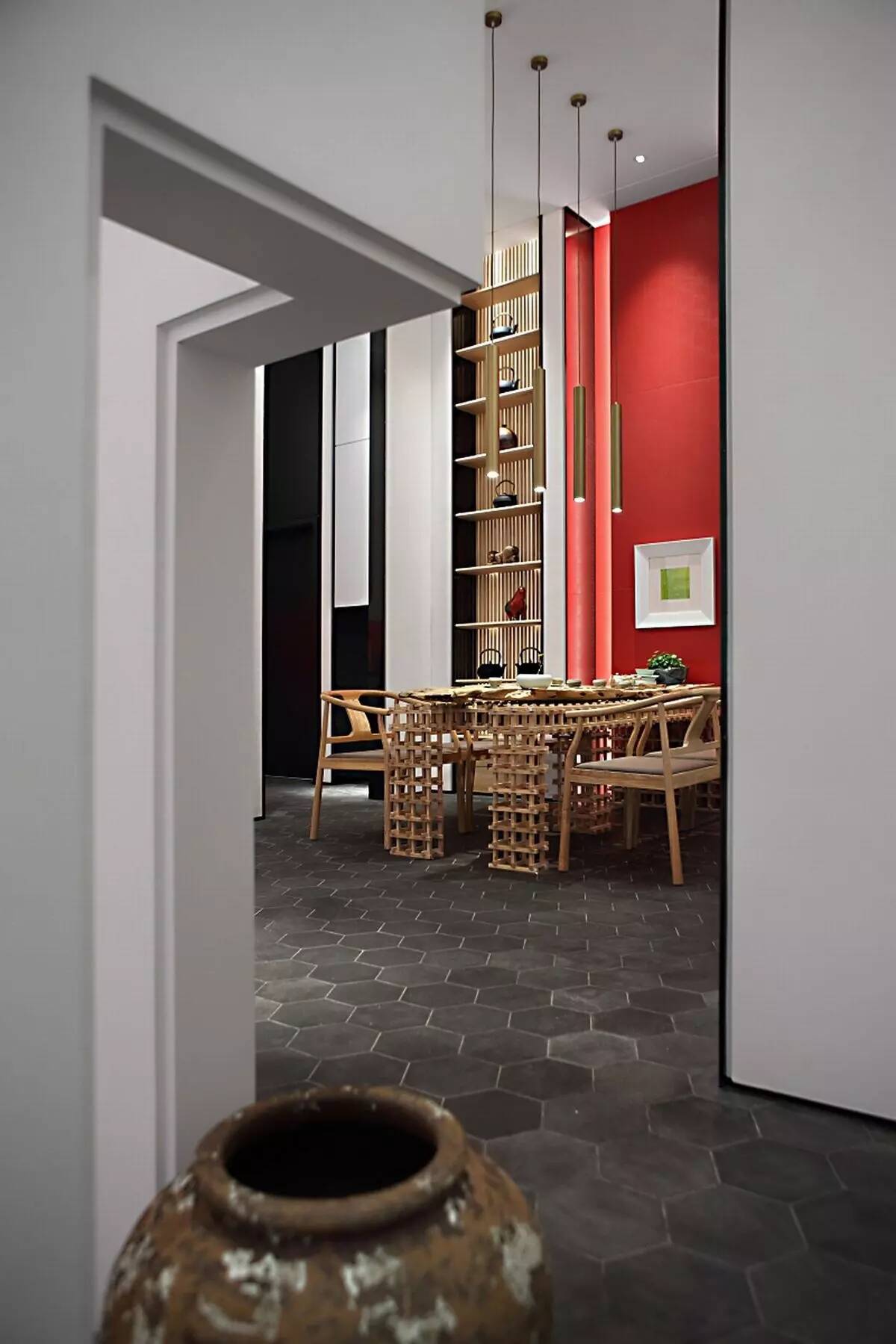 业主的情结中,浸润流淌着对山水、自然、草木、诗画留白等情绪,故而设计中运用五行相生意象化符号为场力赋能,充满暗示与隐喻的简练线条,原有仓库建筑遗留下的红砖墙……以大道至简表达美学意识的认知与体悟,增加审美意象在空间与心理上的韵味。