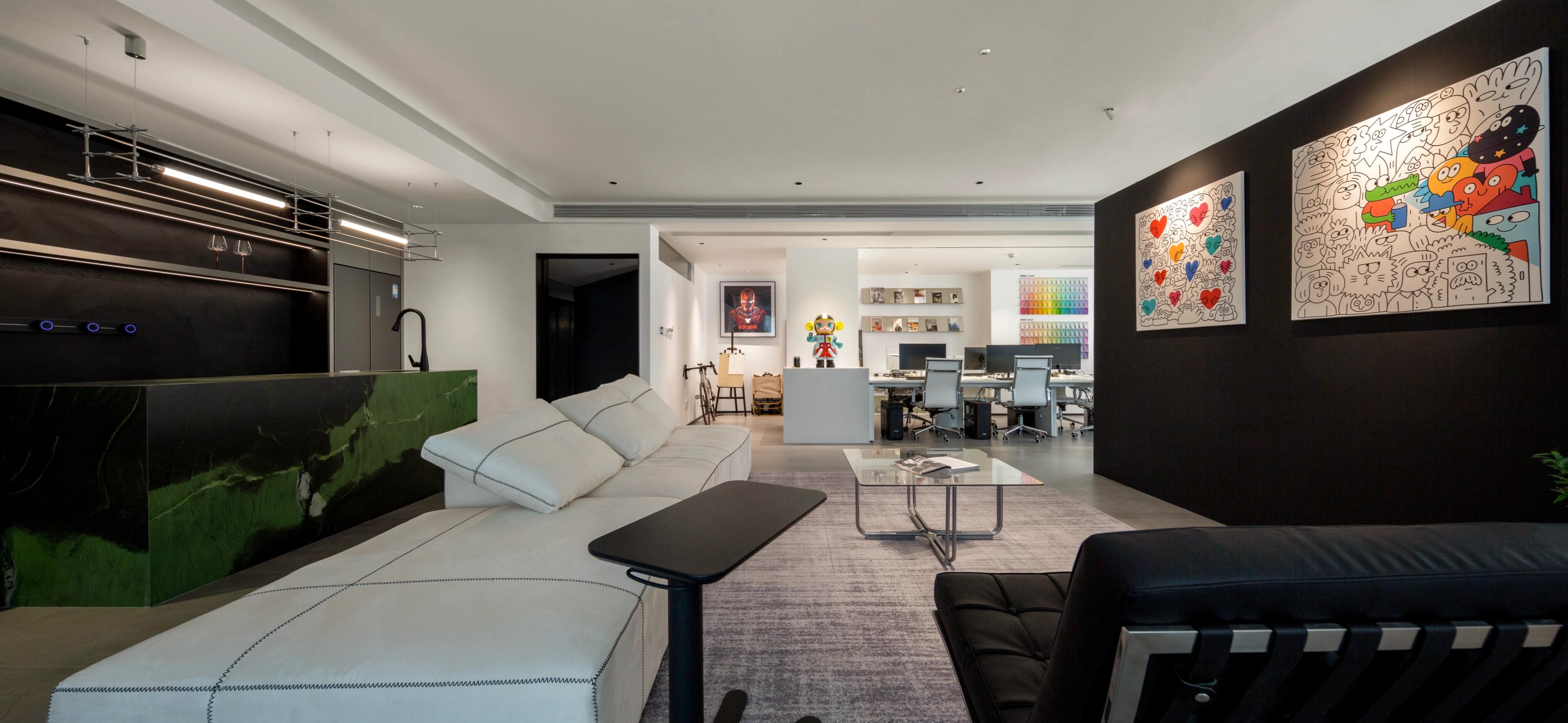 宽敞的客户厨房既能促成咖啡时间的短暂交流,也能举办配有餐饮服务的欢乐时光活动;科技中心的安防情景模拟区犹如私密环形剧场,配备高背扶手椅、八块巨型屏幕、专业音响与柔光系统。动线沿途点缀着产品陈列与演示装置,尽头是正式会议空间。