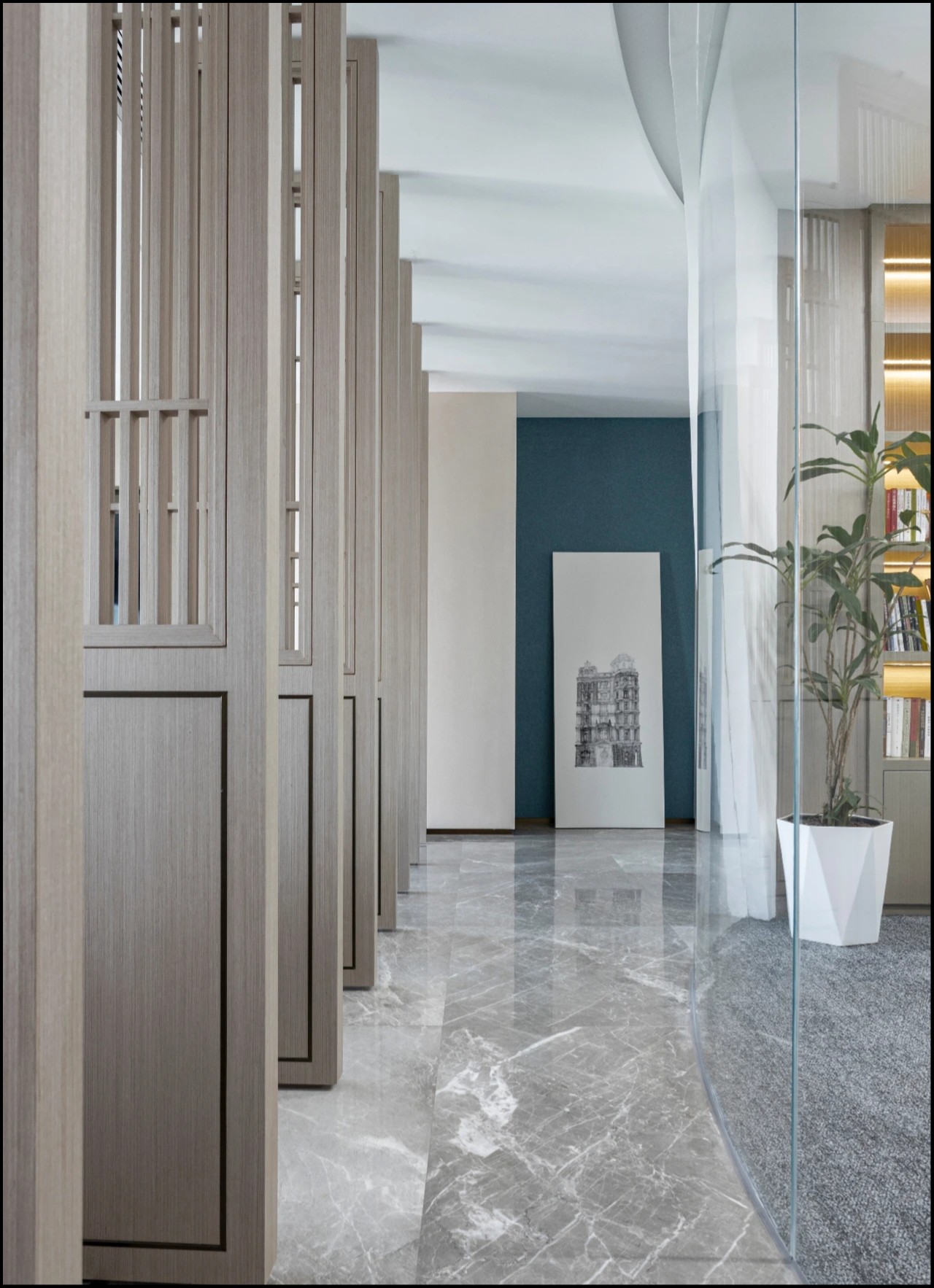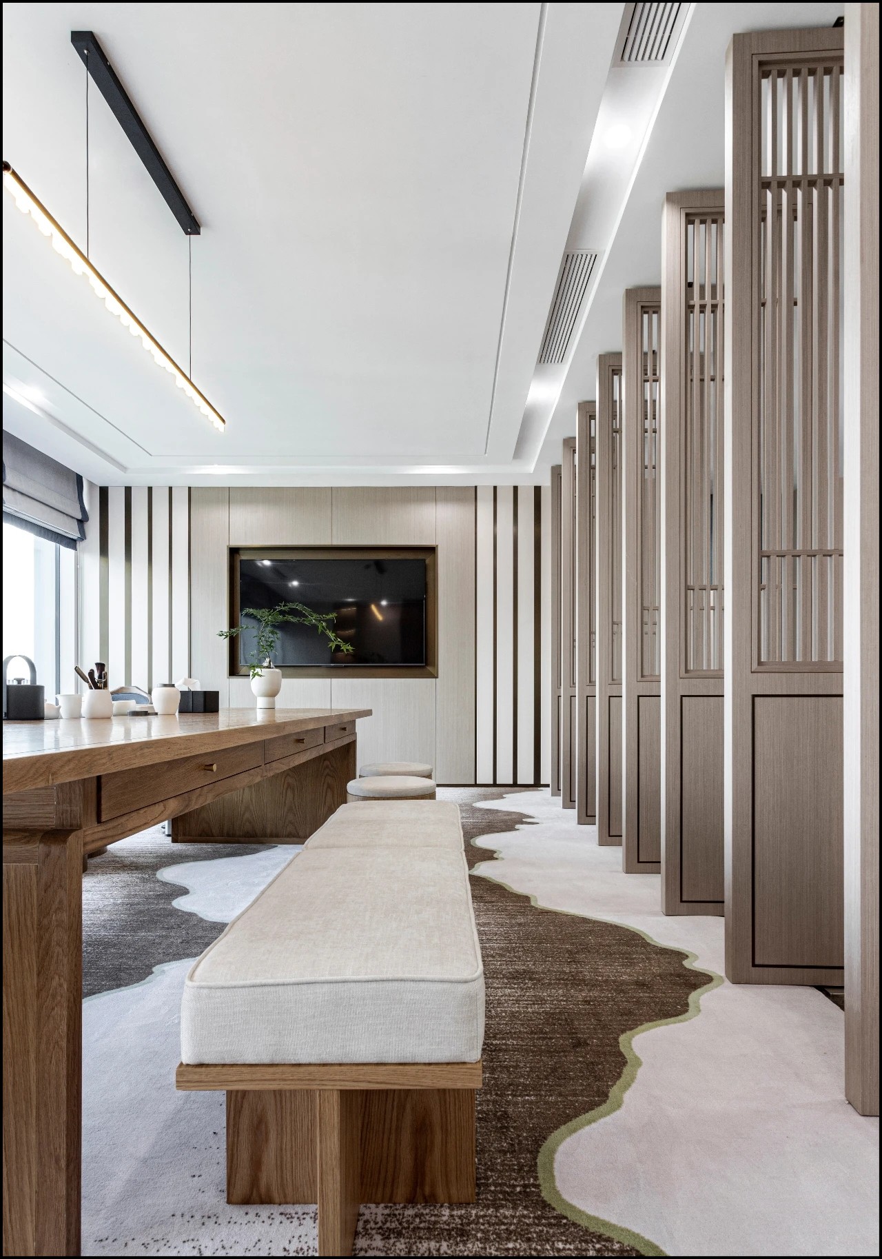 中式的茶室起到空间的点睛设计,不同办公区的设计,以木饰面为主调的空间传达的是素雅轻松的接待与洽谈功能,不浮于表面与浮夸形象。