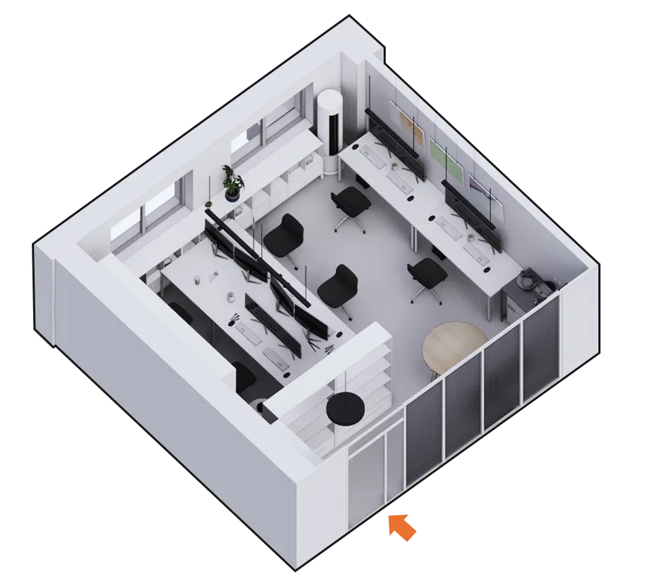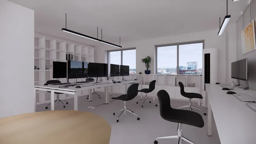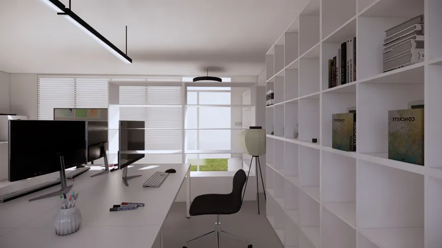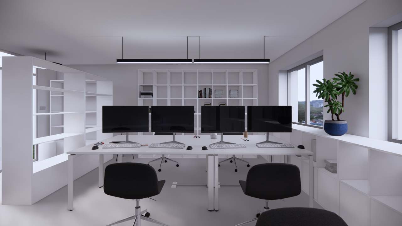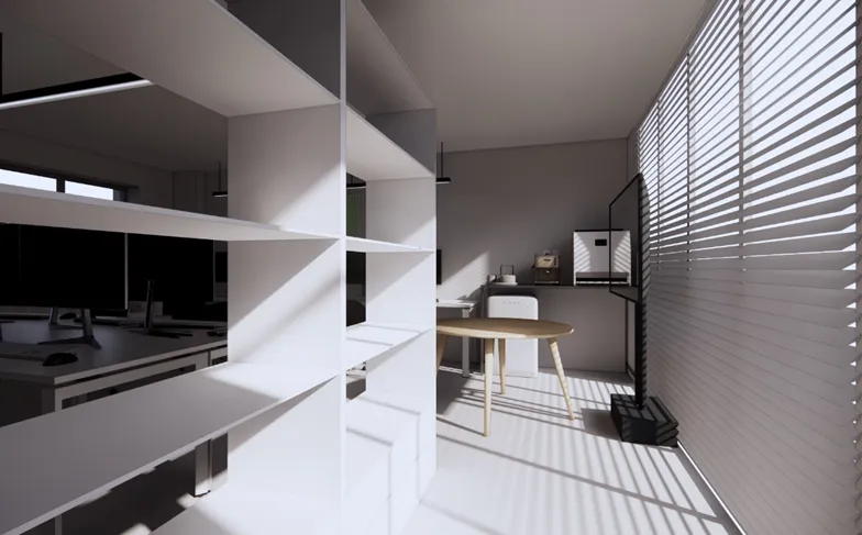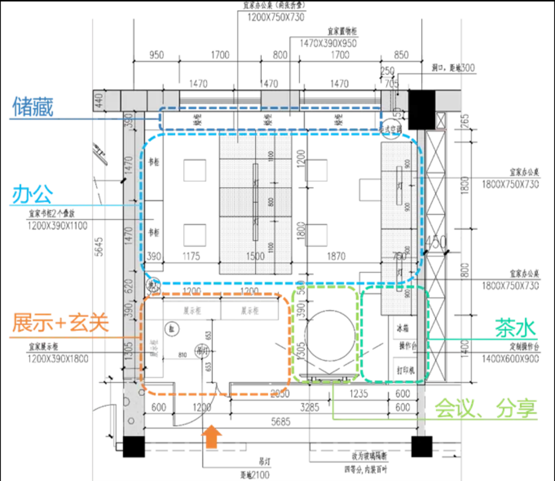 入口处隔墙改为玻璃高隔+部分实体墙,增加呼吸感,实体墙部分为门窗开关提供位置。玄关由高度1.8米的展示柜半围合而成,作为内外过渡;简单的共享空间,以木质圆桌为中心,日常会议讨论、洽谈及聚餐等使用。圆桌紧邻茶水区,方便使用。办公区座椅三排,吊灯底距地约2米,垂直于窗布置,保证办公良好照度和侧向自然光的关系。与书柜墙相对的墙面挂三幅摄影作品,是色彩丰富的视觉点。