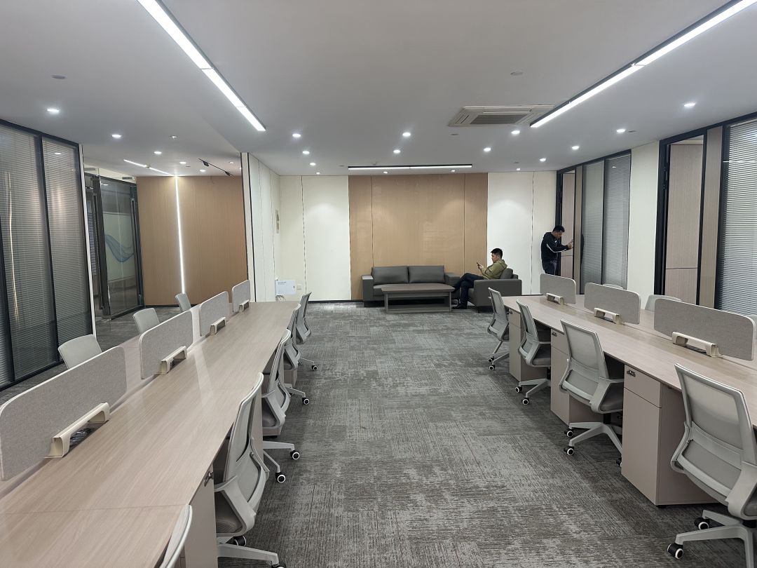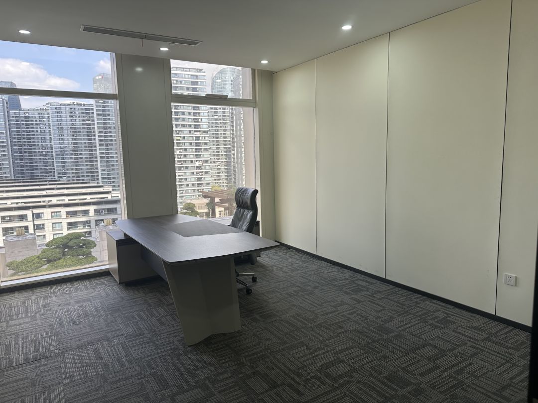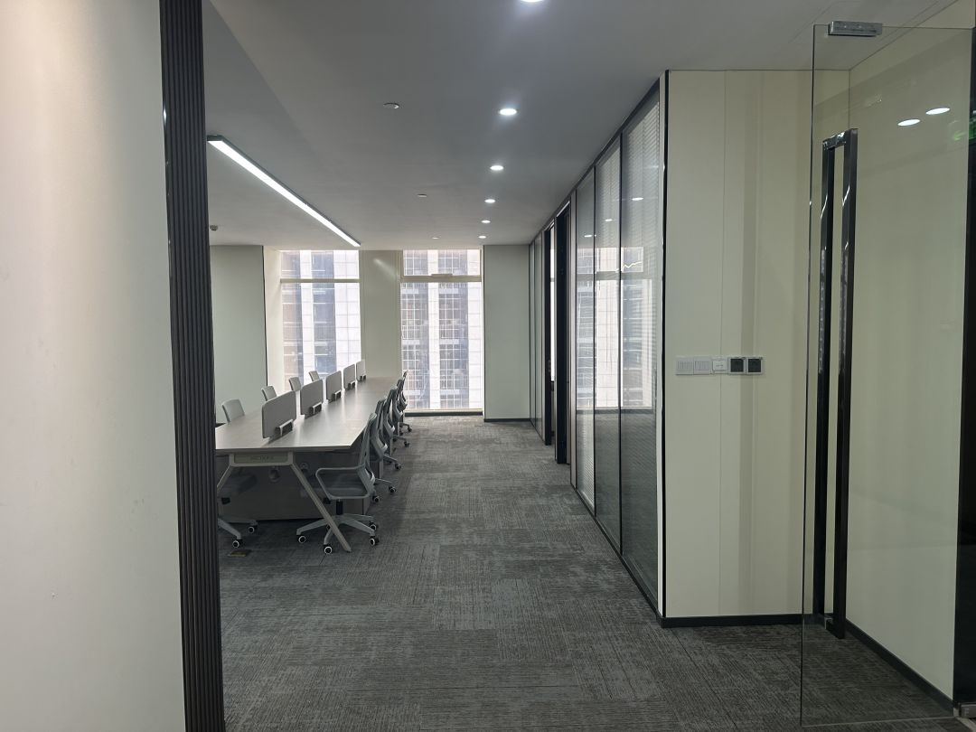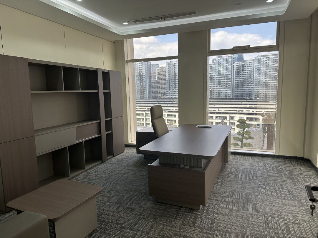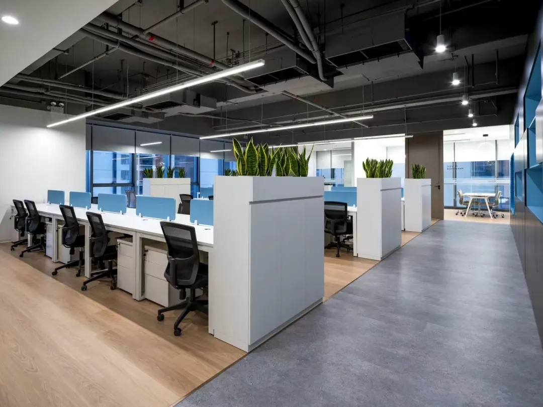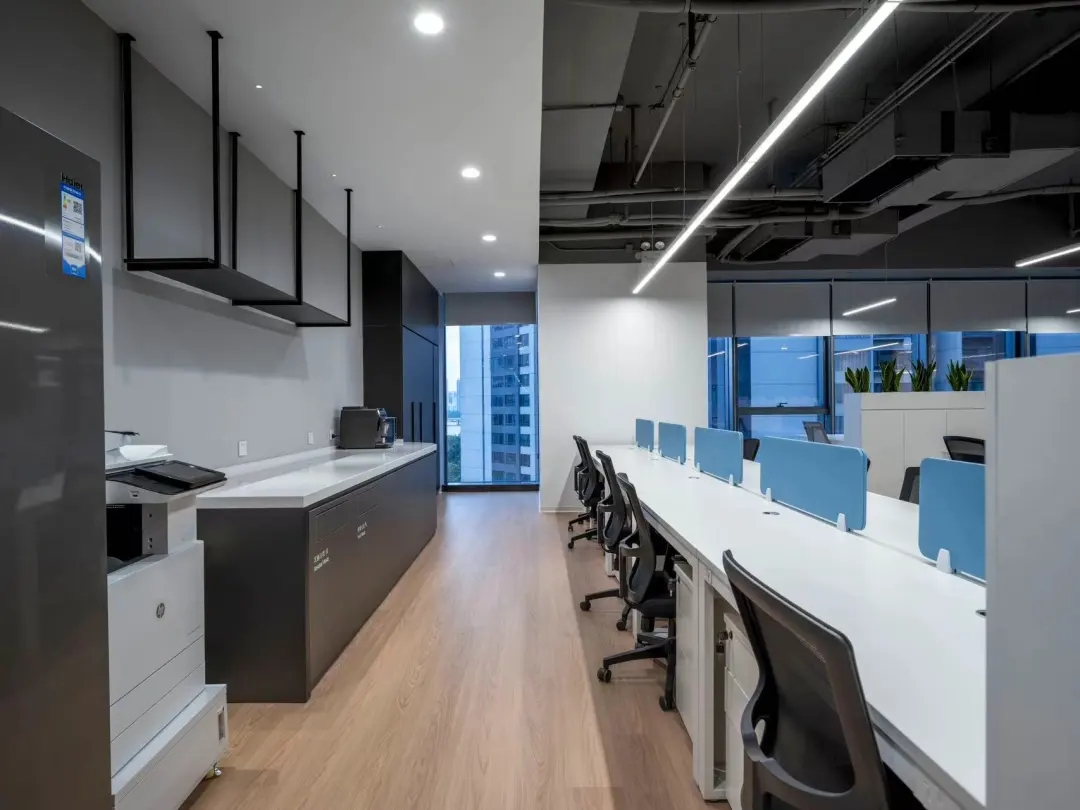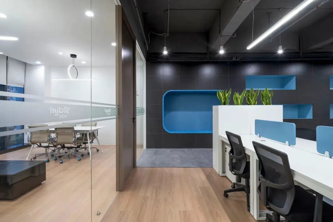 家具选择体现简约实用理念,如黑色皮质座椅和金属框架茶几。装饰细节上,没有过多繁杂装饰,保持简洁风格。这种设计让整个办公室散发出独特的现代工业风魅力,空间与光线完美融合,给人带来一种既时尚又实用的办公环境体验