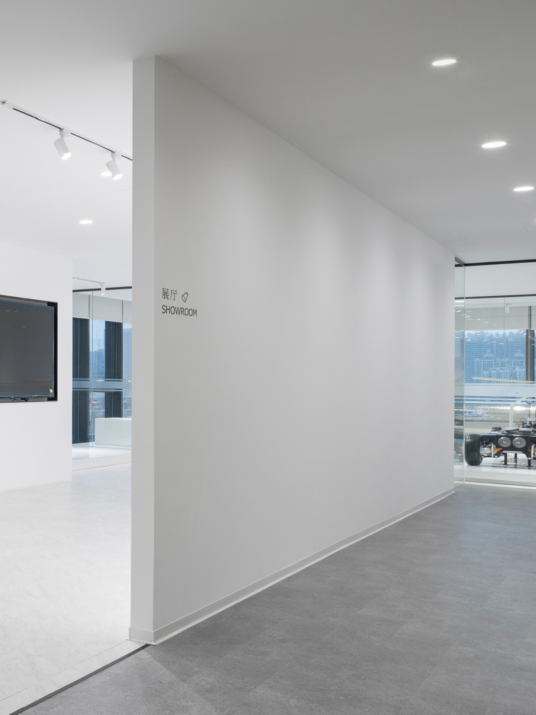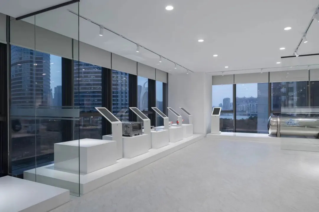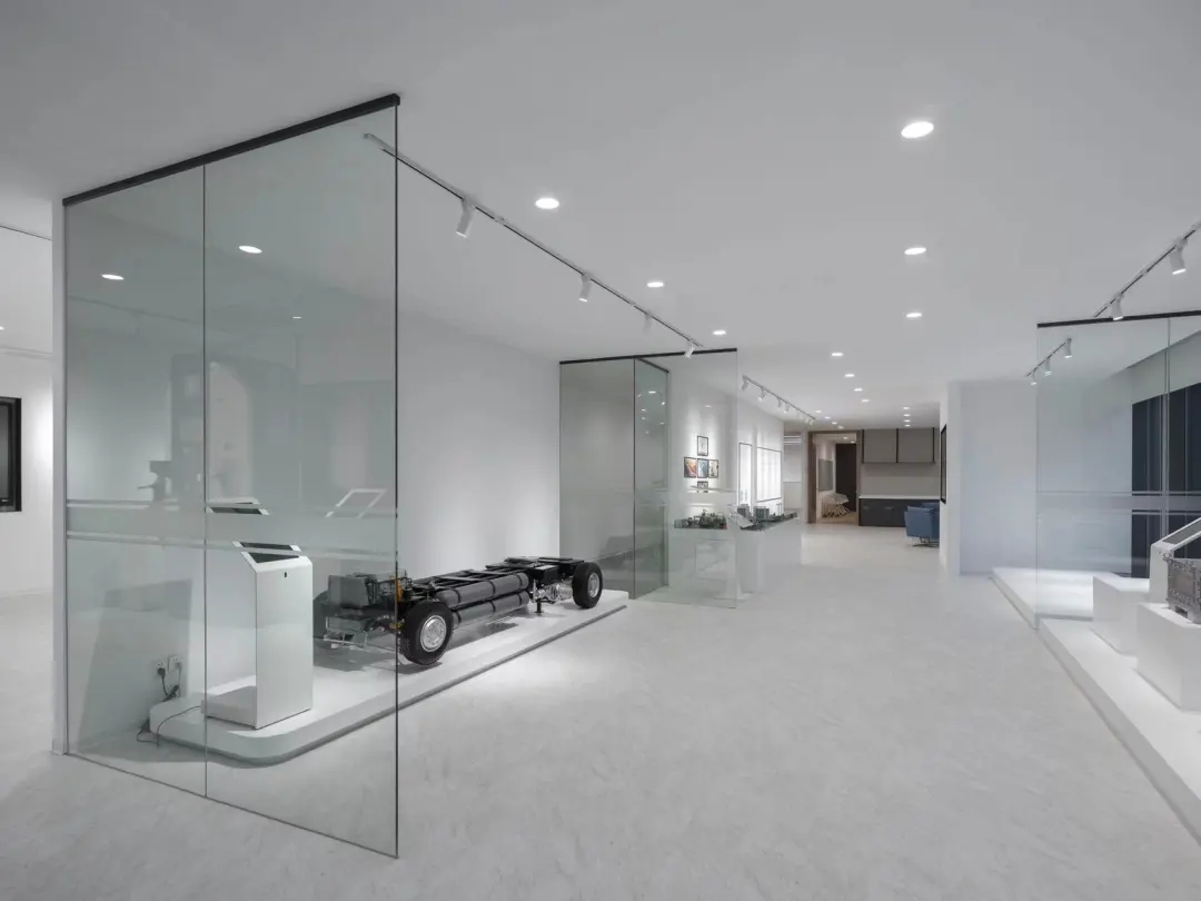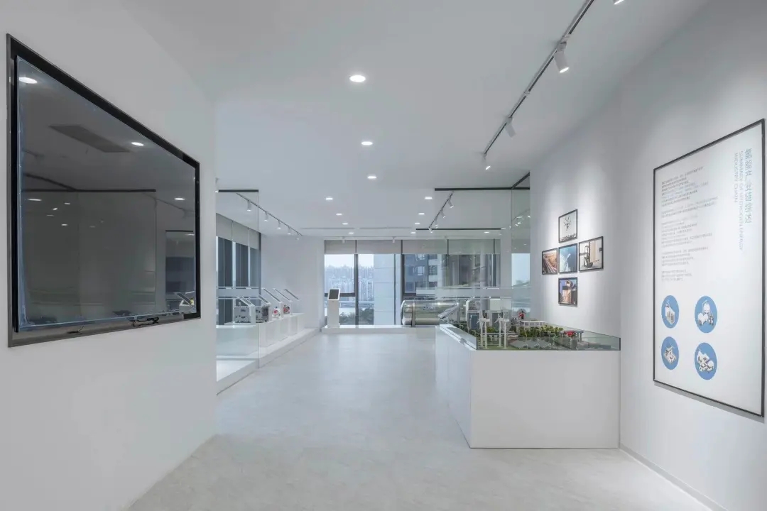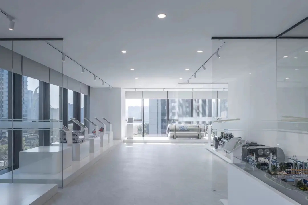 展厅整体风格以开敞明亮为主,贯穿的线条强调了思想上的前进与探索。较大面积的留白,满足了未来的发展需求,也方便随时增加展台新产品。玻璃和金属元素的加入,使室内平面与通透的立面相呼应,增加了空间的体量感,力求为空间的「科技」氛围再添一笔。在充分了解海珀特公司的背景和历史后,设计围绕其核心产品内容,对展厅区域的浏览动线进行了规划,使其呈现出具有导向性的适度线性路径:公司整体介绍—核心技术一对一介绍—核心技术的存储与运输展示—未来展望与合作企业介绍。这样的动线排布不仅能引领观众,也能让其对海珀特公司的高新技术建立更全面的了解。