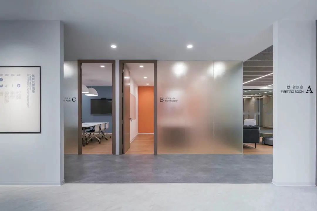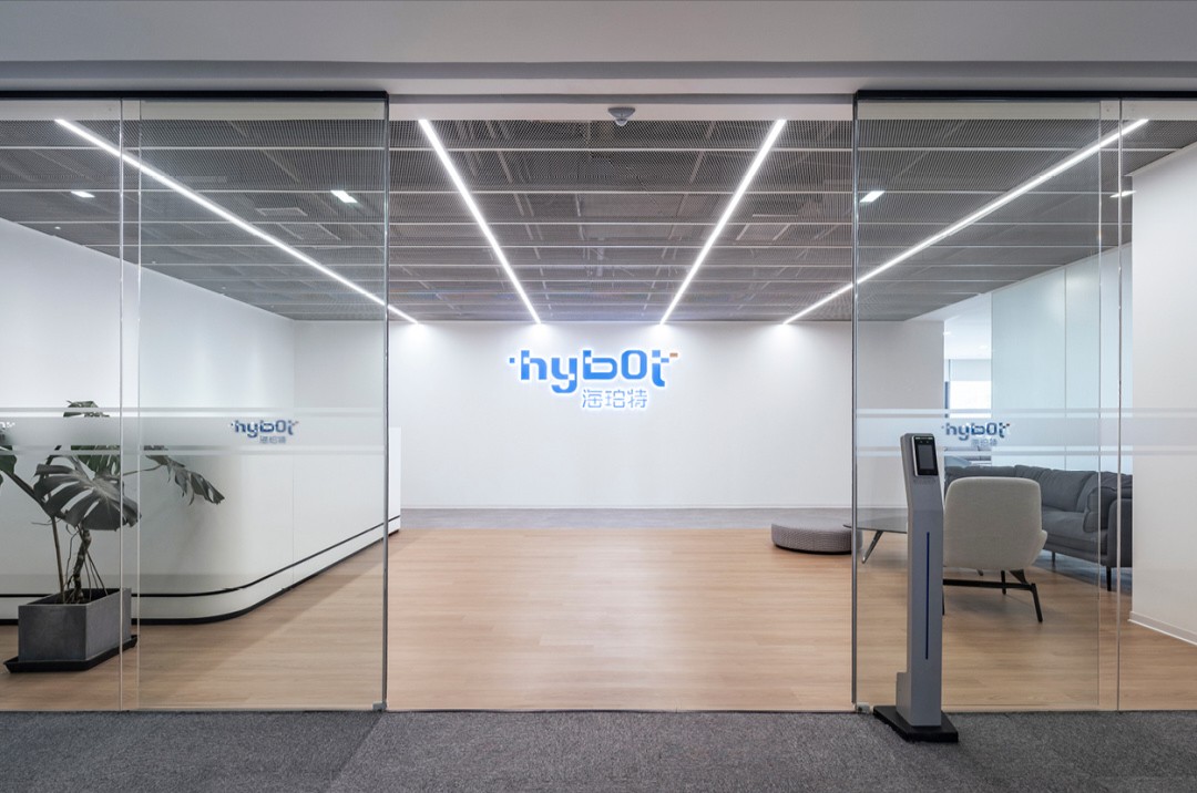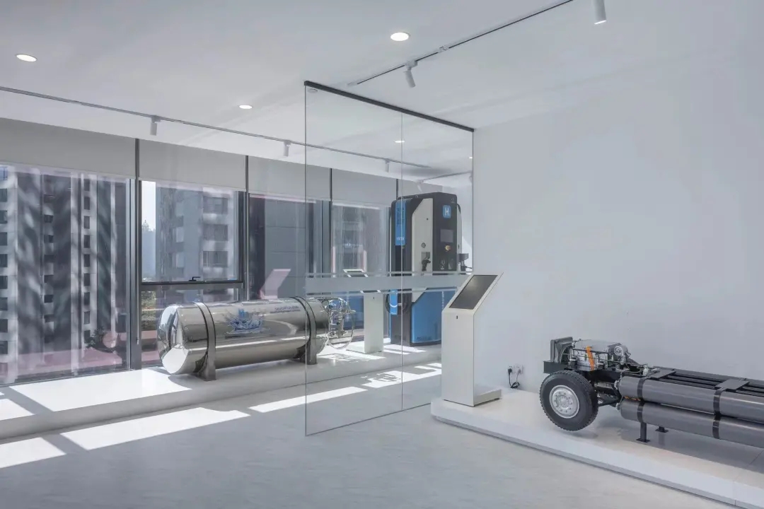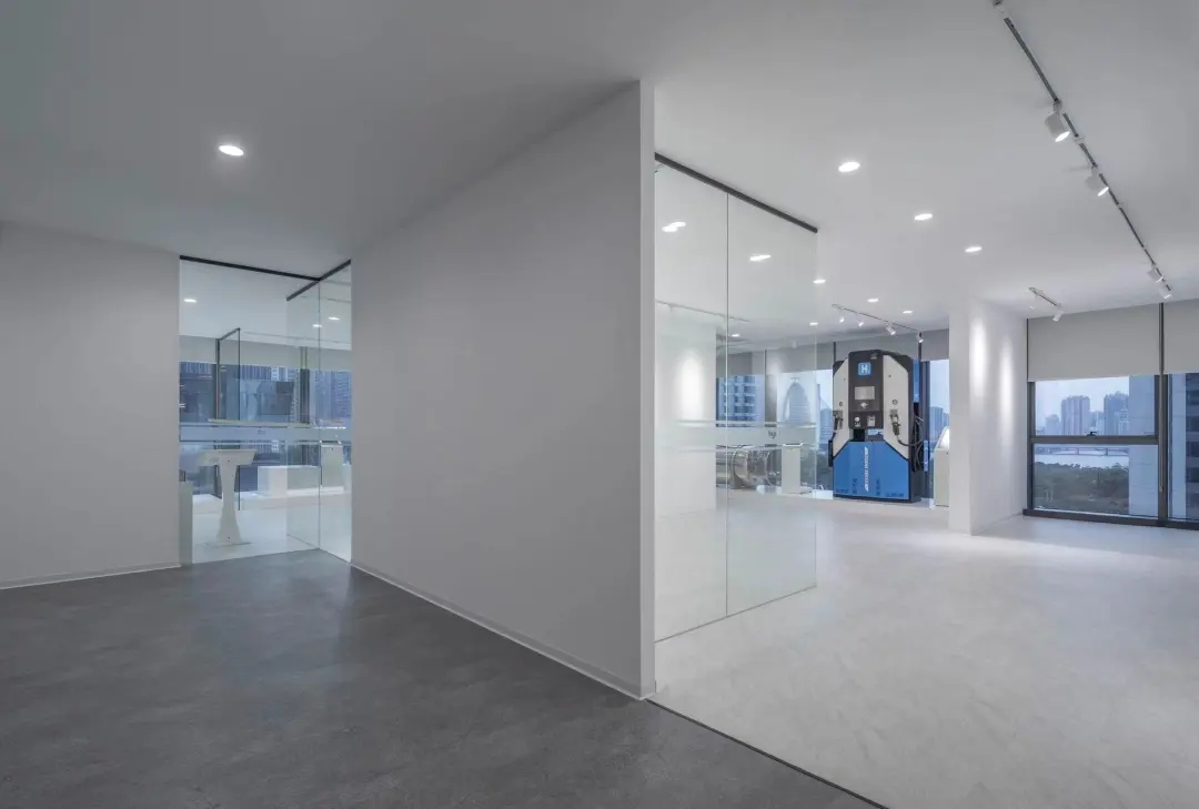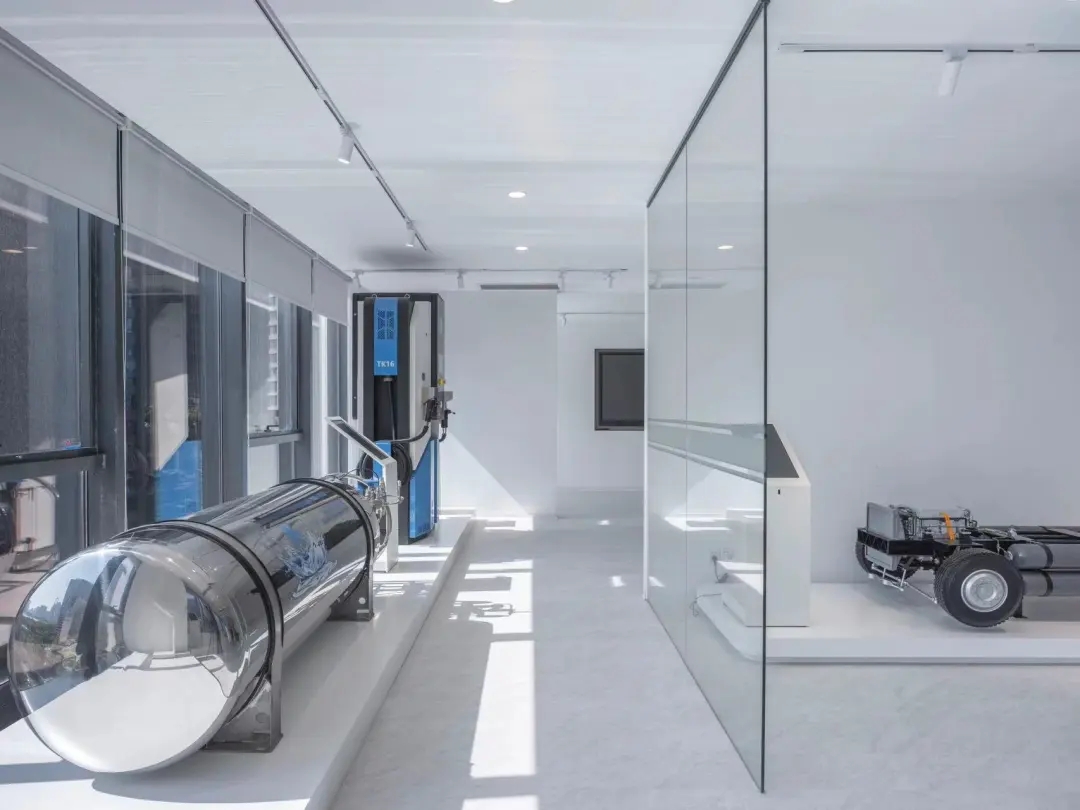 展厅整体风格以开敞明亮为主,贯穿的线条强调了思想上的前进与探索。较大面积的留白,满足了未来的发展需求,也方便随时增加展台新产品。玻璃和金属元素的加入,使室内平面与通透的立面相呼应,增加了空间的体量感,力求为空间的「科技」氛围再添一笔。在充分了解海珀特公司的背景和历史后,设计围绕其核心产品内容,对展厅区域的浏览动线进行了规划,使其呈现出具有导向性的适度线性路径:公司整体介绍—核心技术一对一介绍—核心技术的存储与运输展示—未来展望与合作企业介绍。这样的动线排布不仅能引领观众,也能让其对海珀特公司的高新技术建立更全面的了解。