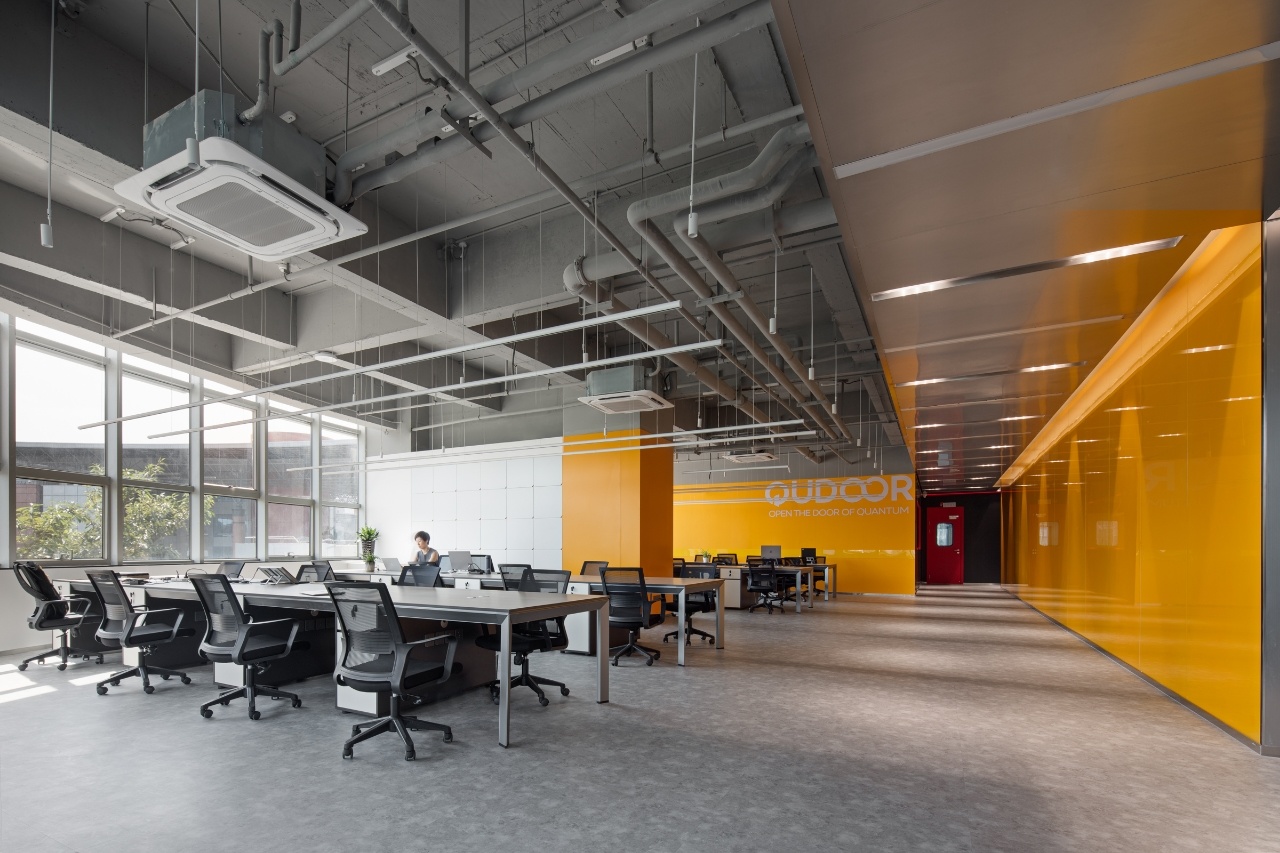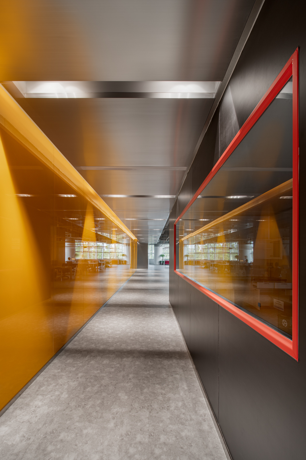 办公区的一抹亮黄背景墙,瞬间点亮整个区域,使员工心情愉悦;办公室的绿色大地毯,在划分空间的同时,为员工带来视觉上的舒畅与活力;公区更是色彩的聚集地,过道尽头的红色的大门搭配上蓝色背景墙,创意与灵感也在此肆意碰撞