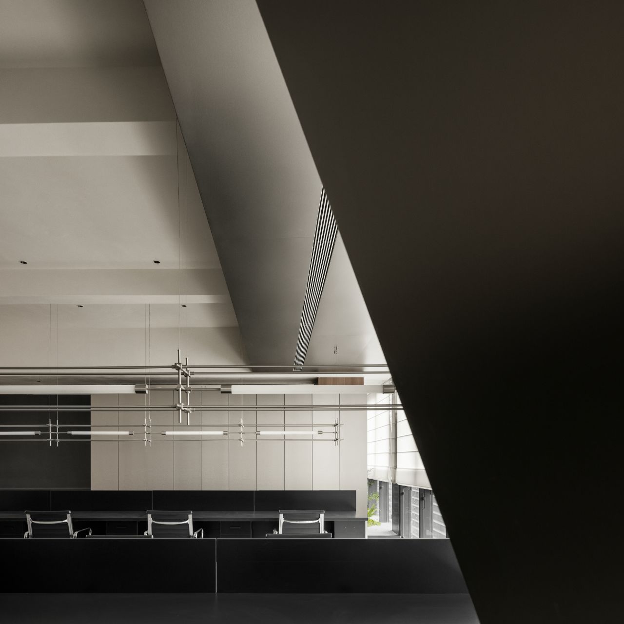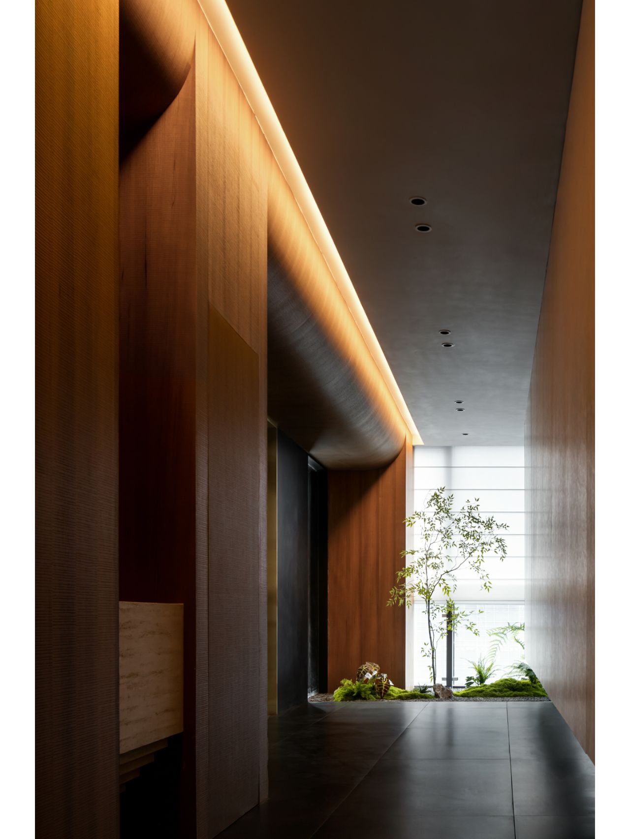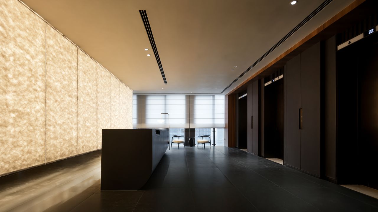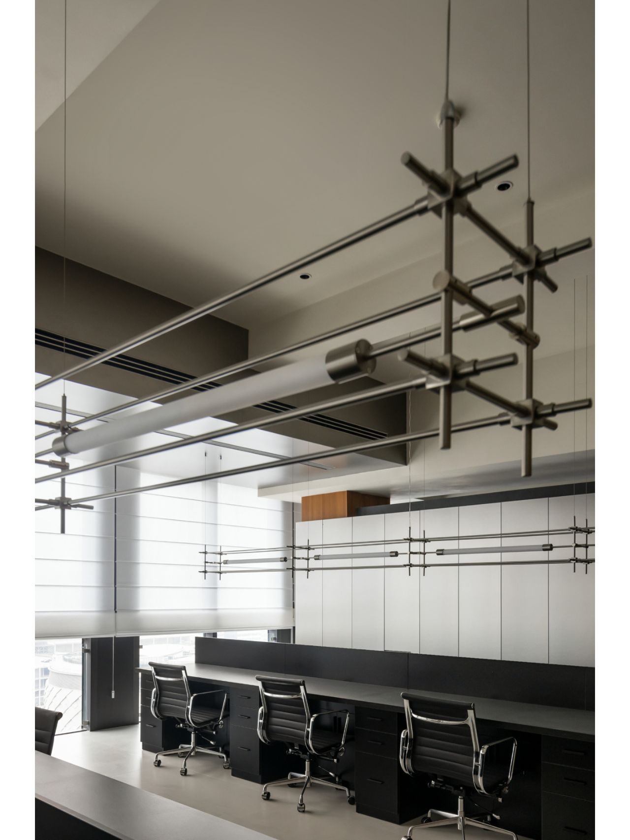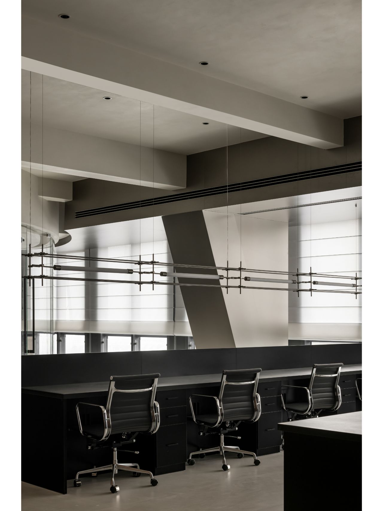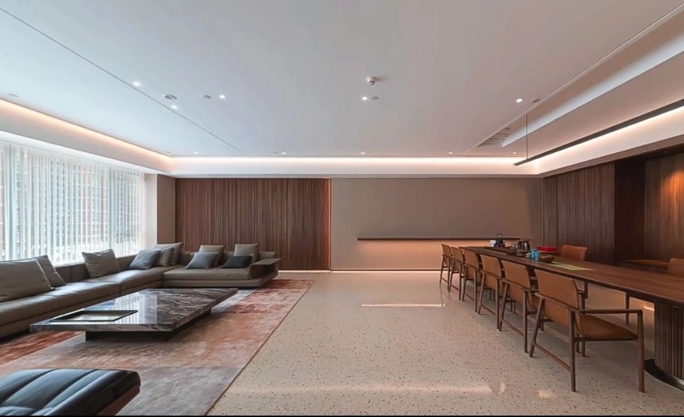 空间整体采用现代简约的装饰风格,以明快的灰白调为主。选用了大量石材、原木等天然元素,与玻璃、金属等材料相结合,同时根据空间功能,辅以红、橙、黄等色彩与植物,为空间注入生机和活力。办公空间兼顾通透性与实用性,将律师的工作场景与现代都市生活有机融合。会议接待层主要展现了企业形象,印制在接待前台大理石上的印章,系著名书法篆刻家作品,于无声中传达出一份富有温度的信任,一份沉甸甸的责任与承诺于方寸之间,讲述着企业的理念,法治兴邦,知行于信,大道向阳。该楼层设置有大小不一、功能多样的会议室,可以满足多样化的工作场景与使用需求。头脑风暴室,配置了富有创意的办公设施,构筑了一个流动交互、多模式的弹性空间。VIP会议室,家具及陈设典雅、考究,全方位匹配来访者的尊贵身份,并在私密性等方面具有十分严格的要求。董事会议室主要用于开展较高规格的双边会议及洽谈等场景。花园走廊是一处开放的自由交流空间,开敞与通透的布局,玻璃墙的应用,最大限度地增加了工作区和休息区的阳光洒入,窗边望去,可以看见上海传统的石库门里弄和摩登的现代建筑交汇融合。在花园长廊末端,是一间讲述着东方美学的茶室,人们在这里品茗、论道。在接待吧台与等候区,营造了一处具有温度的空间,来宾可以于繁忙的工作中感受那一缕独属的阳光。等候区的另外一侧,是四合一多功能培训室,培训室的功能和大小可以由使用者自由定制。在封闭与开放之间,空间的使用变得灵动且高效。从三五个人的会议交流,到几十人的学习培训,再到上百人的论坛活动,都可以定制化开展。