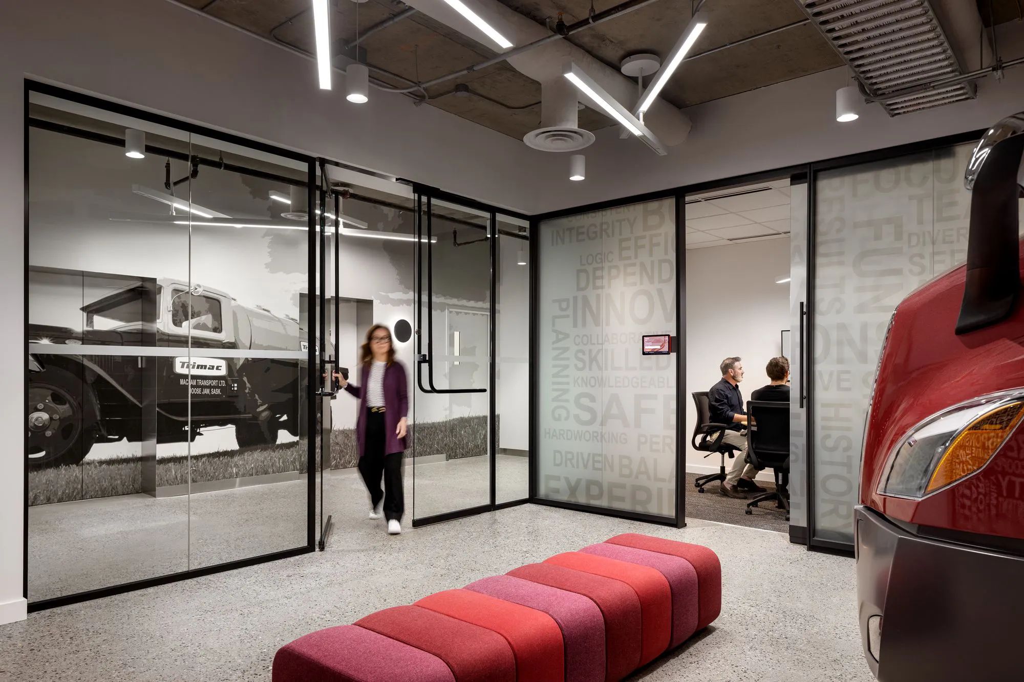该办公室采用了多种独特的设计元素,彰显了 Trimac 的传统和价值。迎接访客的是一个半挂卡车的前端装置,这是对今天行驶在路上的 Trimac 卡车的直接致敬。Trimac 员工所坚持的信念和原则在入口附近面向客户的特色墙上醒目地展示出来,充分体现了公司之所以成为理想工作场所的原因。车牌艺术特色展示了从北美各地收集的复古车牌,象征着公司广泛的地理覆盖范围。