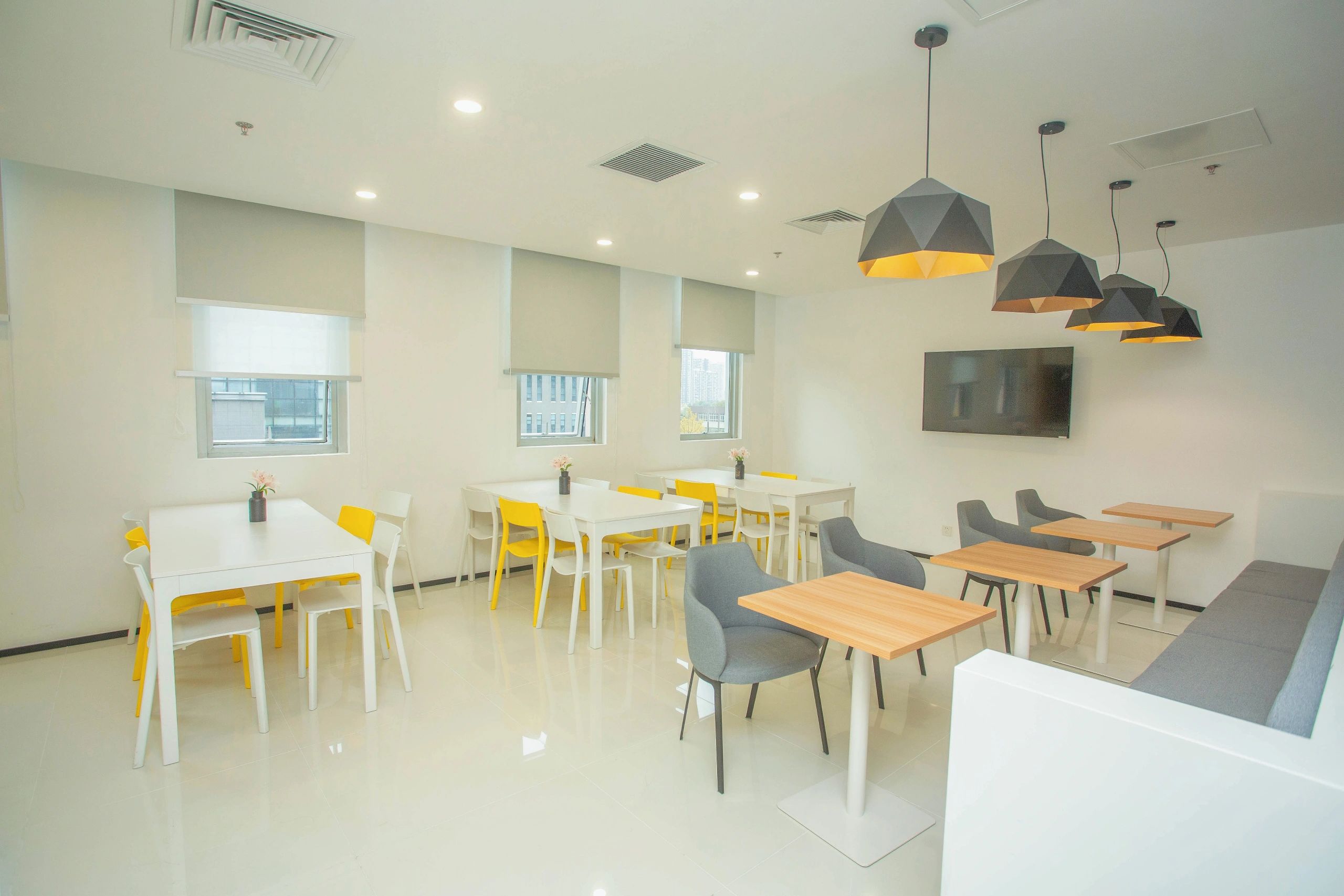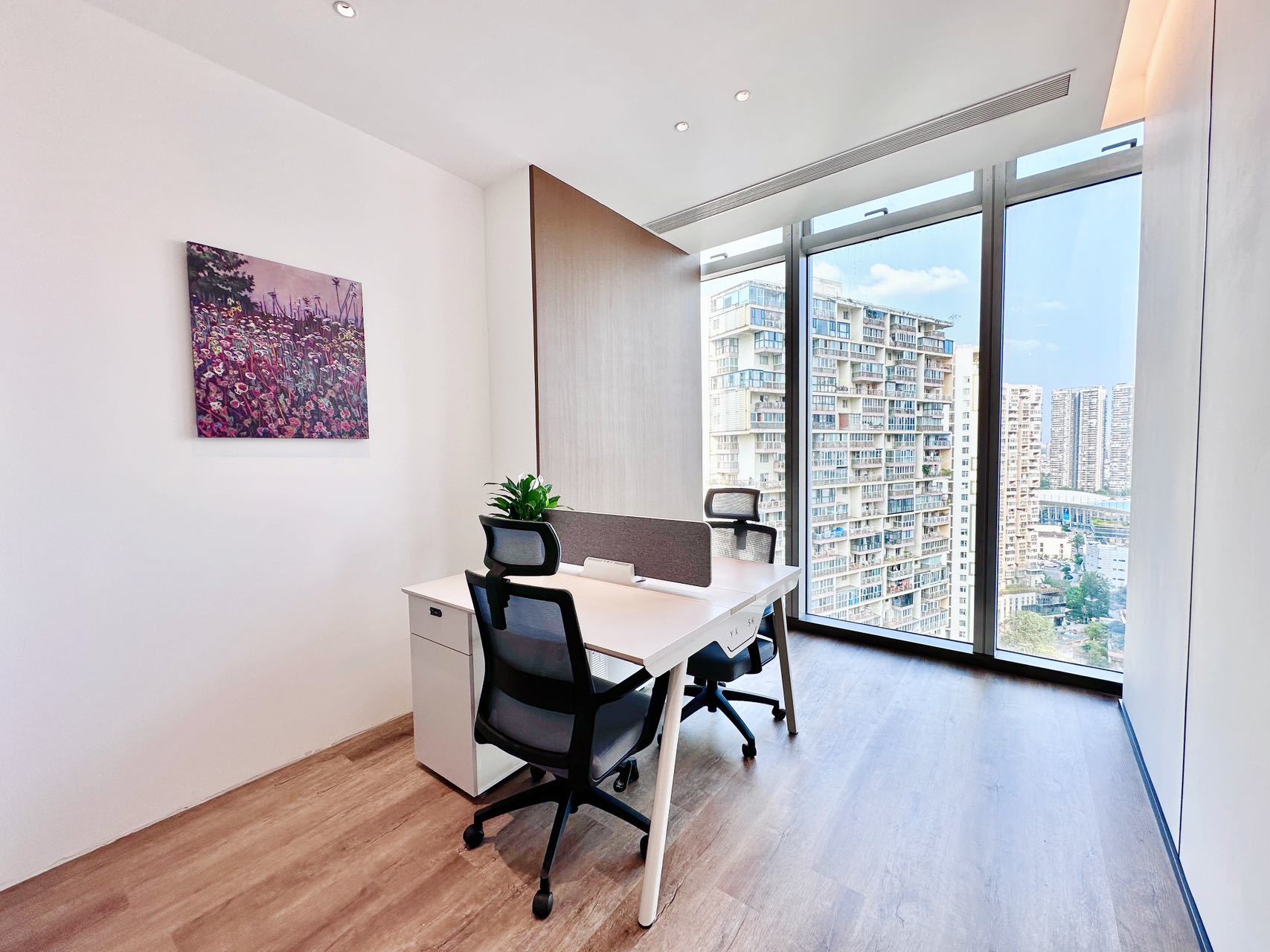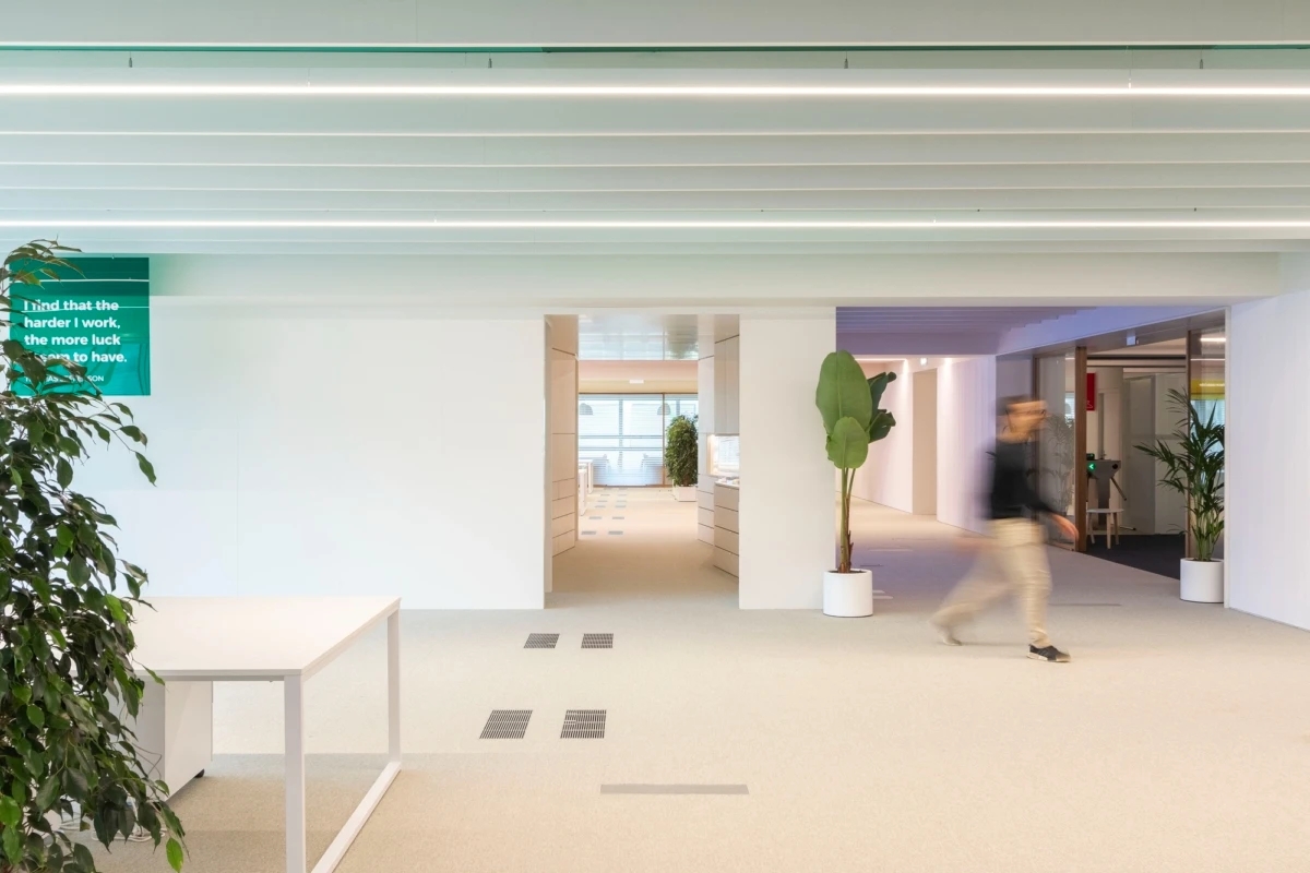 360 IMPRIMIR公司的办公室采用了开放式空间设计,三面开窗的布局使自然光充分照射进来,为工作提供了良好的光照条件。这种开放性不仅有助于增强团队合作与沟通,同时也提升了整体的工作效率。大面积的分隔走廊则在不同功能区之间提供了合理的流动性,使得卫生间、储藏室和技术区域等设施得以有效整合。项目的设计理念从综合印刷和空间元素出发,通过不同密度和纹理的平面构成,象征着多样化的印刷媒体。以白色为基础色的空间传递出宁静与和谐的氛围,同时巧妙地运用光与影的变化,营造出一种永恒的视觉体验。底色上的潘通360色彩则为空间注入了活力和时代感,突显出公司的创新性与个性。