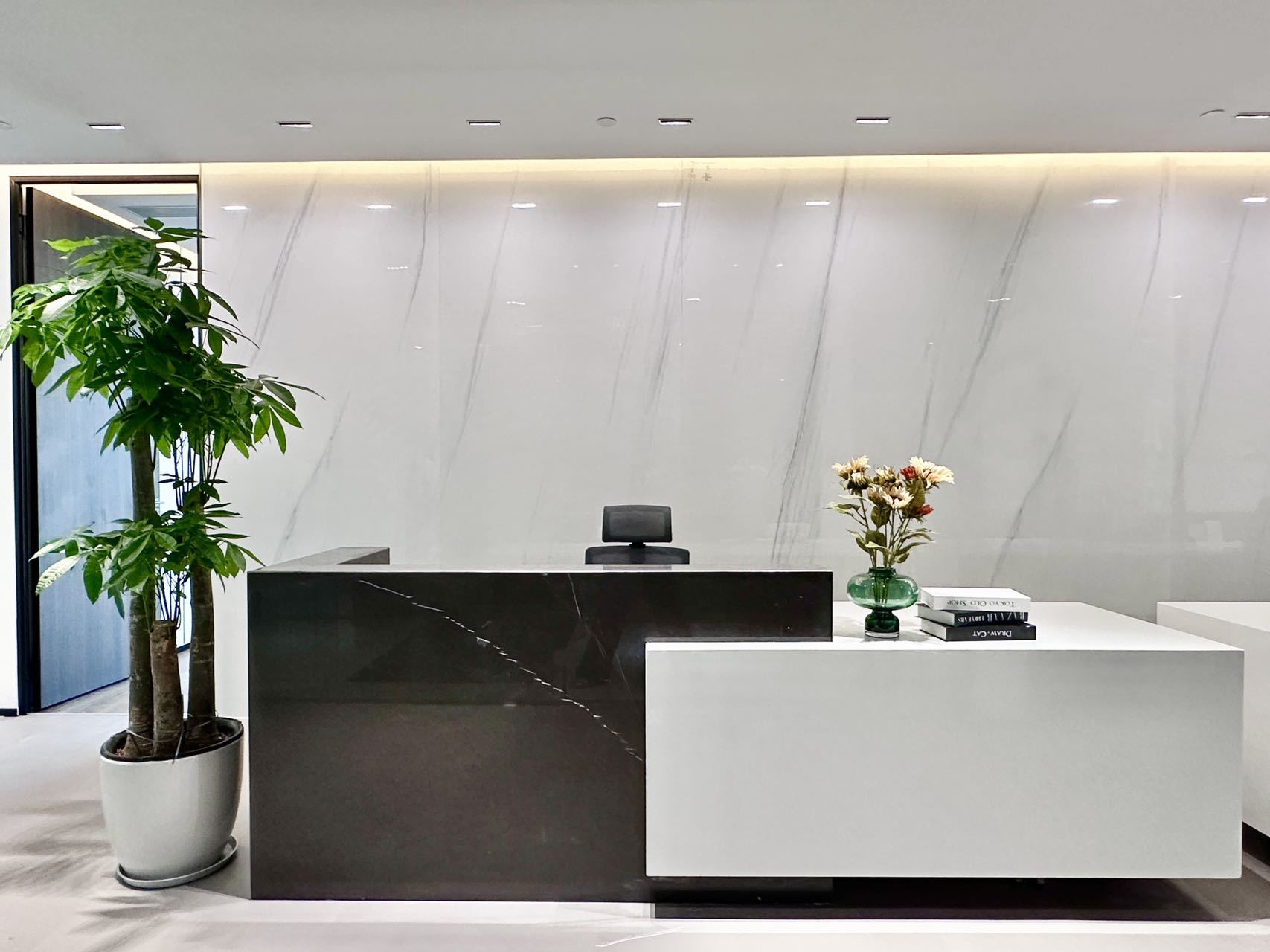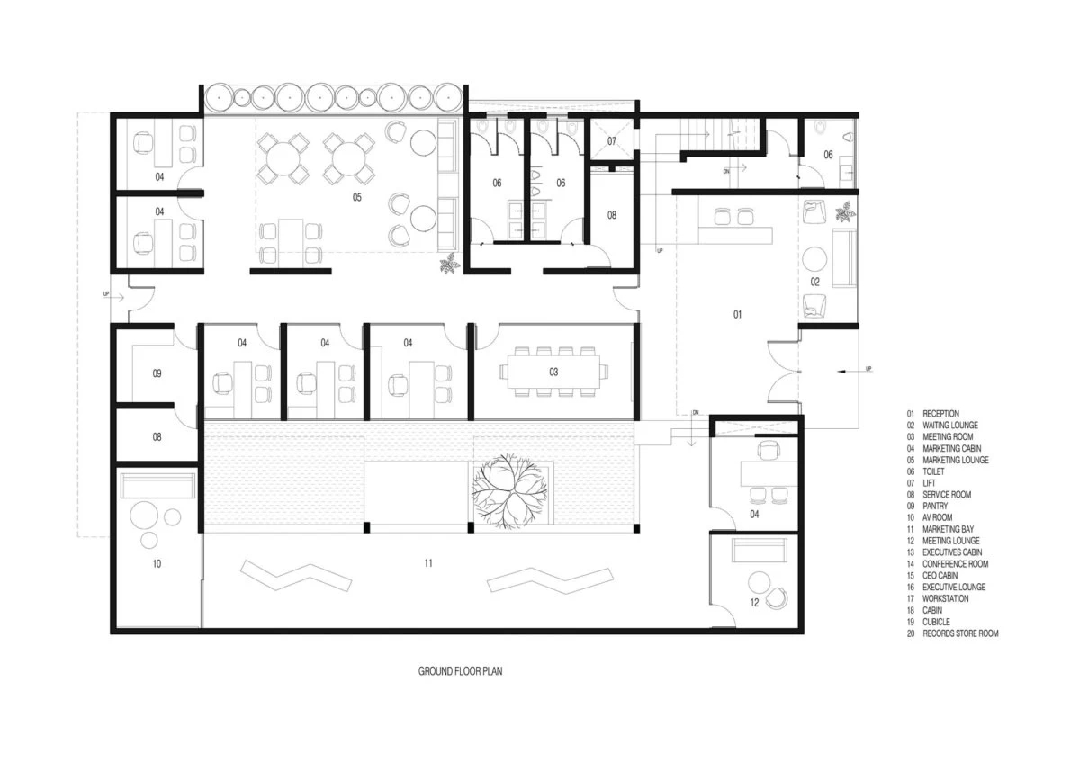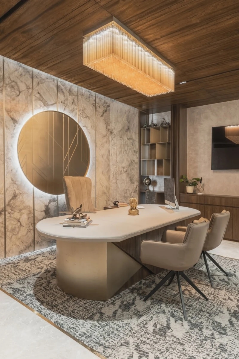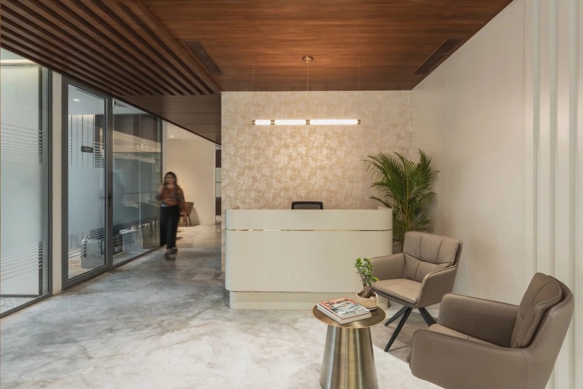 接待区的中心,是一个引人注目的面形接待台。这个接待台本身就是一个建筑宣言,其大胆的几何形状与光影交织,形成了一幅动人的画面。桌子的线条干净利落,与空间的无缝融合,体现了整体设计理念中的精确与克制。游客在这里不仅能够感受到公司的热情与专业,更能深刻体会到建筑设计的魅力与力量。一楼除了接待区外,还为行政办公室提供了更加私人和亲密的体验。这些办公室以精心制作的内饰为特色,优先考虑豪华与功能的完美结合。在这里,设计呈现出更加安静、更加精致的色调,柔和的照明、优雅的家具和高品质的饰面共同营造出一种宁静而高雅的工作氛围。从公共到私人的过渡在这里是无缝的,但开放性和物质性始终保持不变,确保了建筑语言的连续性,使得整个一楼空间既统一又富有层次感。