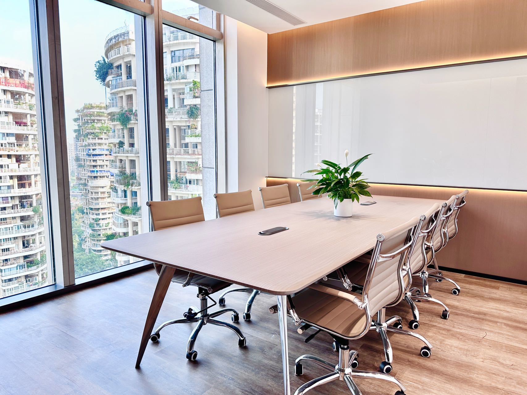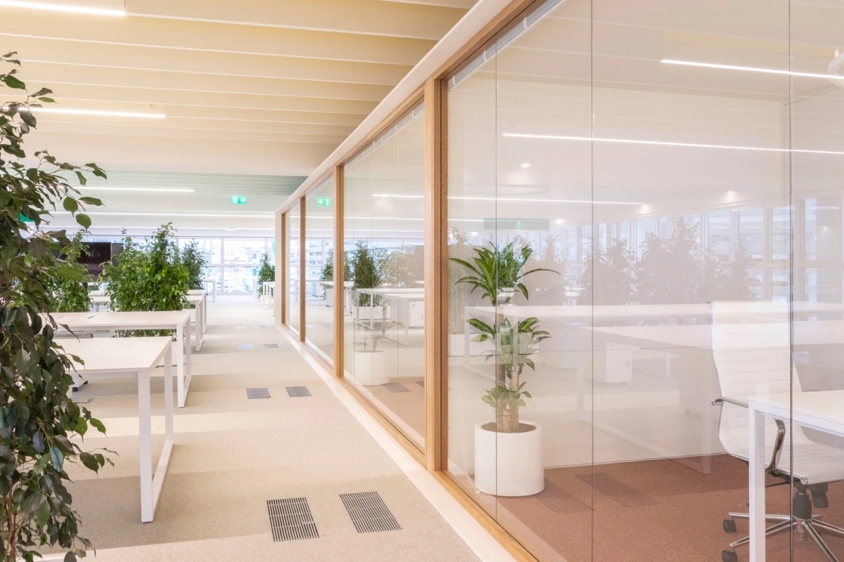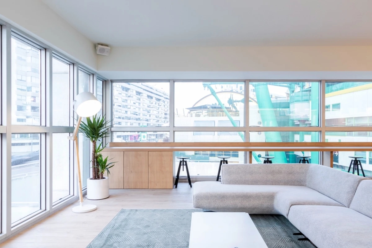 在材料选择上,办公室采用了丰富的色调与质感。橡木的运用,如隔板和家具,不仅增强了空间的温暖感,还提升了整体的质量感。与此同时,渐变与半透明的材料,如丙烯酸元素,则引入了现代科技的视觉效果。这些设计元素的结合,不仅呈现出一个优雅而简约的空间,还反映了360 IMPRIMIR公司的企业形象和地位。