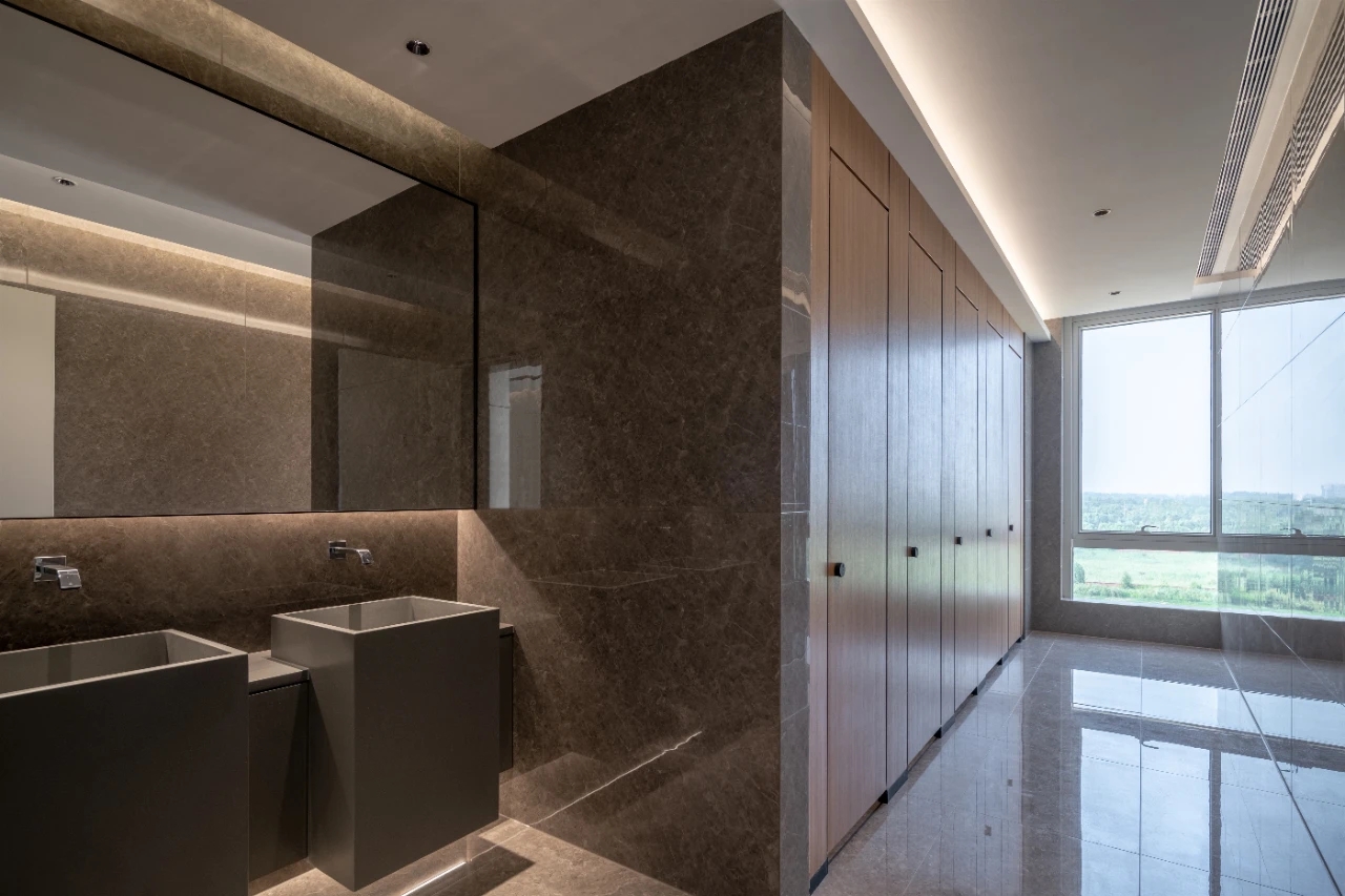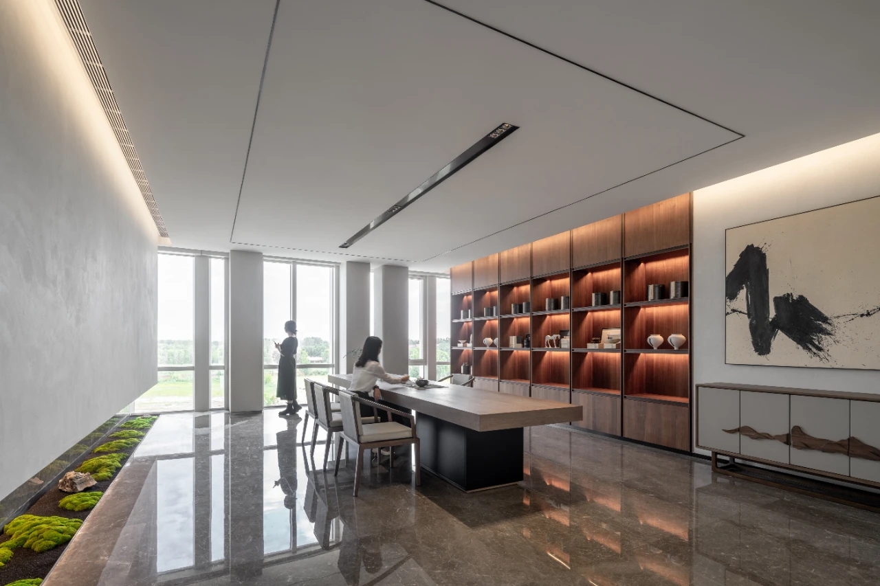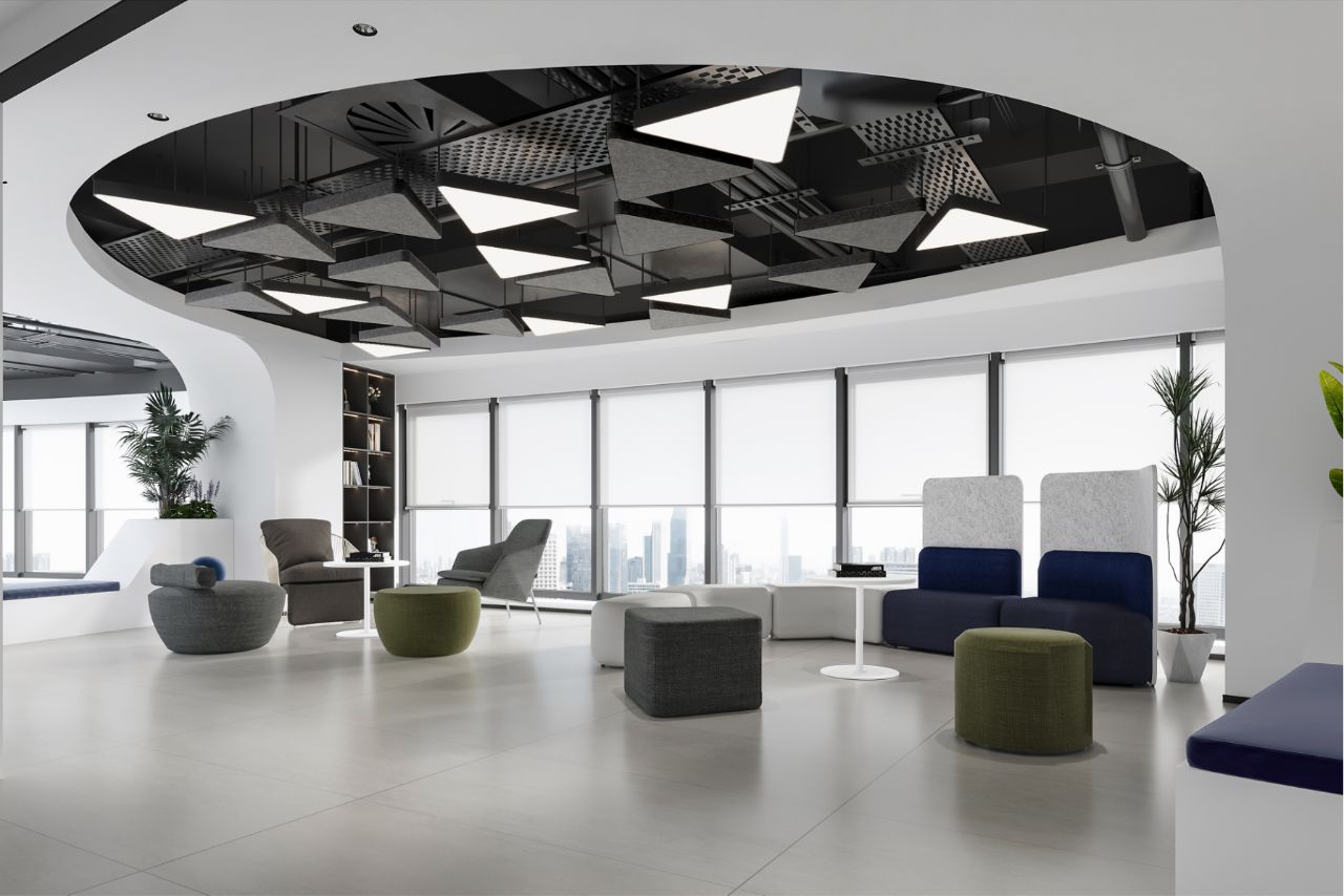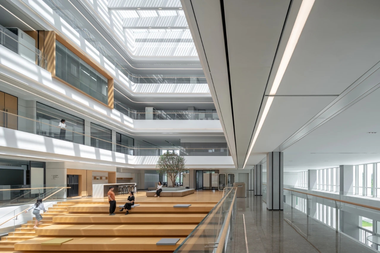 这里充满朝气、与自然和谐共鸣。设计团队通过动态元素、色彩搭配、质感选材和连通性的变化,展现出办公空间变革的无限潜力。宏兴的企业文化与场所交织,铺陈出一篇关于活力、联结和可持续的故事。