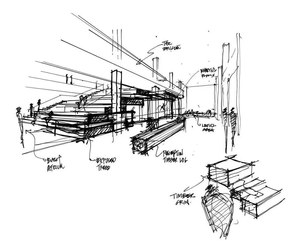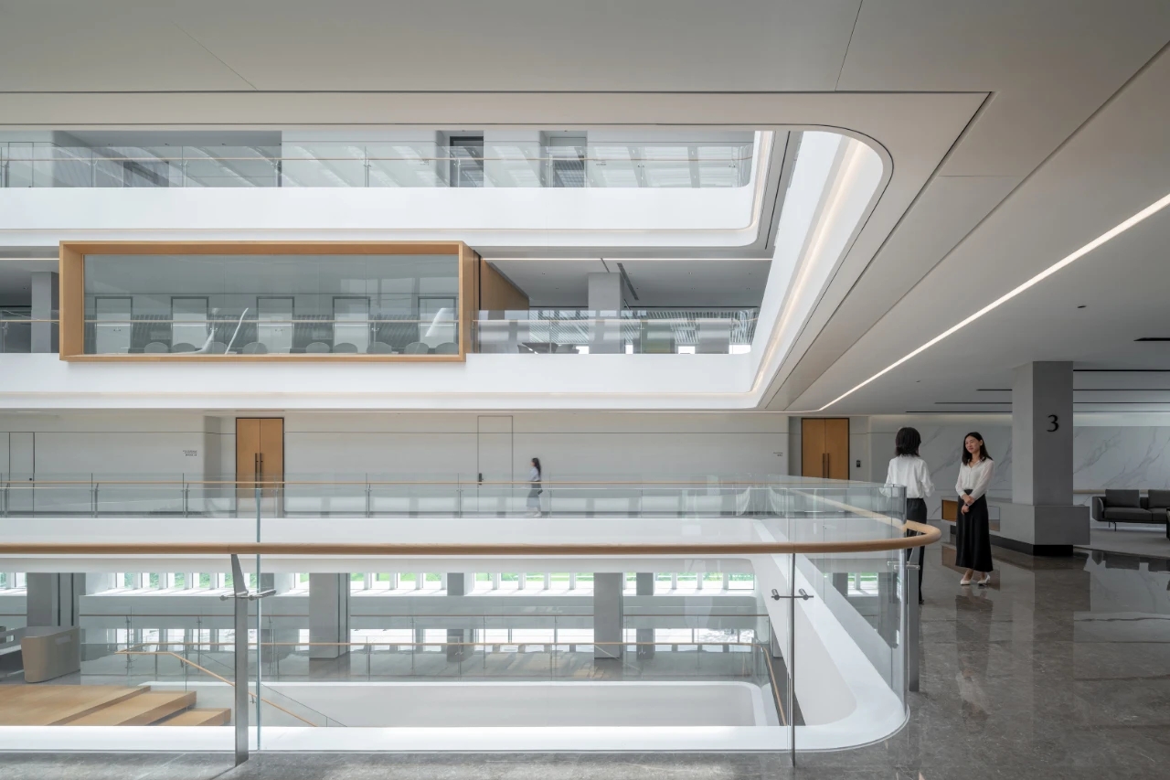 设计“以人为本”,采用了自然与开放的理念,将户外的自然美景引入室内,模糊了自然与建筑环境的界限。整体空间由此明亮通透,呈现出一种充满活力且健康的氛围。从等候休息室向外望去,质朴而精致的家具与室外自然景观浑然一体。中庭作为一个垂直的连接通道,巧妙地将不同的功能空间串联起来,促进了公共与私密区域之间的和谐流动。景观楼梯与结构柱共同构成了一个独特的迎宾区域,其间错落有致地分布着不同功能的体块。中庭周围和景观楼梯旁的“木制会议盒”不仅增强了建筑的美感,也清晰地划分出不同的功能区域。多功能开放区域开阔的视野,也让员工能够充分享受周围自然景观的壮美。